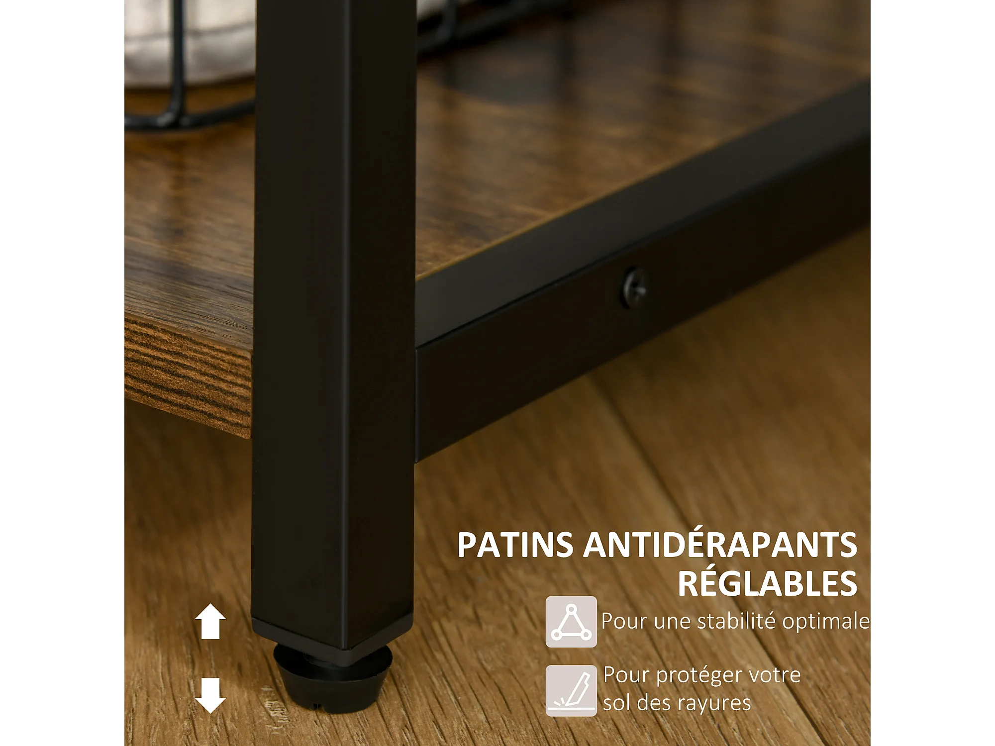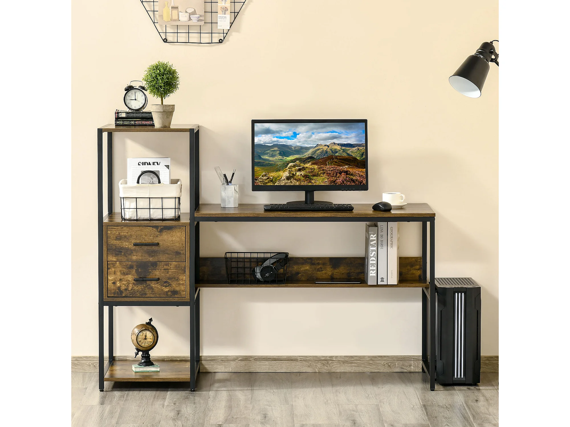 Bureau informatique design industriel avec bibliothèque 3 étagères 2 tiroirs panneaux particules aspect vieux bois métal noir
