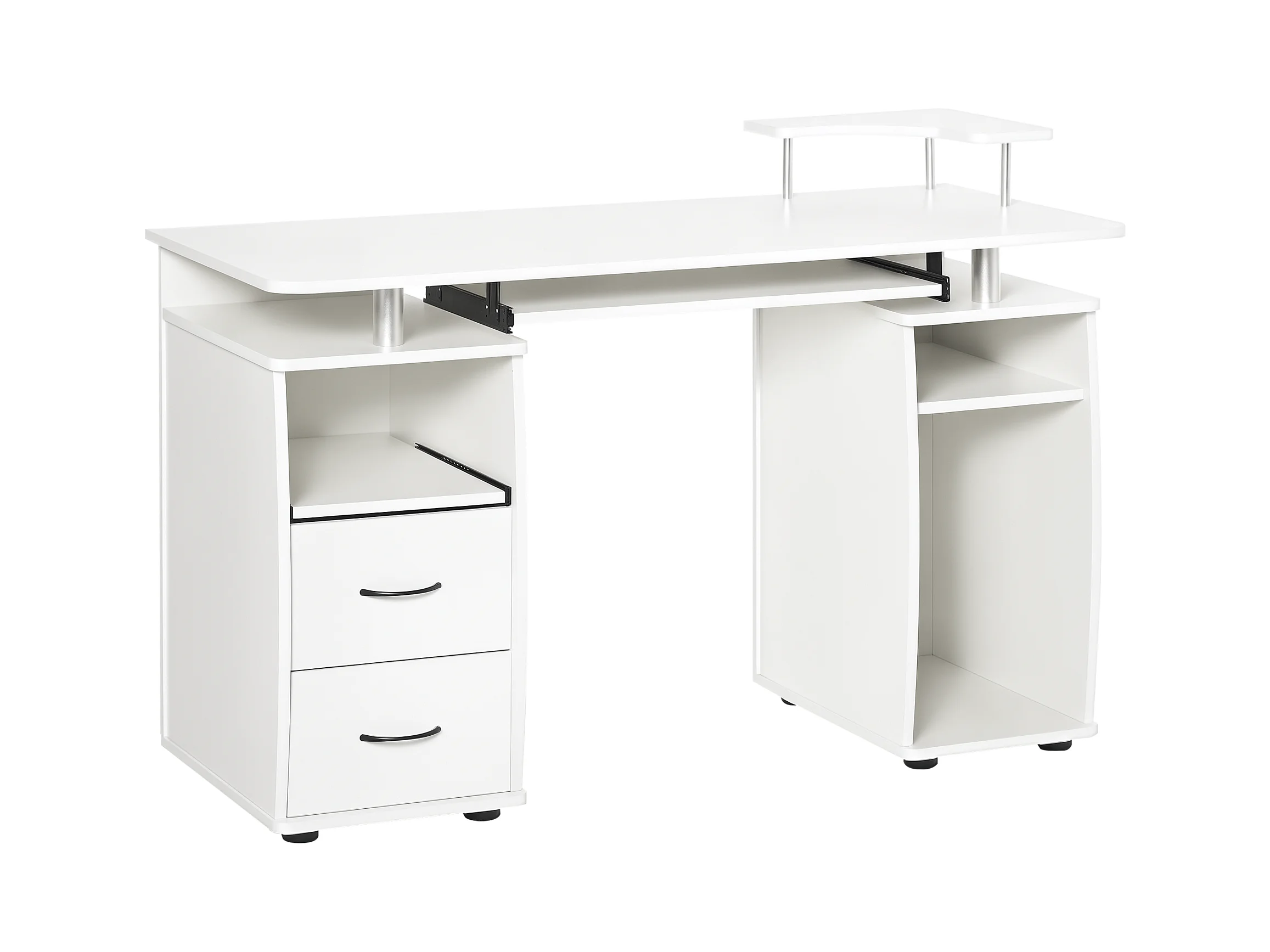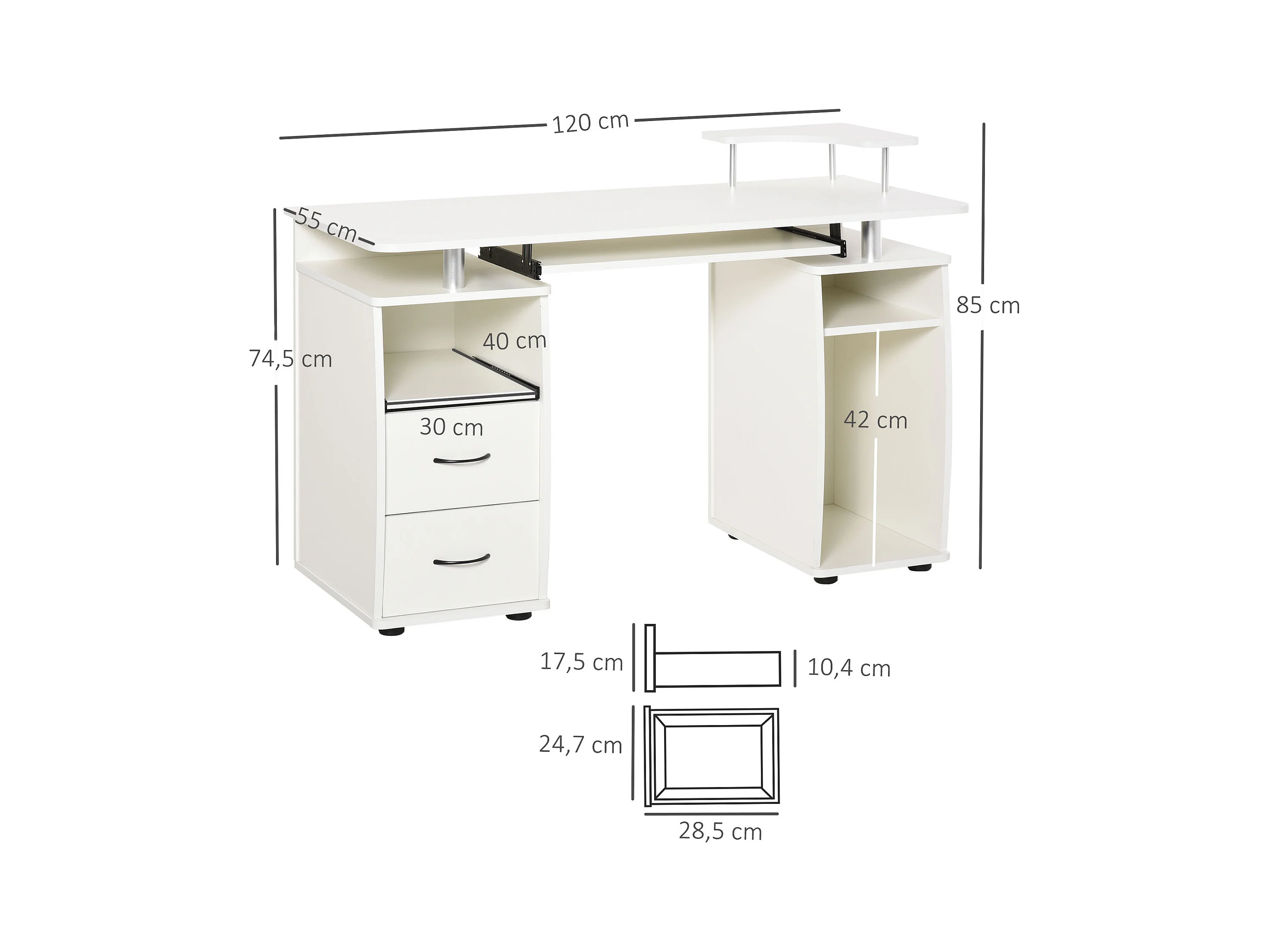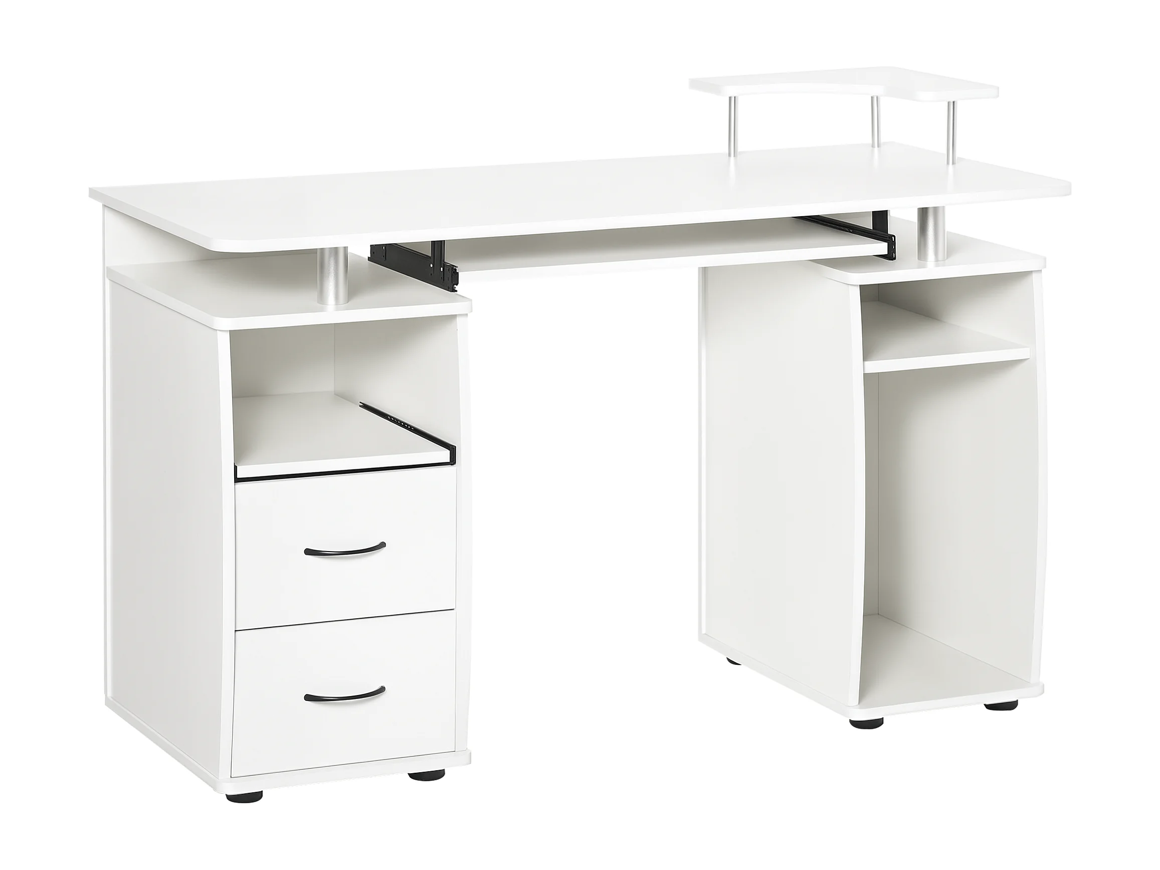 Bureau Informatique Table de Bureau en MDF pour Ordinateur Multi-Rangements avec Tablette Imprimante, Tablette à Clavier Coulissante, 2 Tiroirs 120x55x85cm Blanc