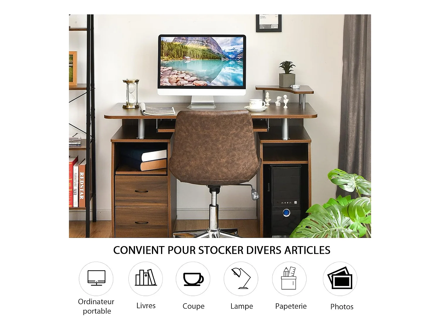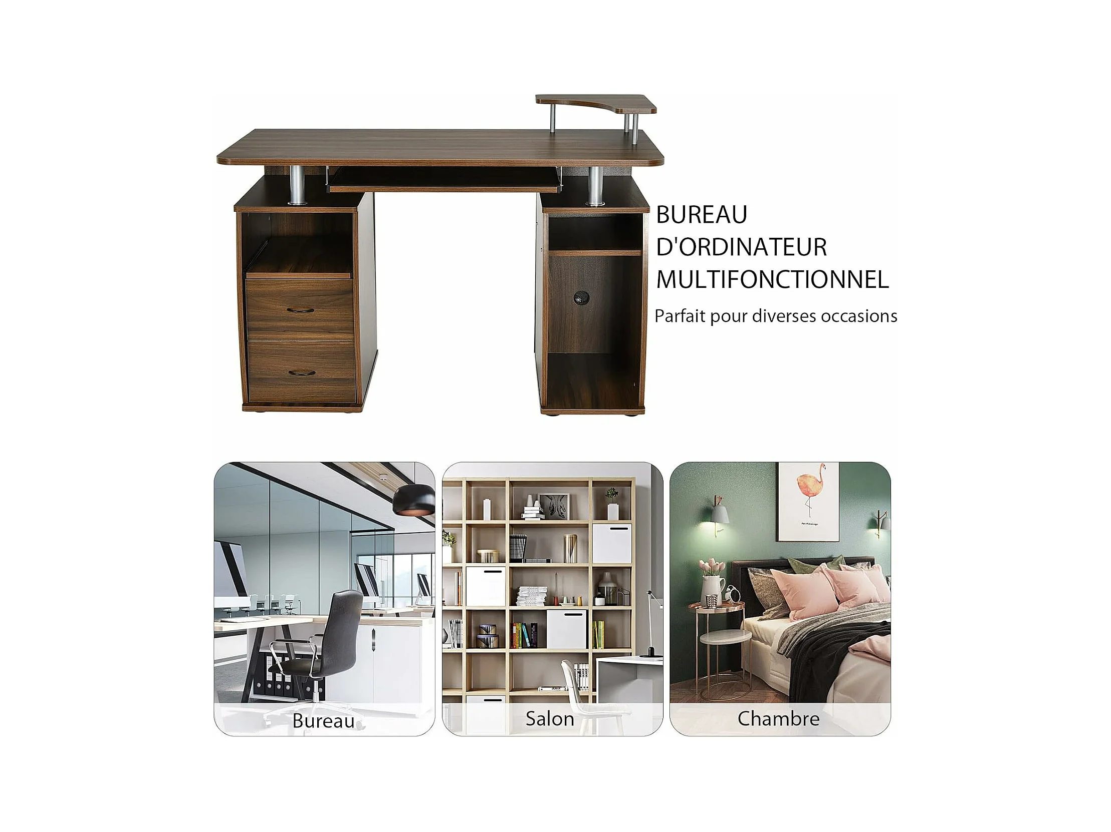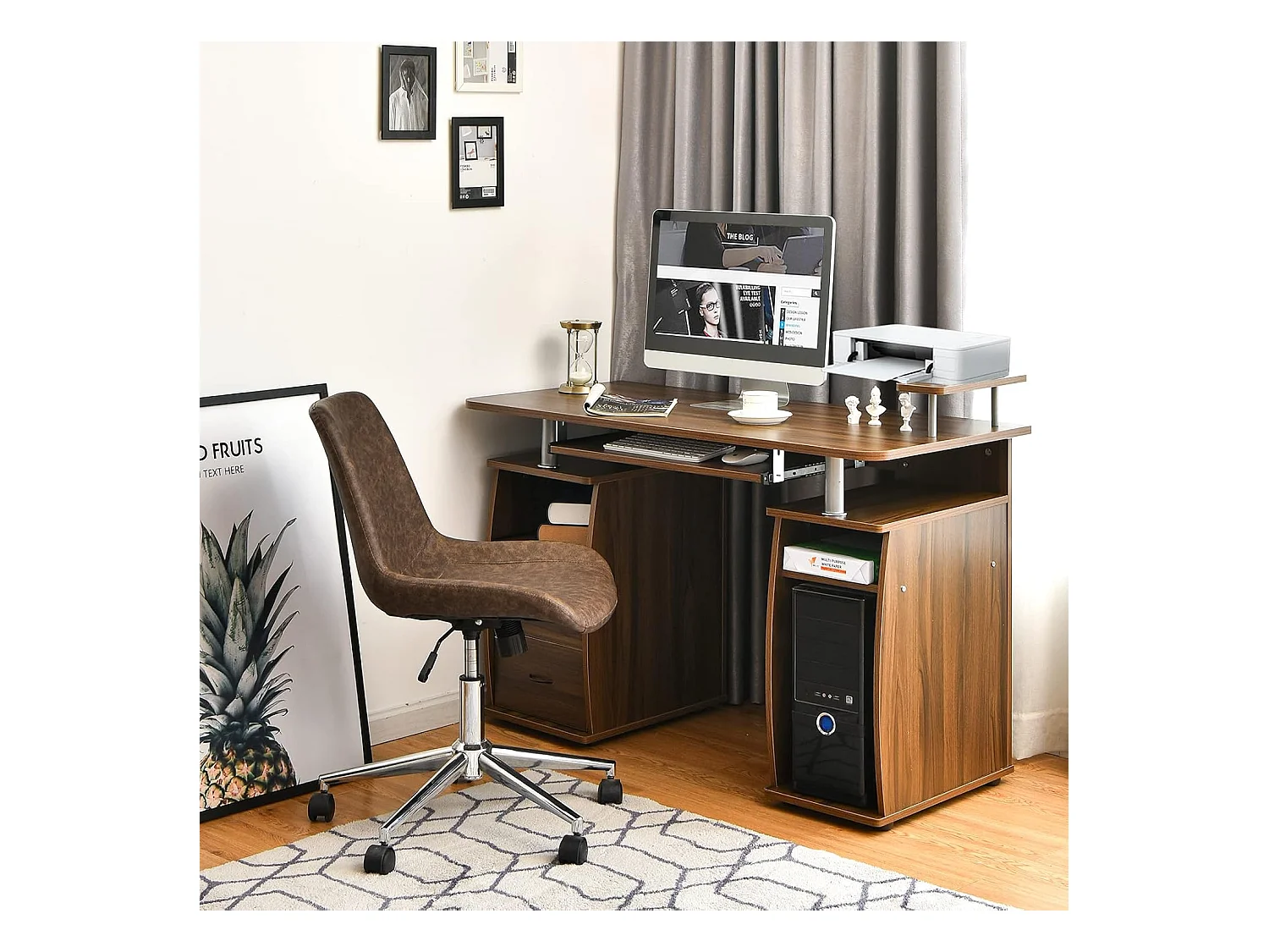 Bureau Informatique Table de Bureau en MDF pour Ordinateur Multi-Rangements avec Tablette Imprimante, Tablette à Clavier Coulissante, 2 Tiroirs 120x55x85cm (Noyer)