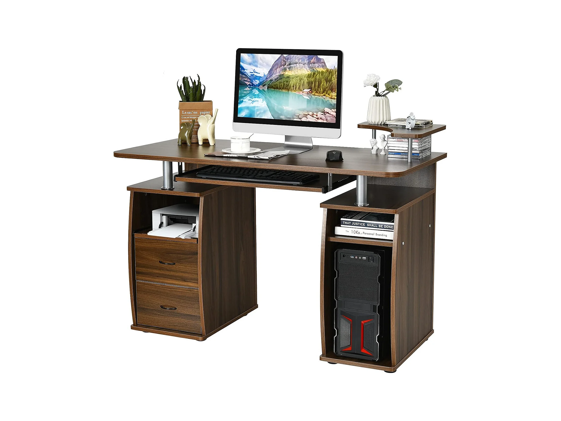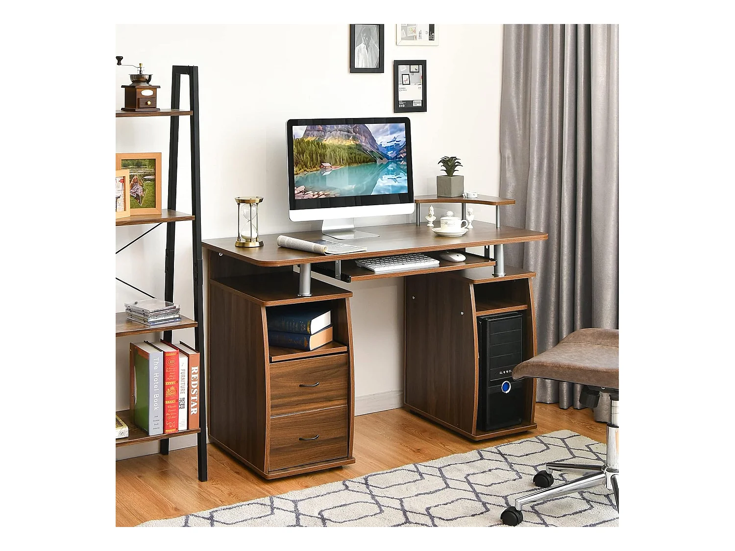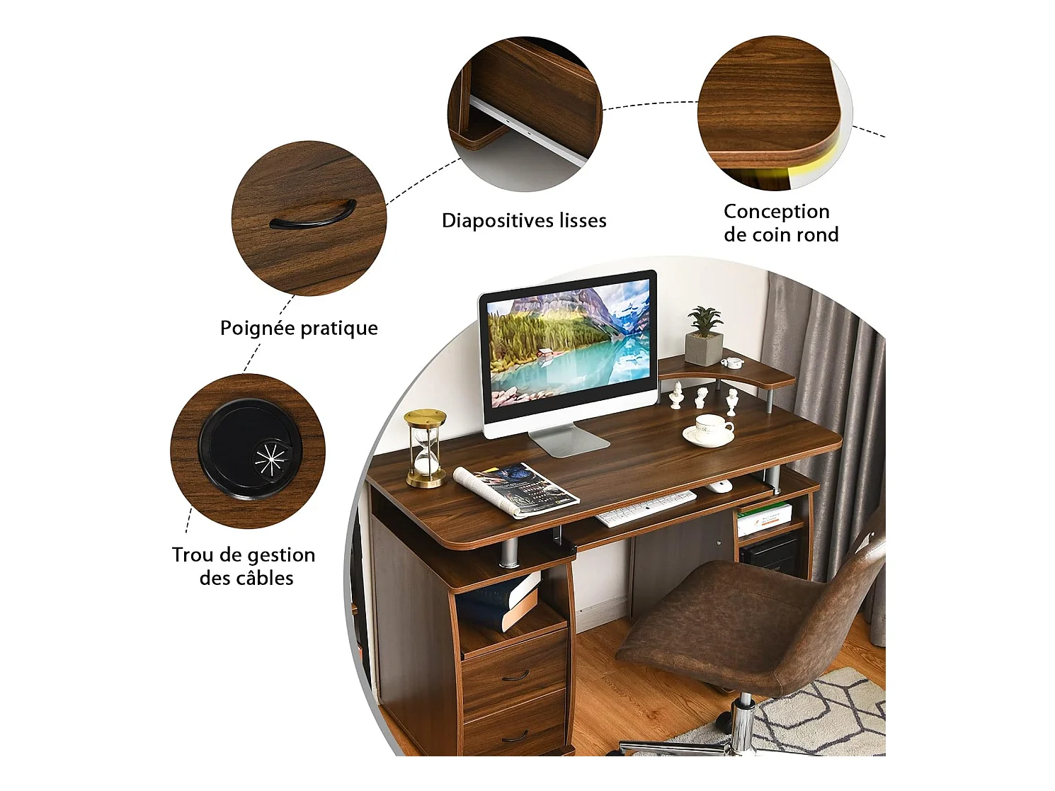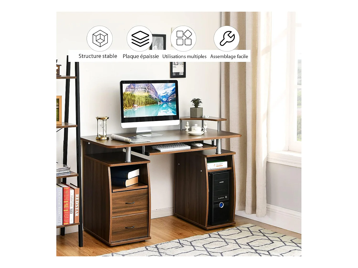 Bureau Informatique Table de Bureau en MDF pour Ordinateur Multi-Rangements avec Tablette Imprimante, Tablette à Clavier Coulissante, 2 Tiroirs 120x55x85cm (Noyer)