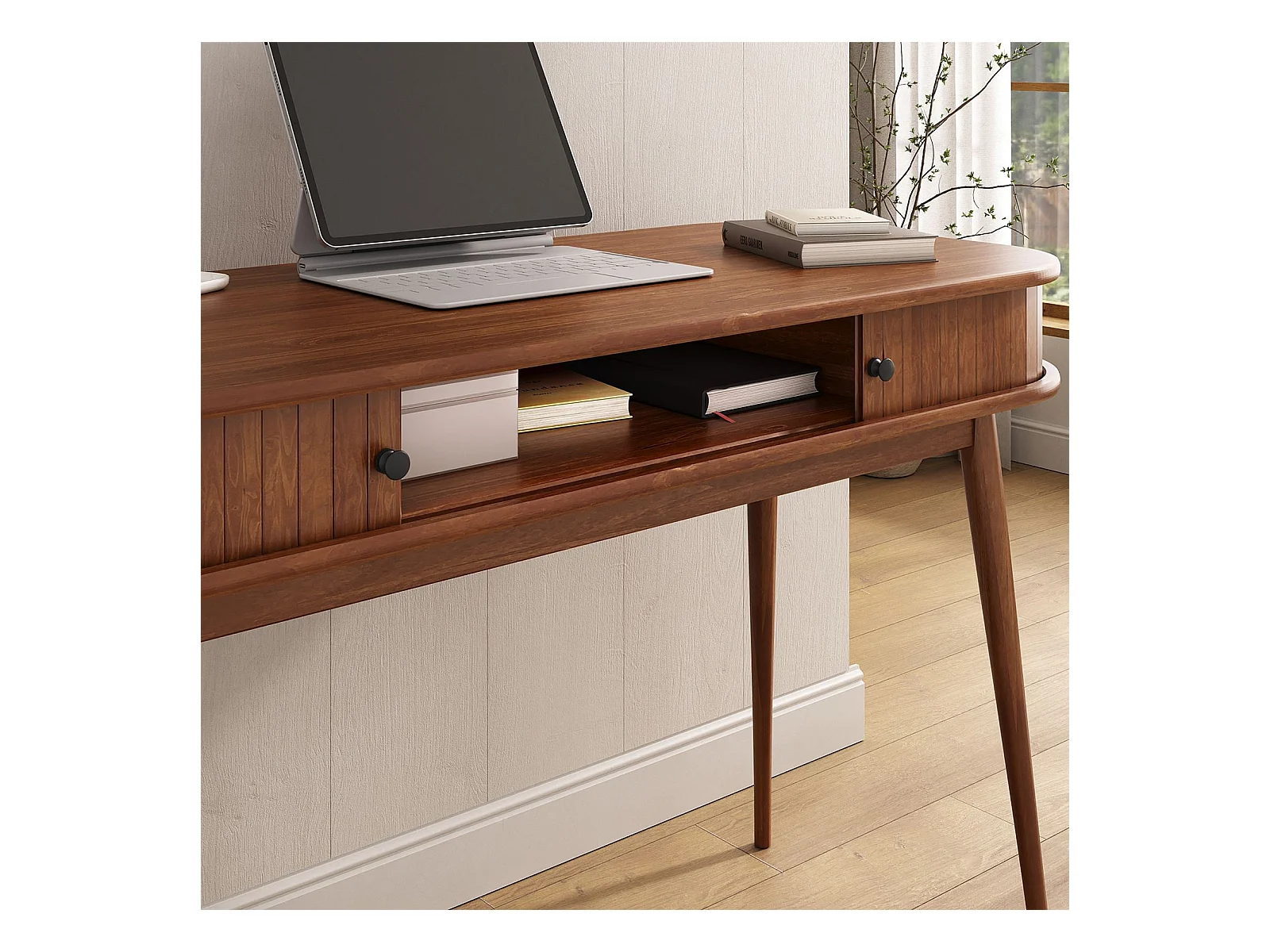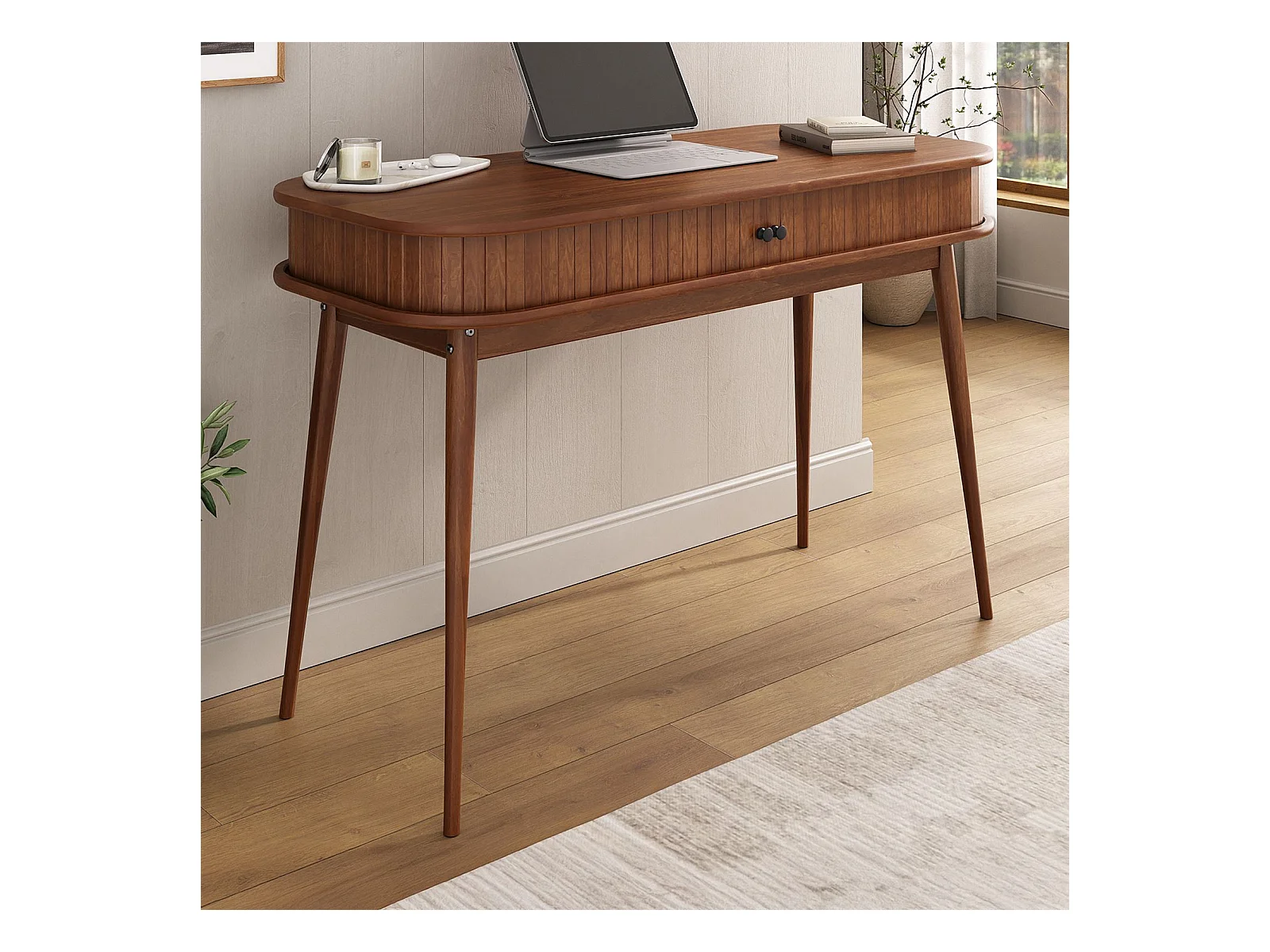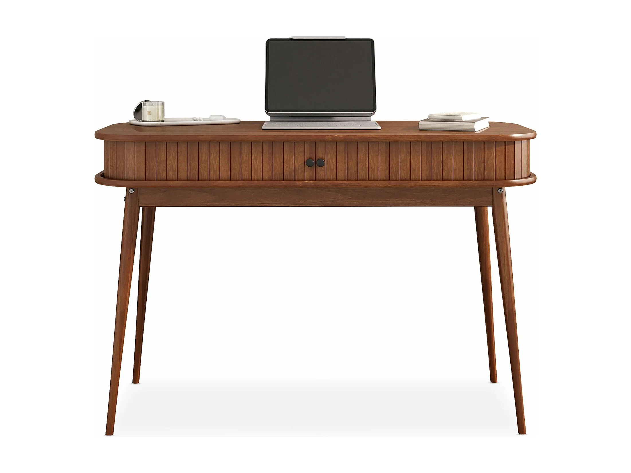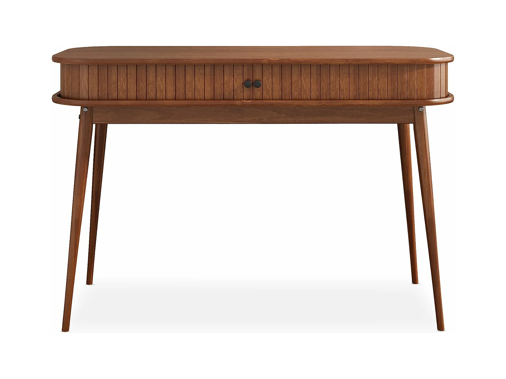 Bureau JARI en bois massif, 113 x 75 cm, façade cannelée, rangement avec porte coullisante, coloris châtaignier
