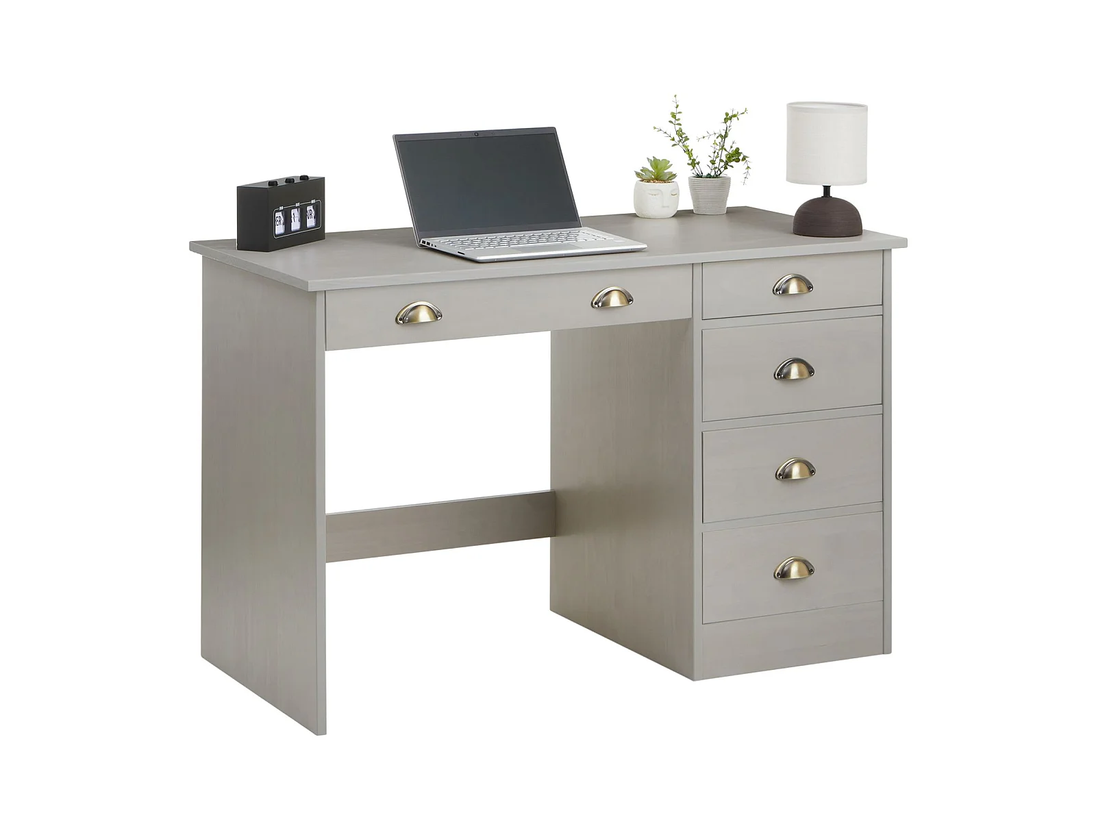Bureau LANA avec rangement 5 tiroirs et poignées en forme de coquille, en pin massif lasuré gris
