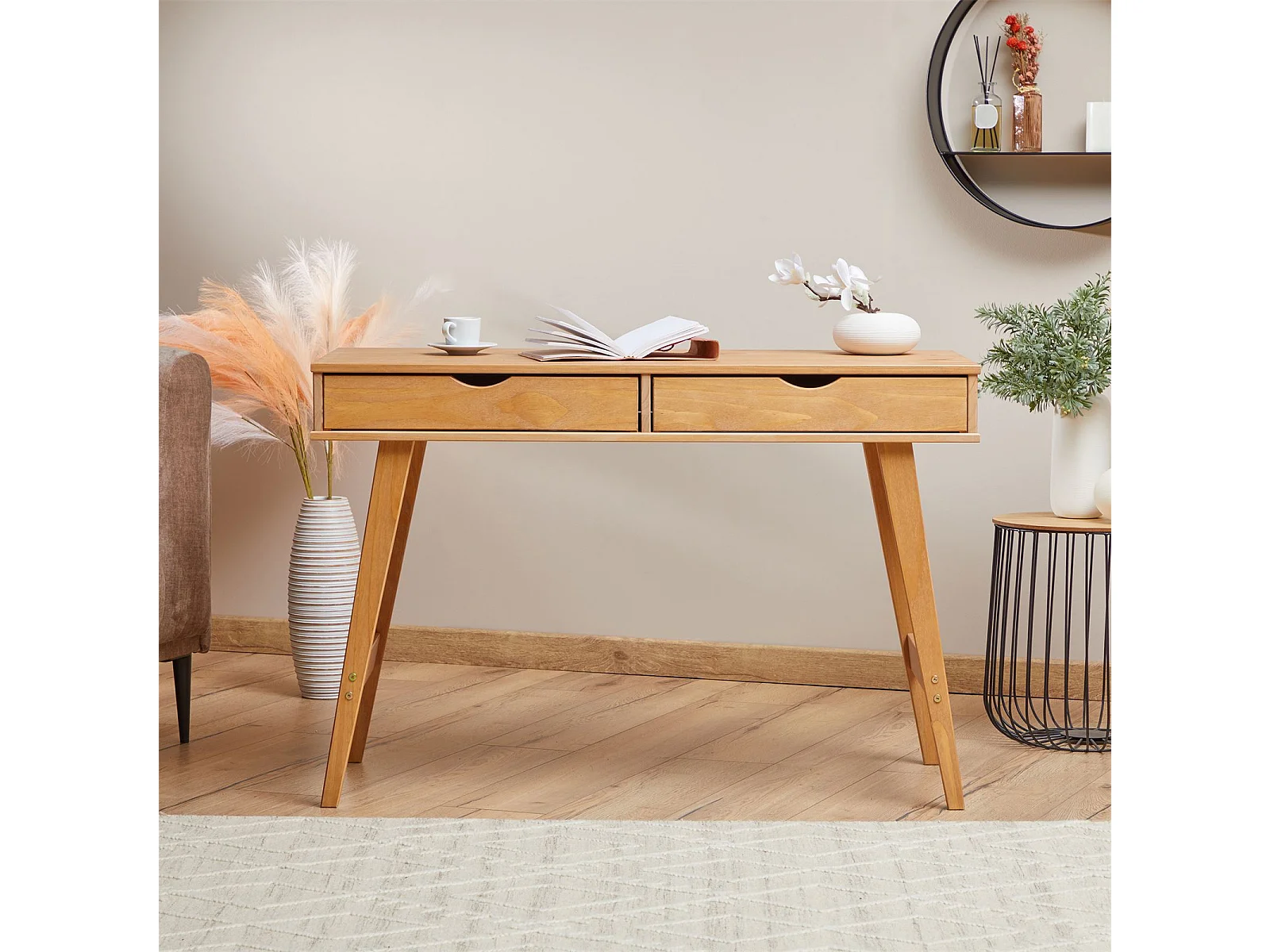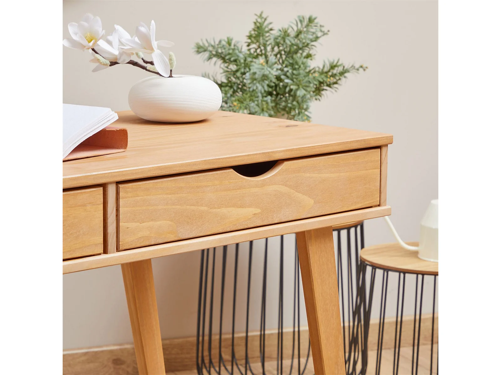 Bureau MILO en pin massif lasuré brun avec 2 tiroirs de rangement