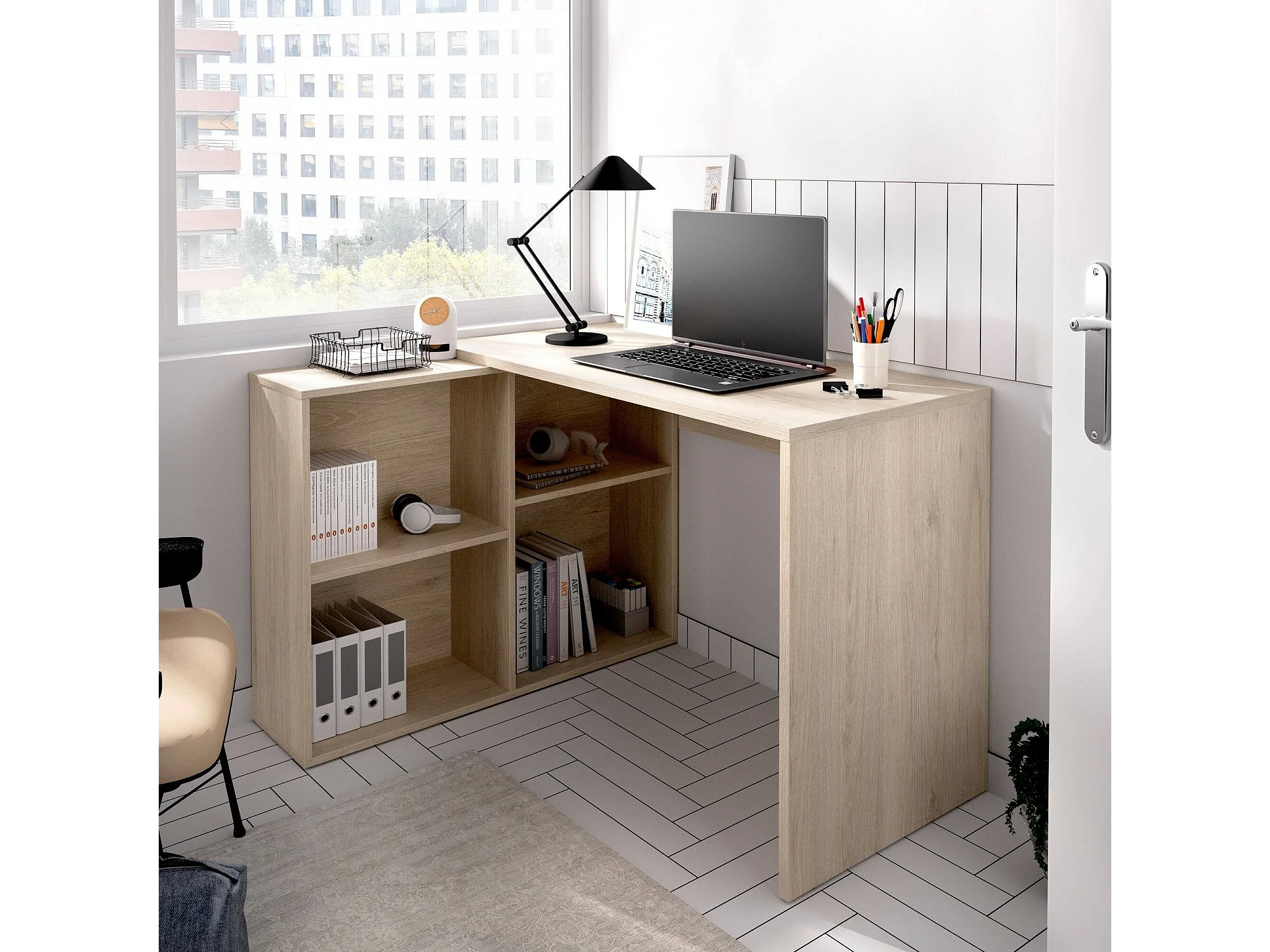 Bureau Mulaz, Bureau multi-positions pour bureau ou chambre, Table d'étude d'angle avec étagères, 121x96h74 cm, Chêne