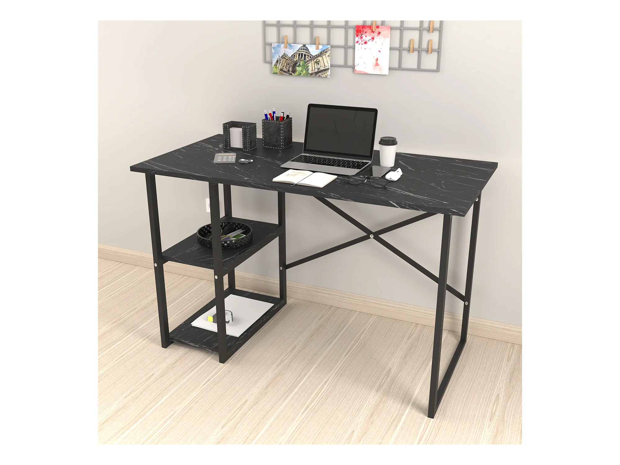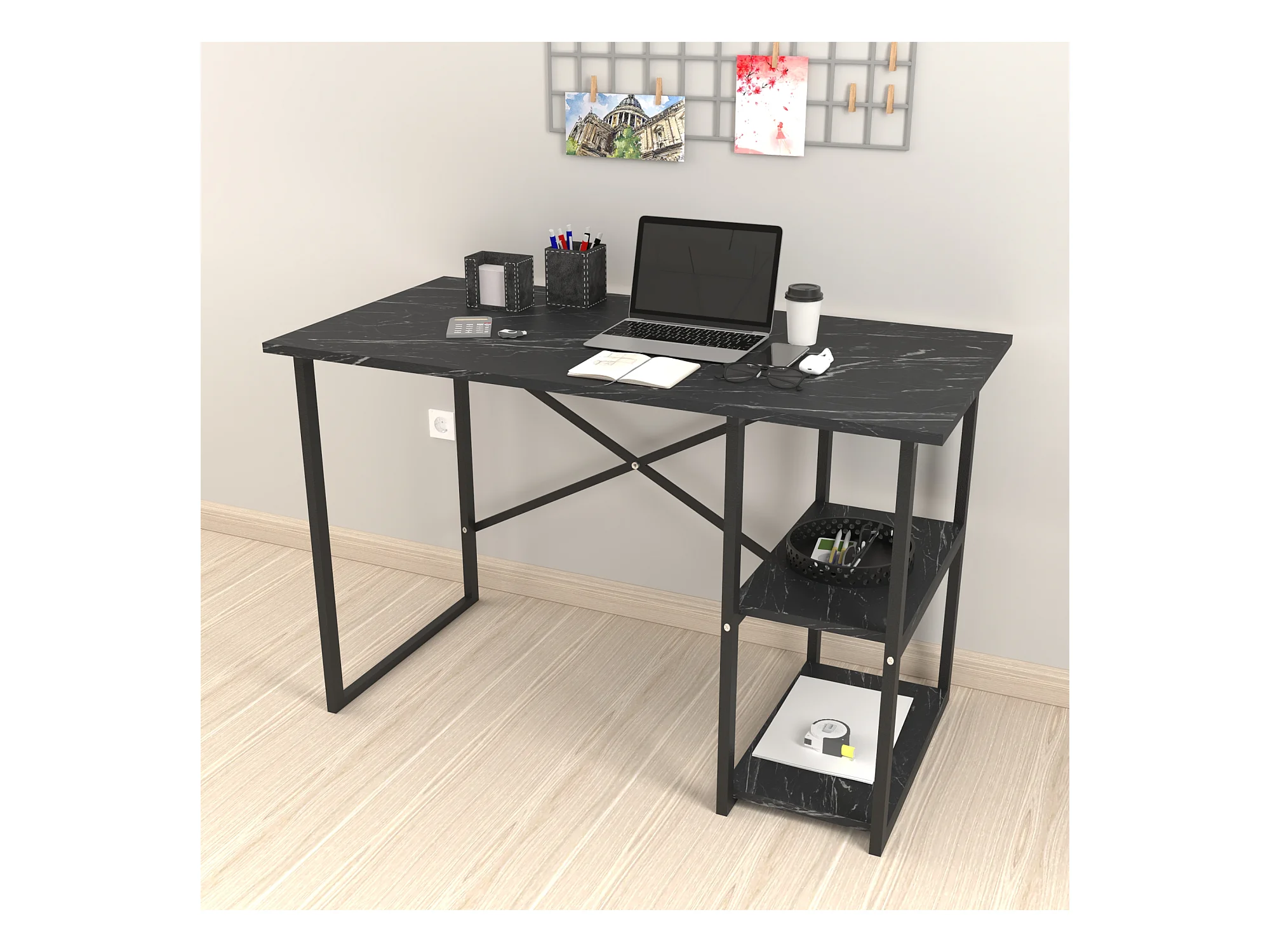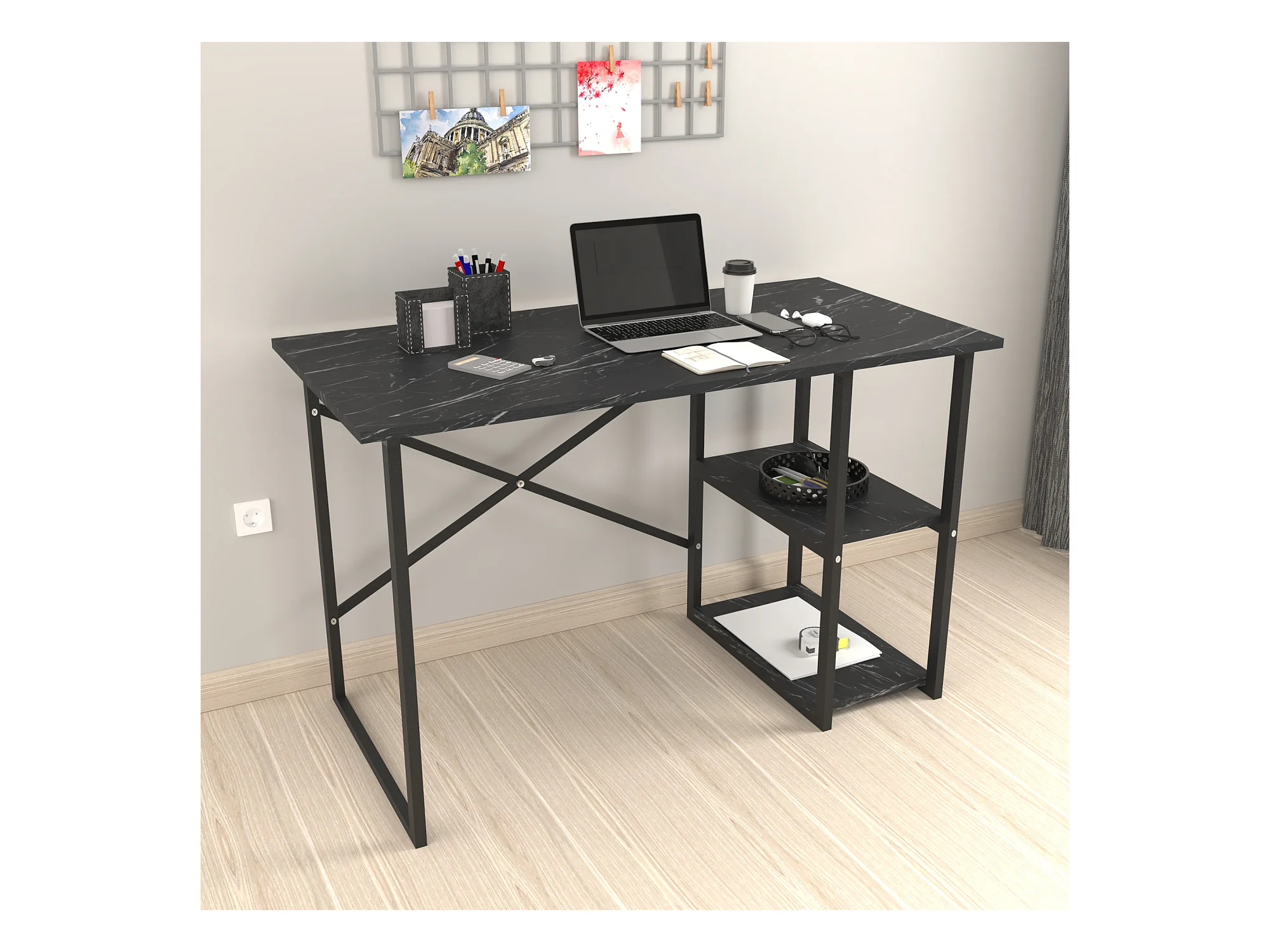 Bureau Nittedal avec étagère intégrée à 2 niveaux 75 x 120 x 60 cm marbre noir [en.casa]