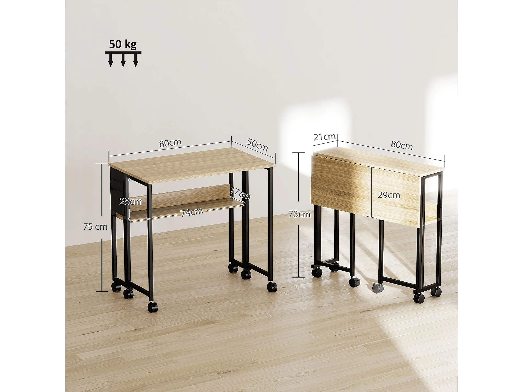 Bureau pliable à roulettes dim. 80x50cm étagère pochette rangement acier noir effet chêne clair
