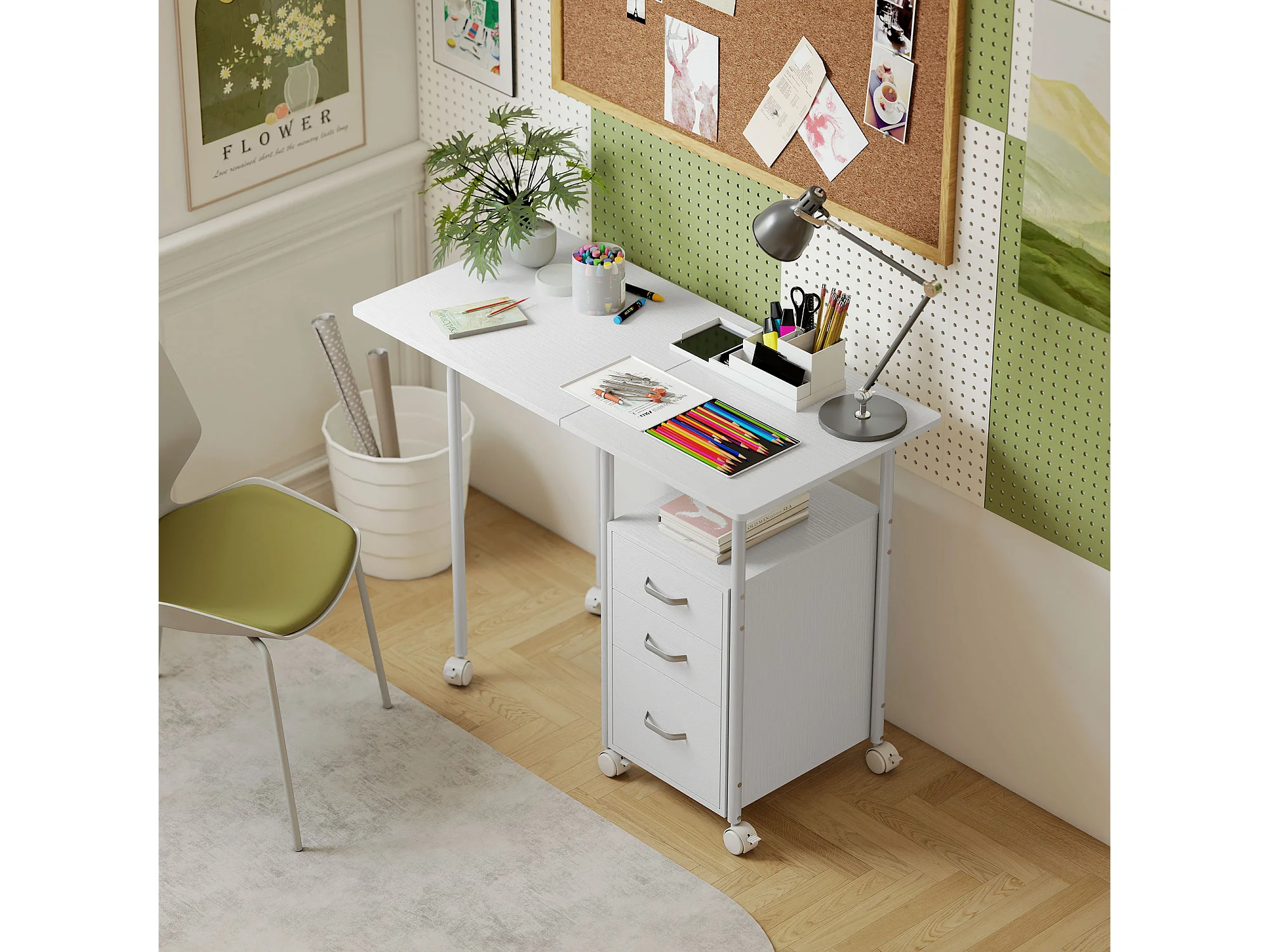 Bureau pliable sur roulettes avec rangement 3 tiroirs dim. totales 105x51x75,5cm métal effet bois blanc