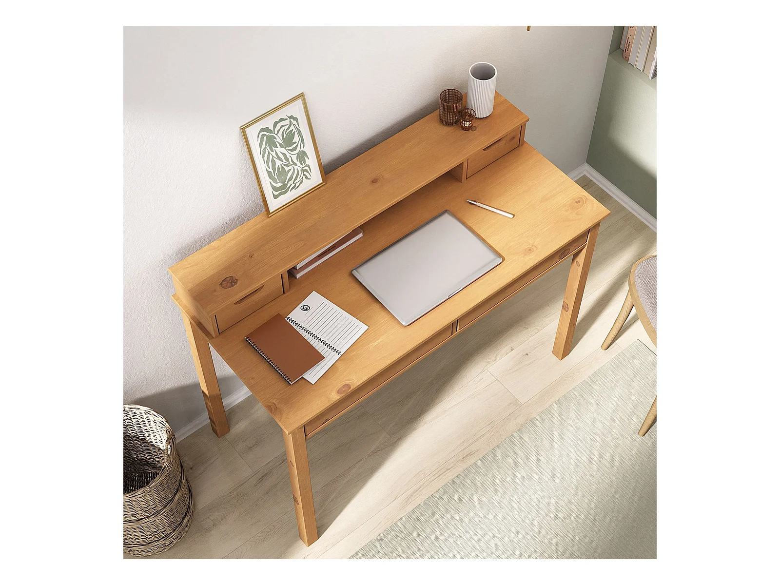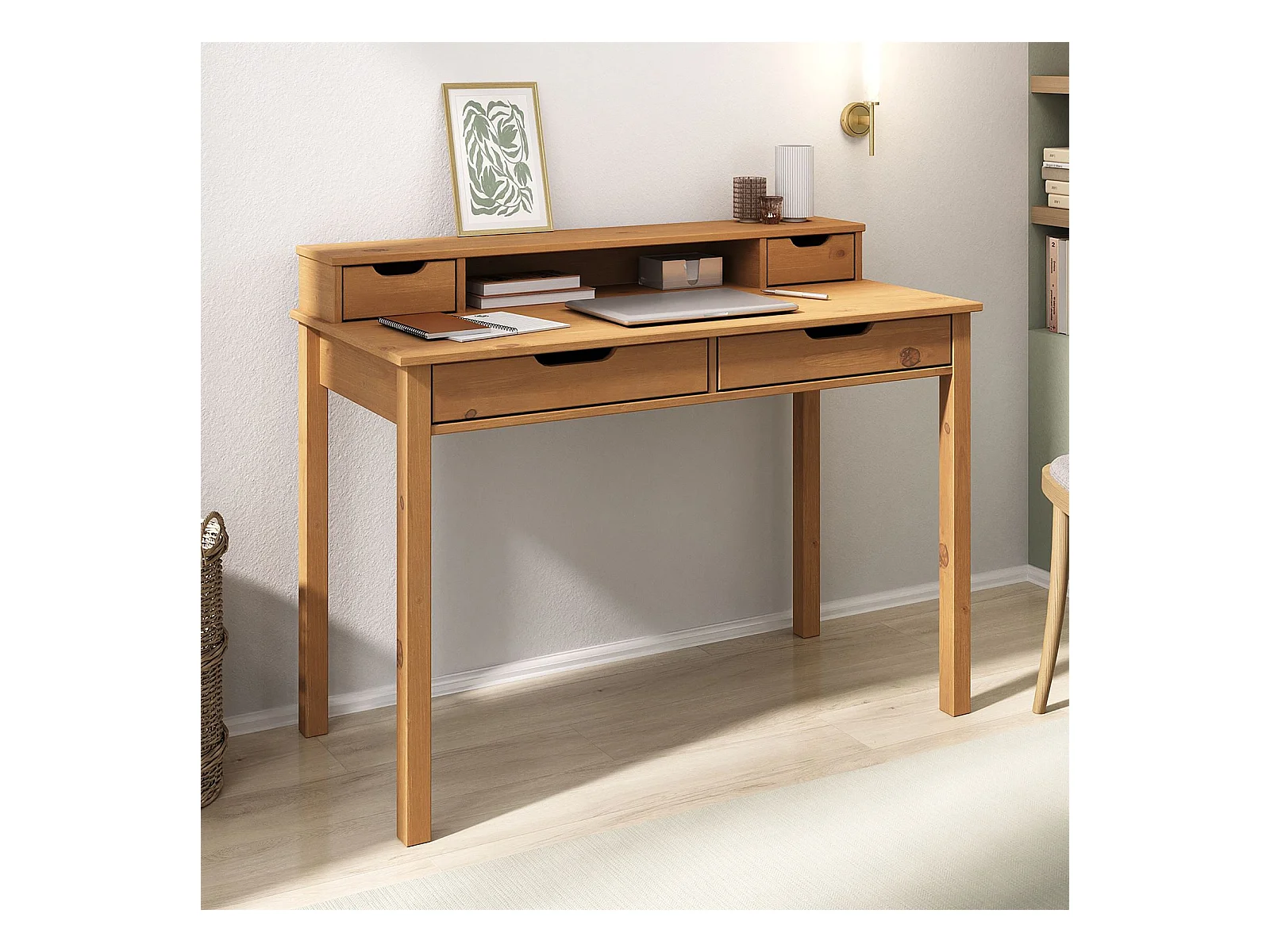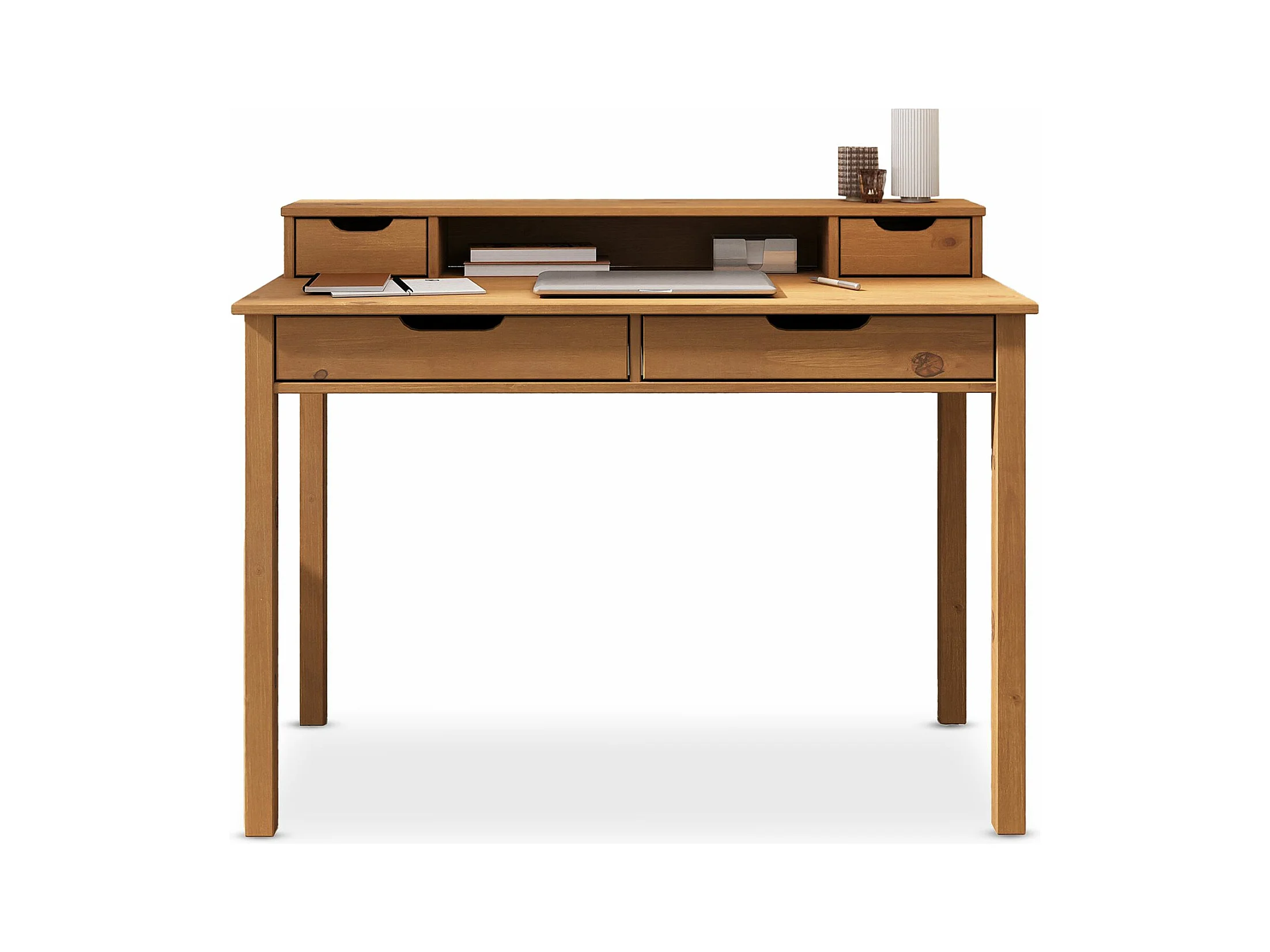 Bureau RAUL L 114 cm en bois massif coloris chêne avec quatre tiroirs et une niche réhausse écran intégrée