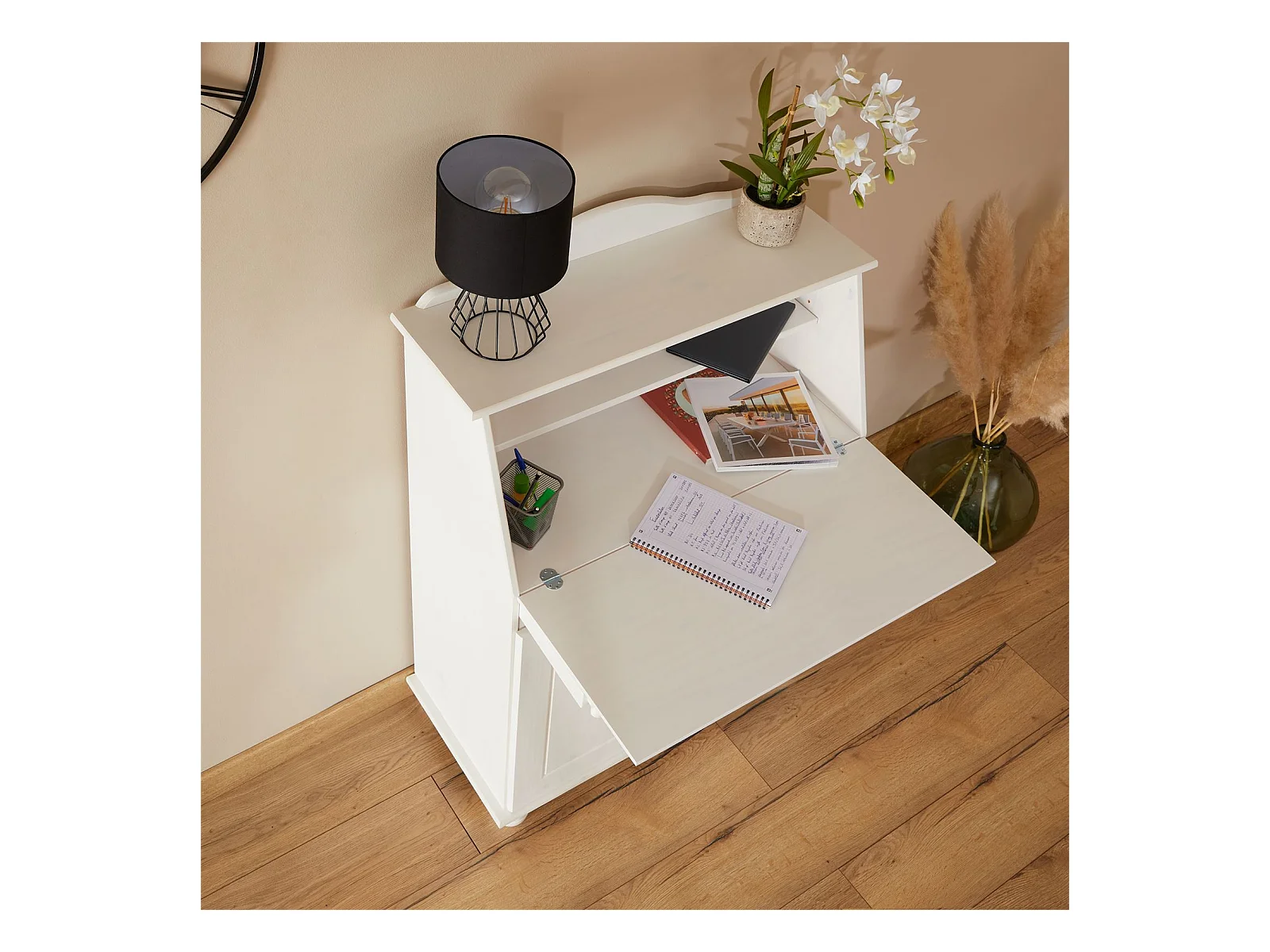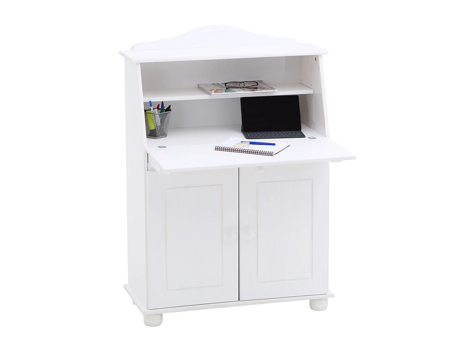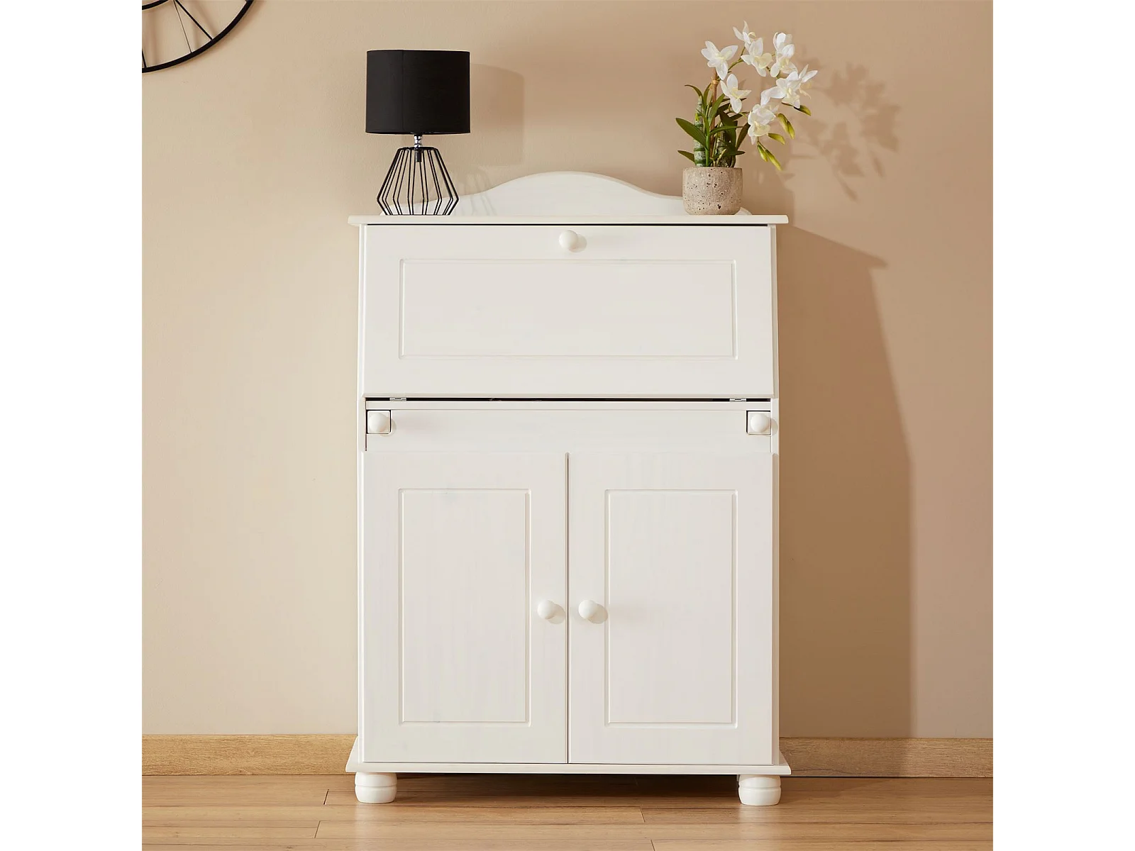 Bureau secrétaire DAVID avec abattant rangement plusieurs étagères 2 portes et plan de travail rabattable en pin massif lasuré blanc