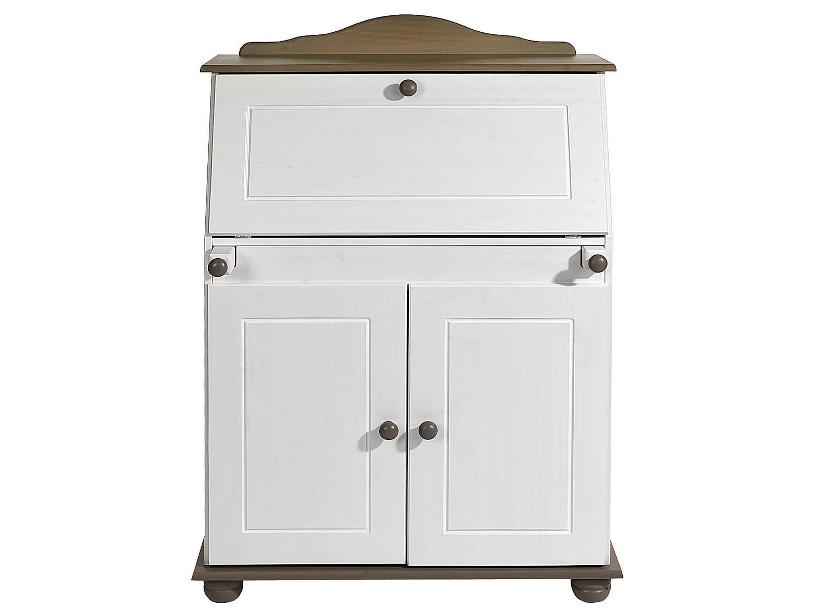 Bureau secrétaire DAVID avec abattant rangement plusieurs étagères 2 portes plan de travail rabattable, en pin massif taupe et blanc