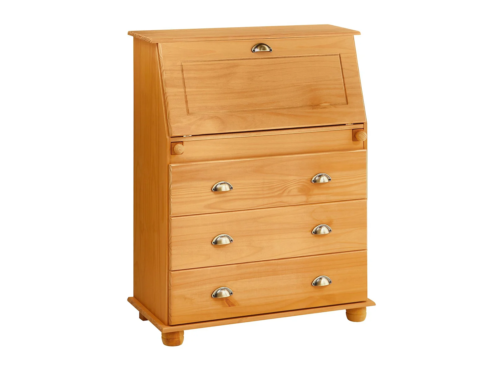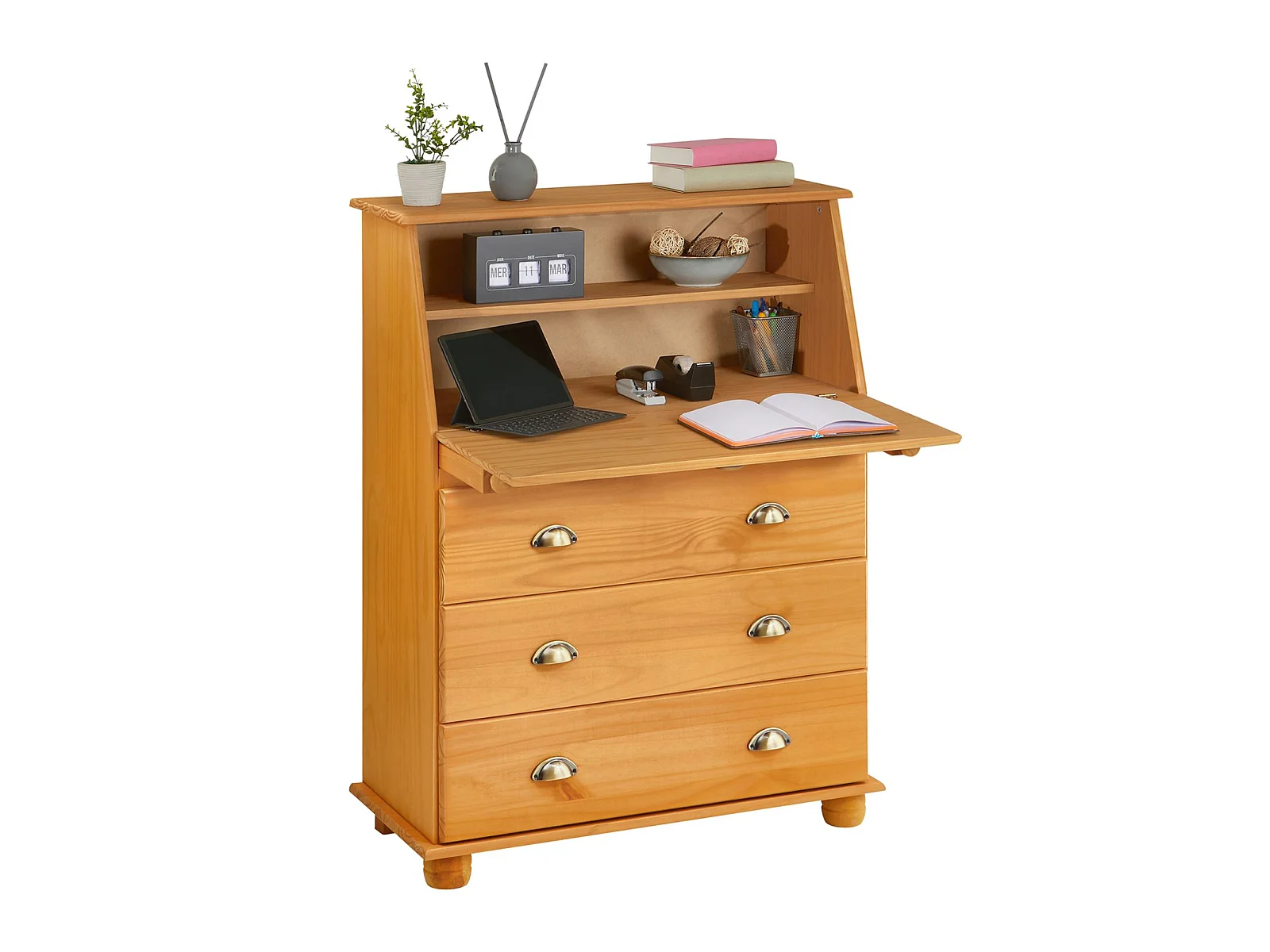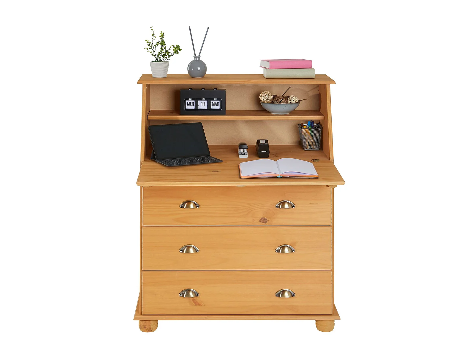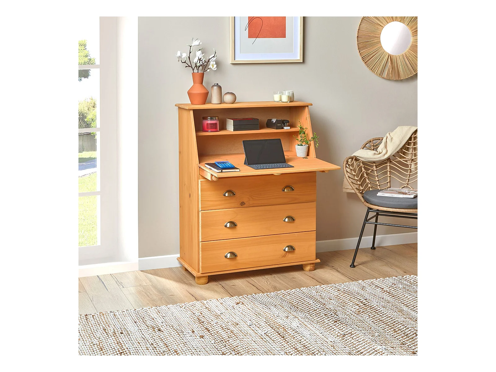 Bureau secrétaire GOMES rangement avec abattant 1 étagère et 3 tiroirs, plan de travail rabattable, pin massif finition teintée/ciré