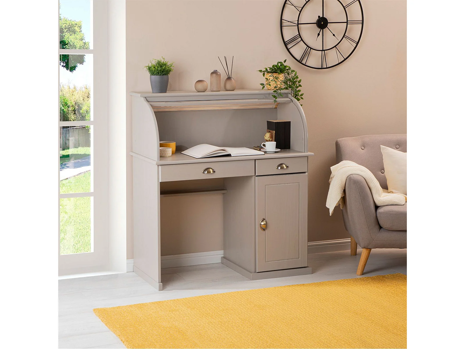 Bureau secrétaire TOM avec volet roulant rangement 2 tiroirs et 1 porte avec étagère, en pin massif lasuré gris