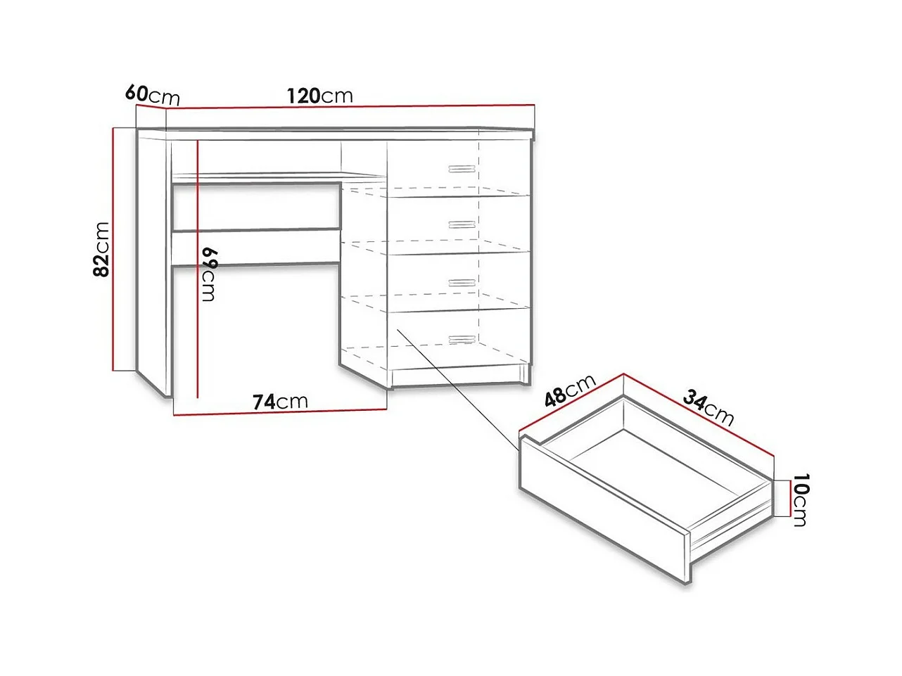 Bureau Serfeno 114, Étagère à clavier|Avec tiroirs, Nombre de tiroirs: 4, 82x120x60cm