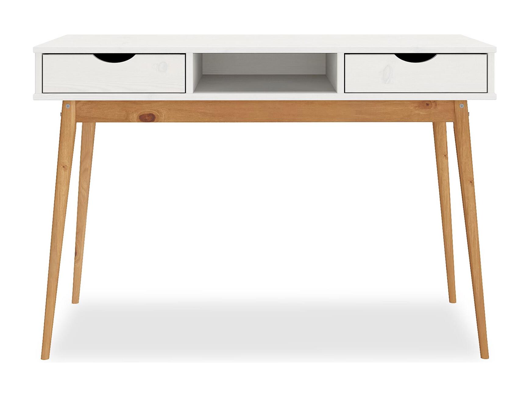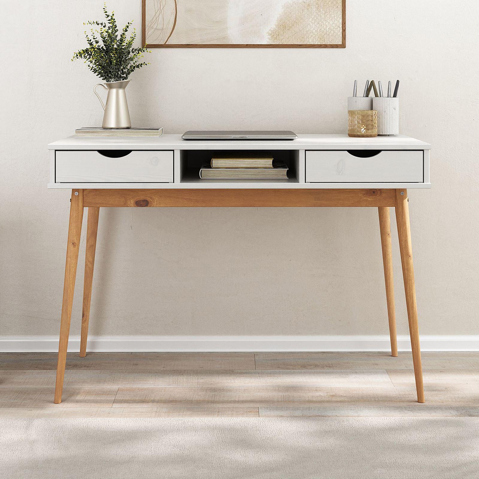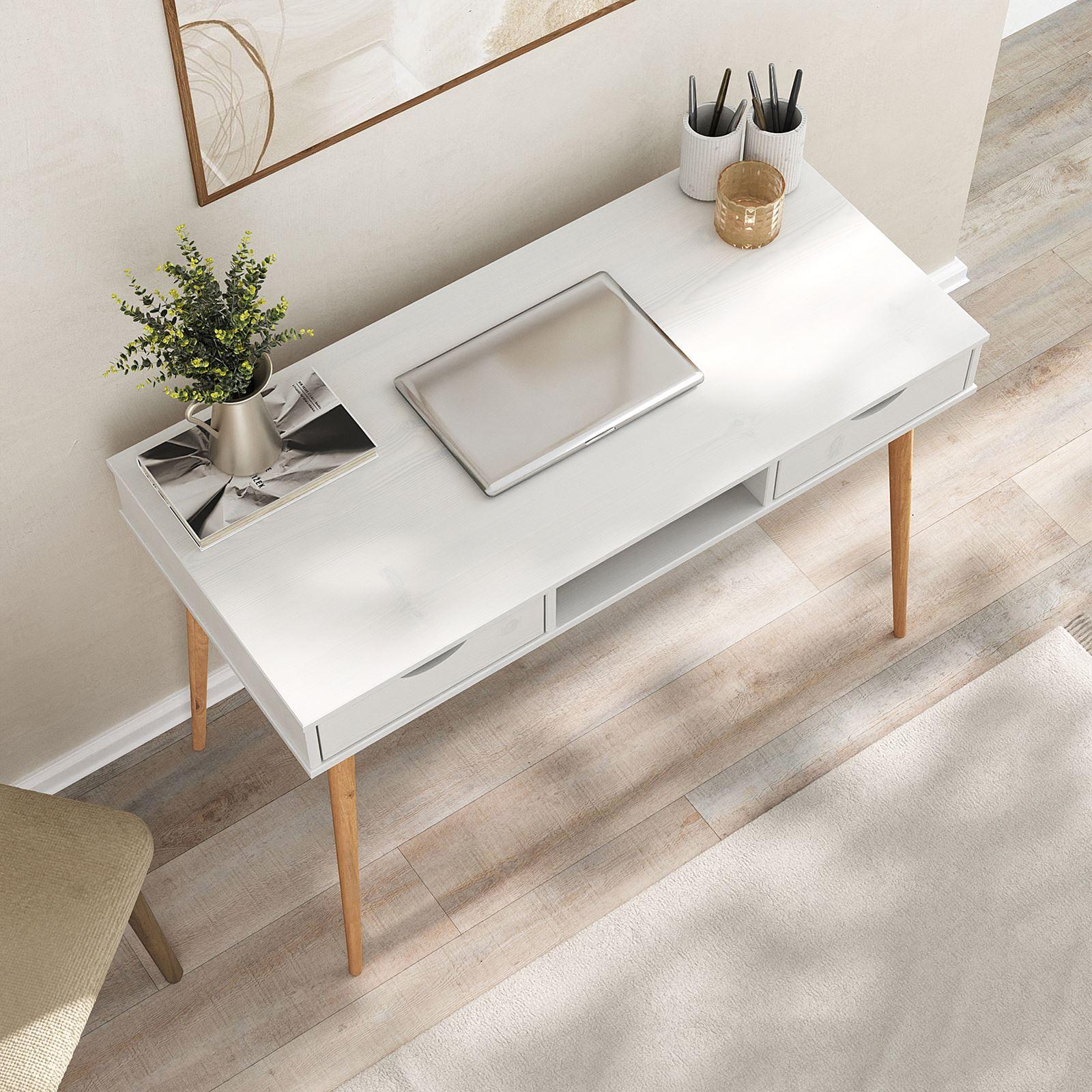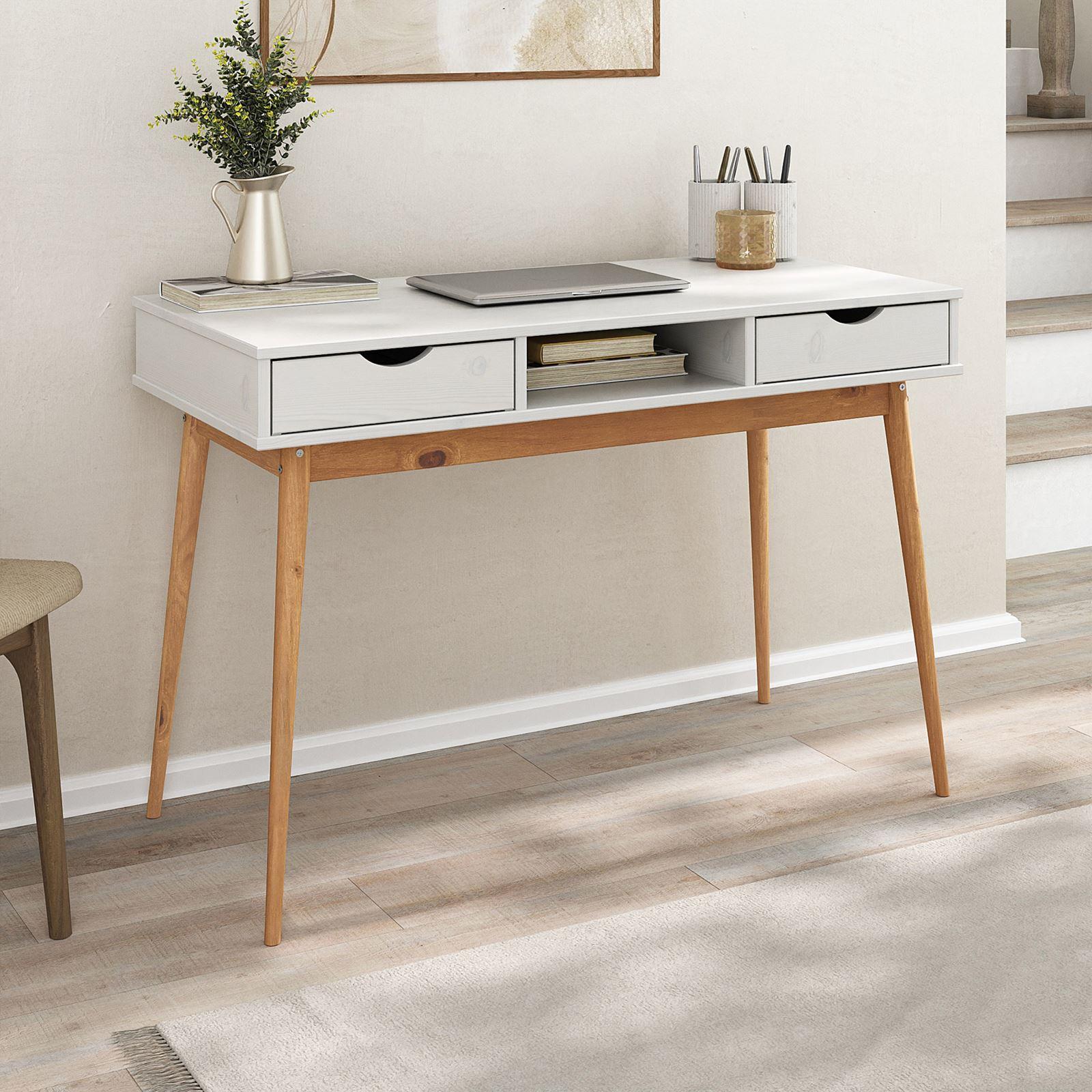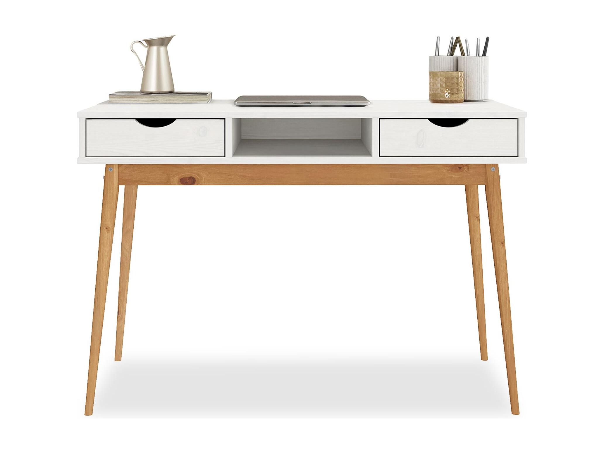 Bureau STEFANO en pin massif avec 2 tiroirs et 1 niche intégrée lasuré blanc/chêne