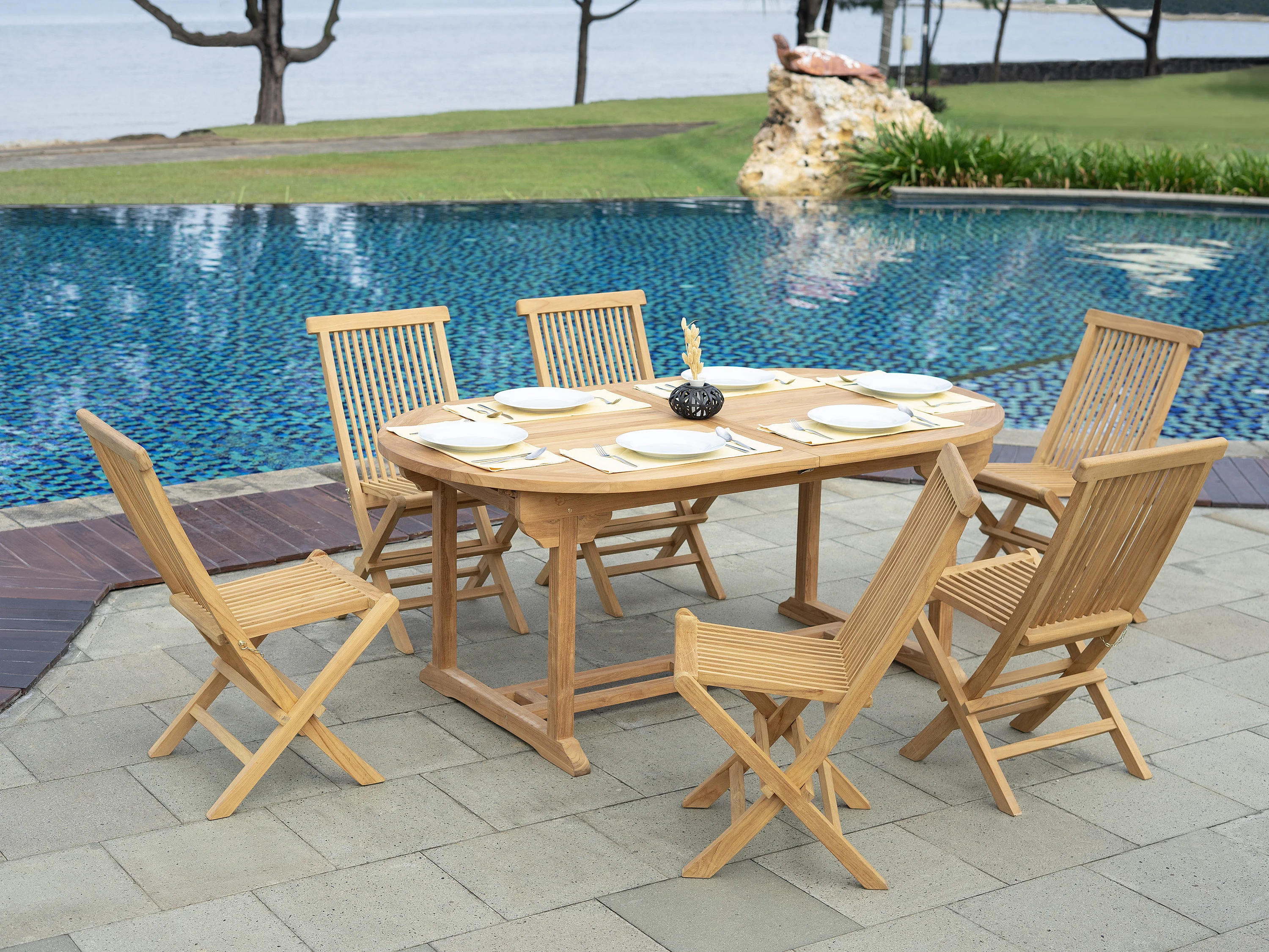 Salle à manger de jardin en teck : une table extensible L.120 / 170 cm et 6 chaises pliantes - Naturel clair - BYBLOS II de MYLIA