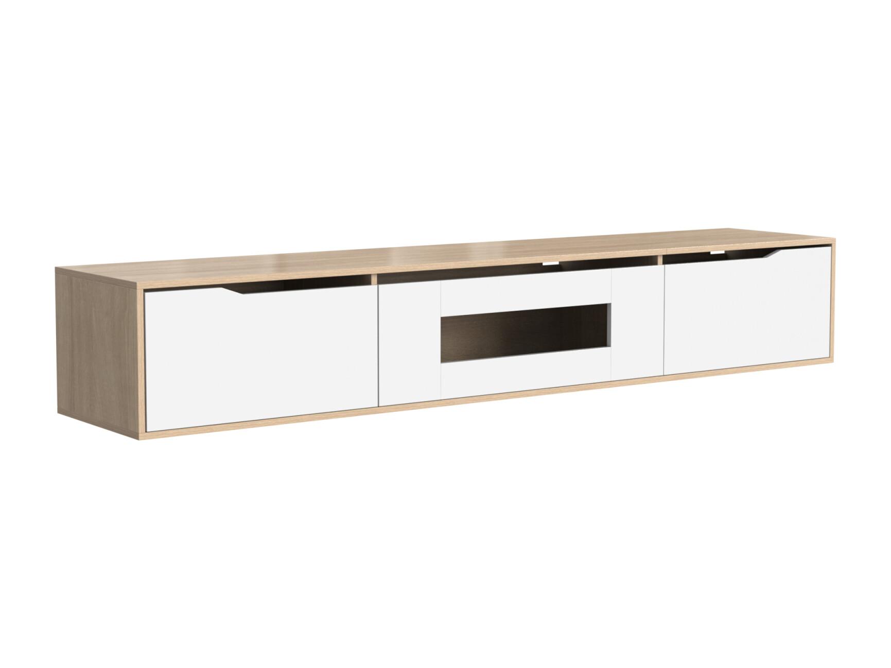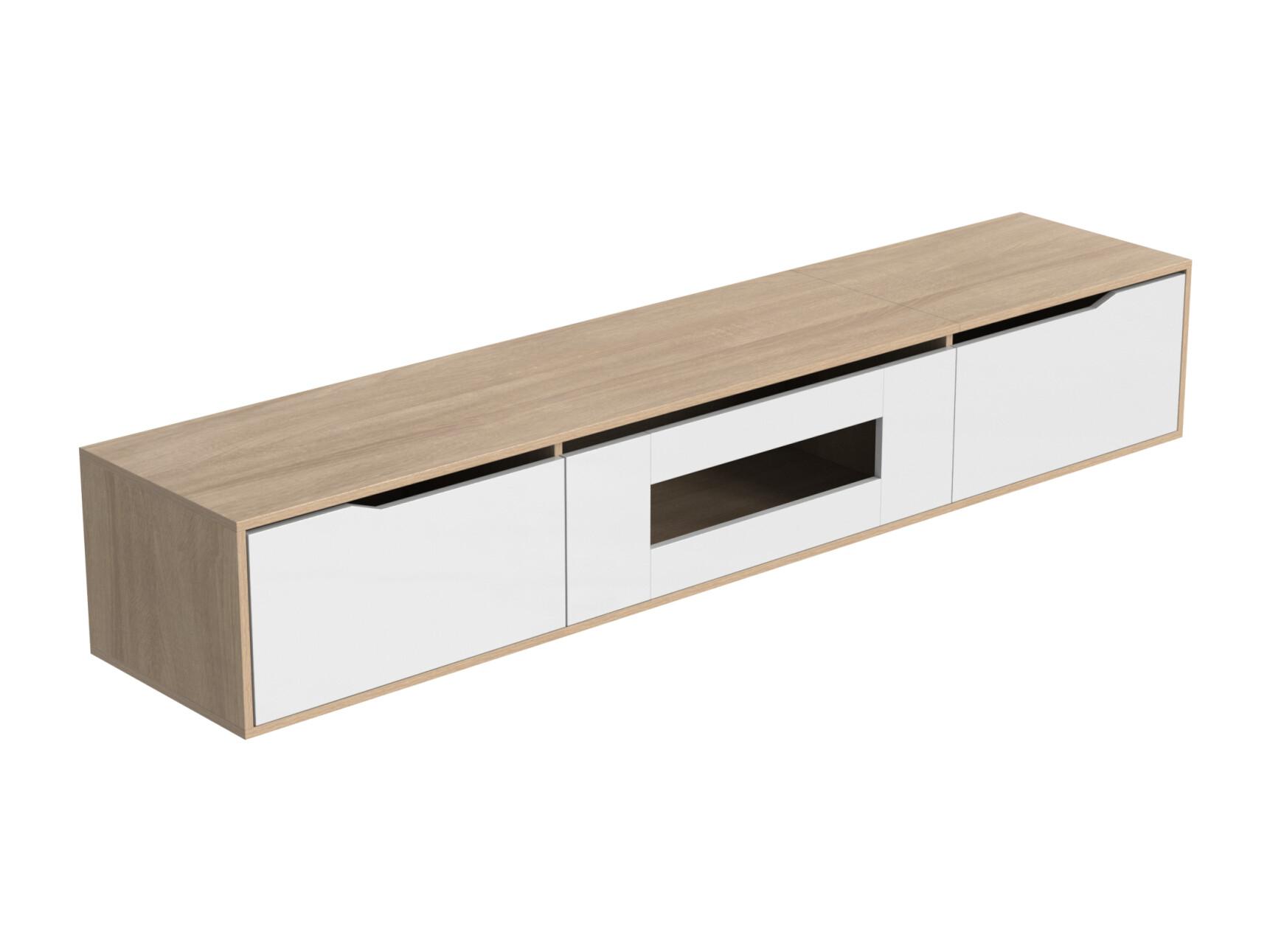 Meuble TV blanc avec éclairage LED - Meuble TV avec 2 tiroirs et 2 portes - plateau en bois et rangements ouverts