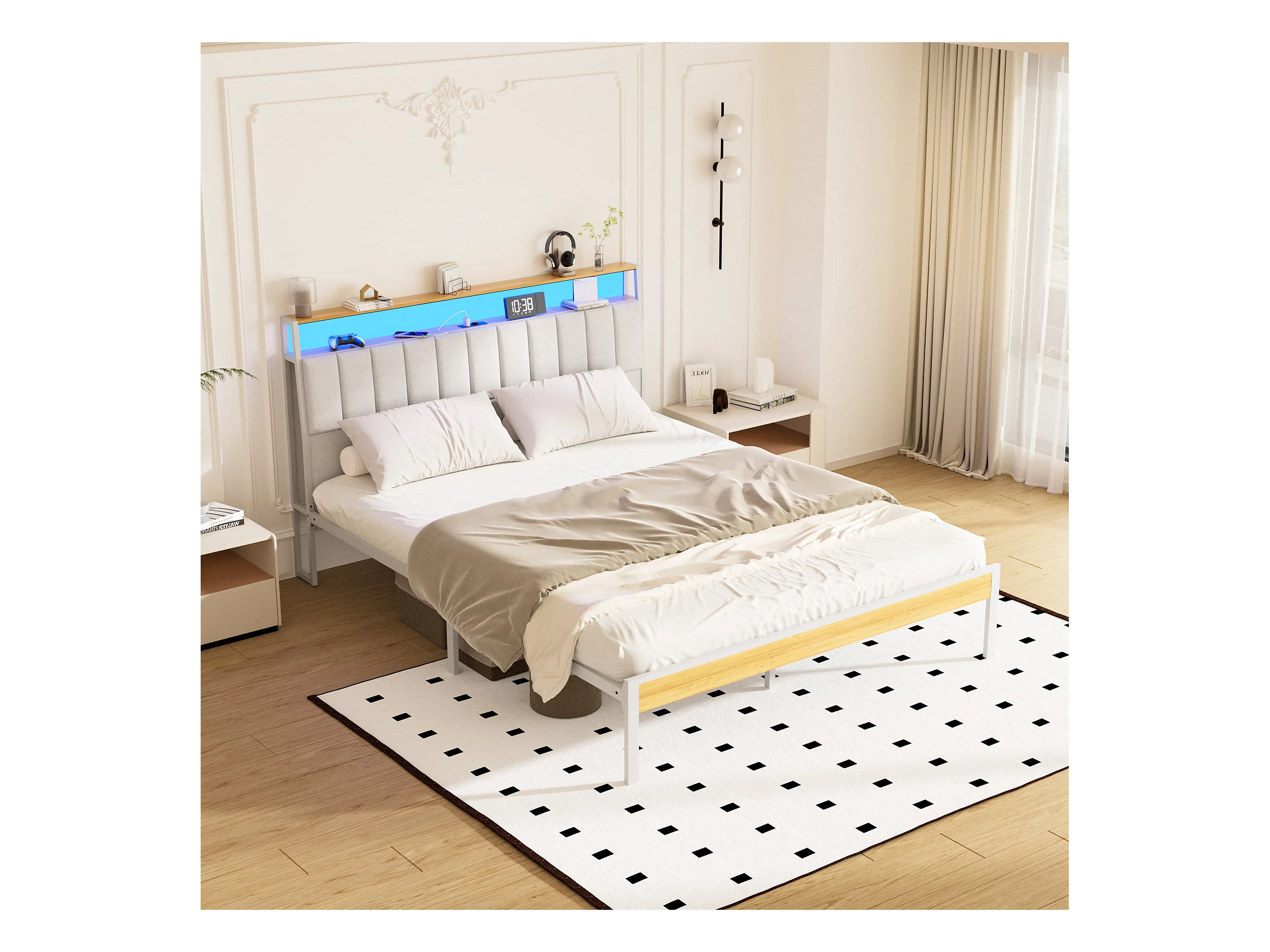 Cadre de lit, 140 x 200 avec Base en métal, avec lumières LED et Prises Multiples (1 Prise AC, 2 Ports USB), lit Double en métal avec casiers, Moderne, Beige