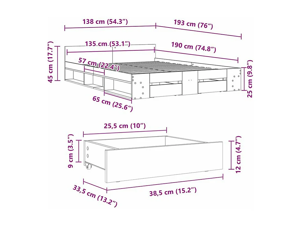 Cadre de lit à tiroirs chêne fumé 135x190 bois d'ingénierie