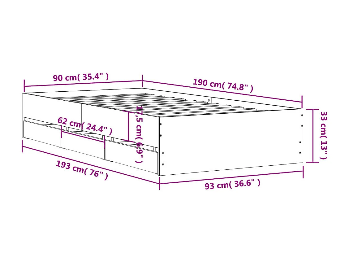 Cadre de lit à tiroirs chêne marron 90x190 bois d'ingénierie