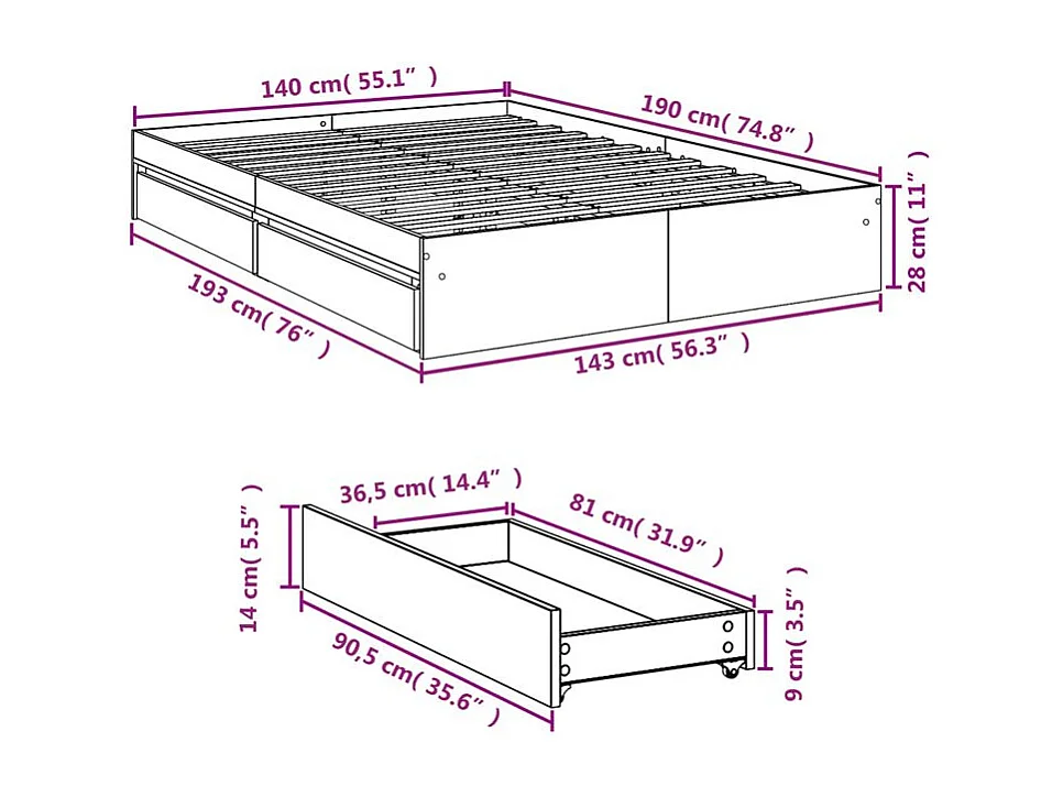 Cadre de lit avec tiroirs blanc 140x190 bois d'ingénierie