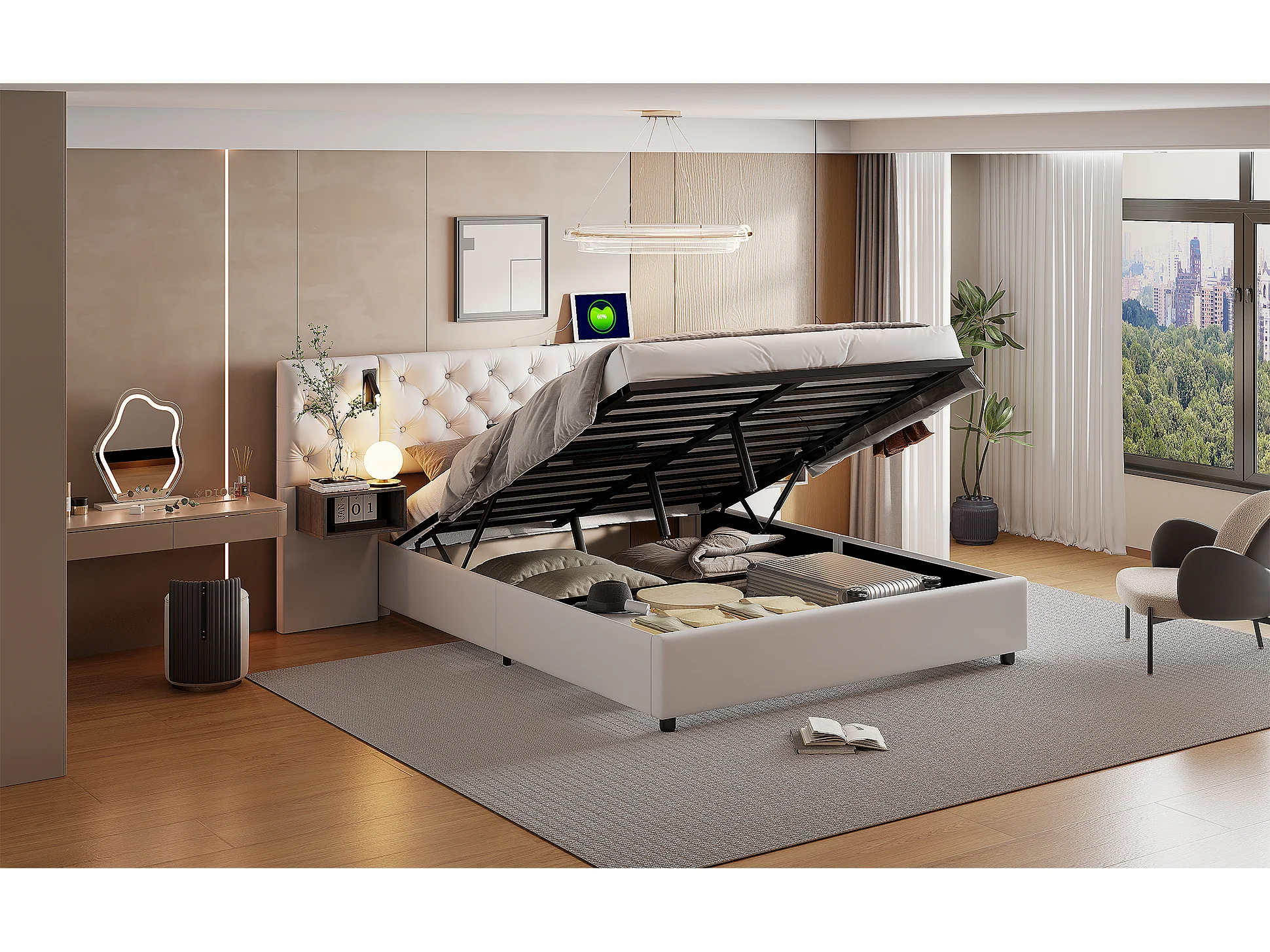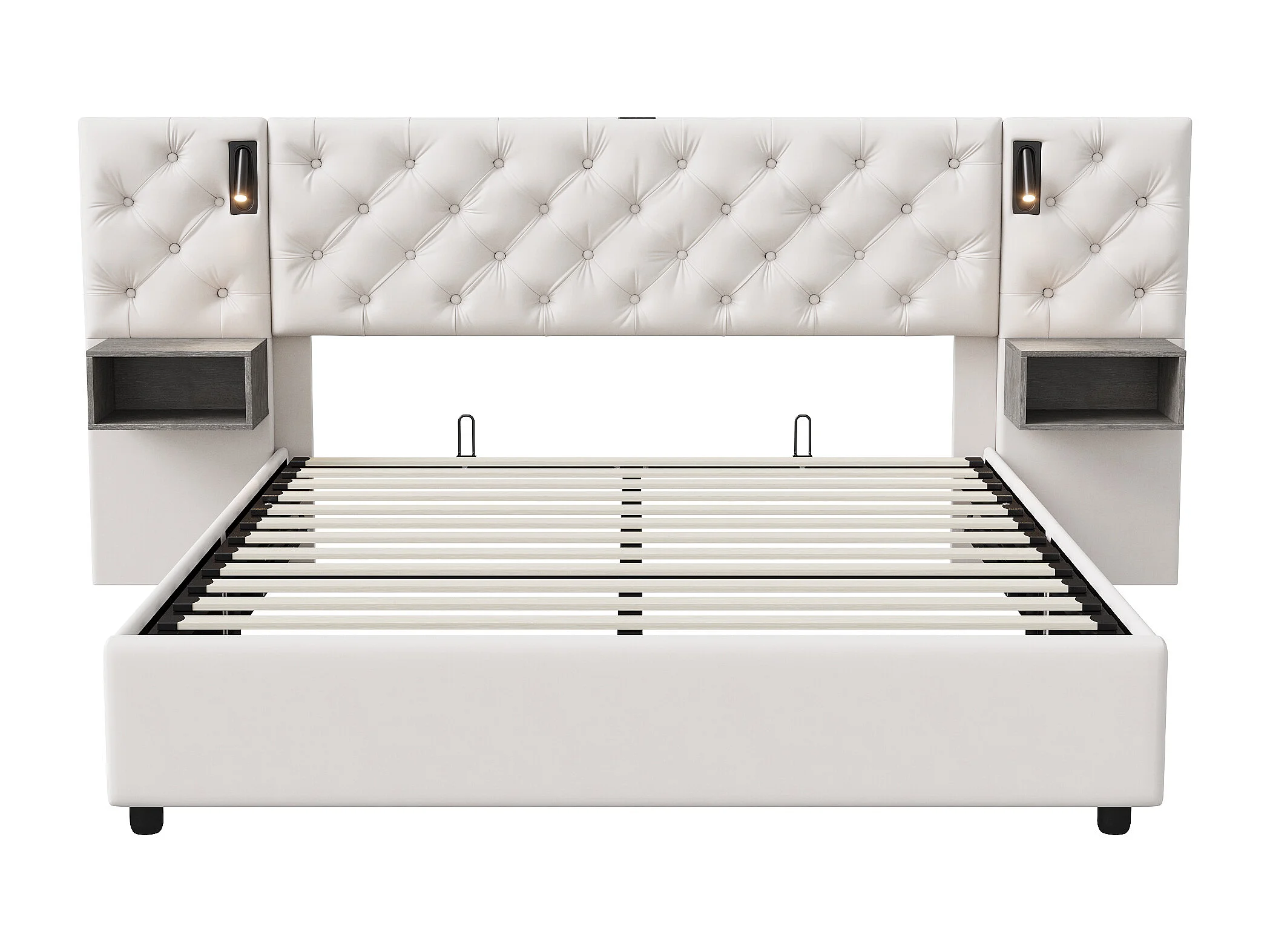 Cadre De Lit Capitonné Blanc - Rangement Hydraulique - Niches De Rangement Latérales - Lampes De Lecture Intégrées - 140 x 200