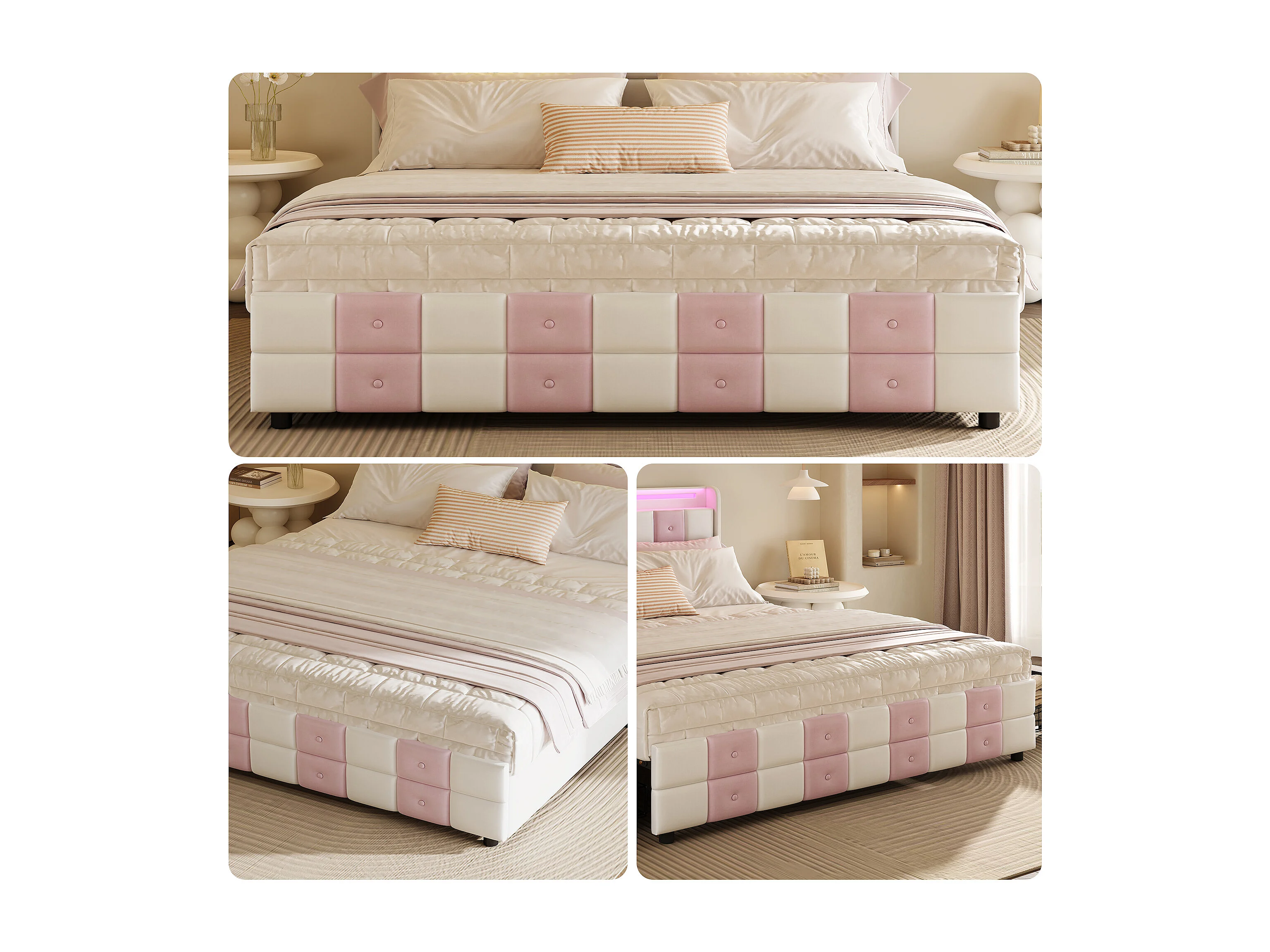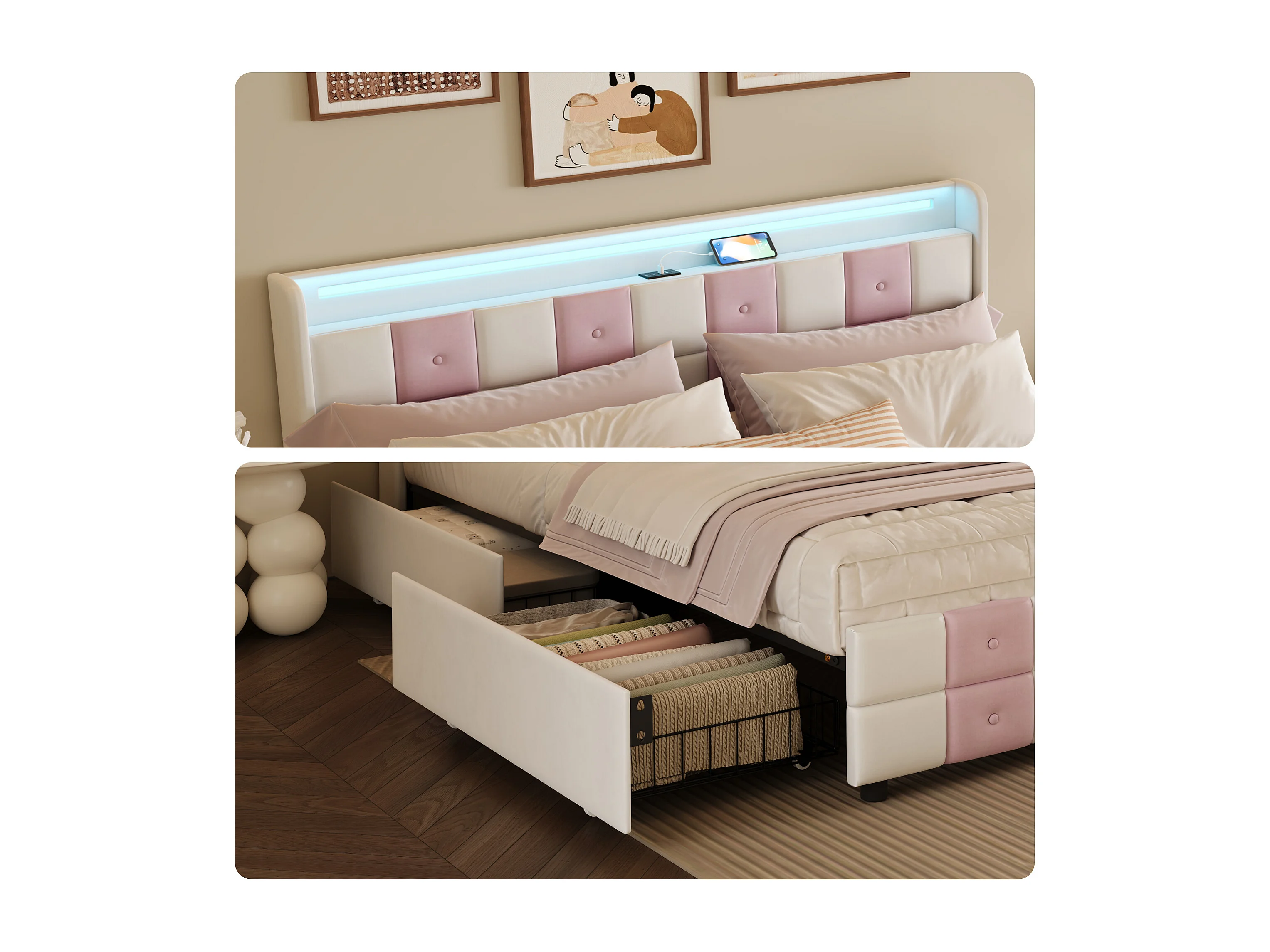 Cadre De Lit Capitonné Carreaux - Éclairage LED RGB - Ports USB De Recharge - Tiroirs De Rangement Spacieux - 160x200
