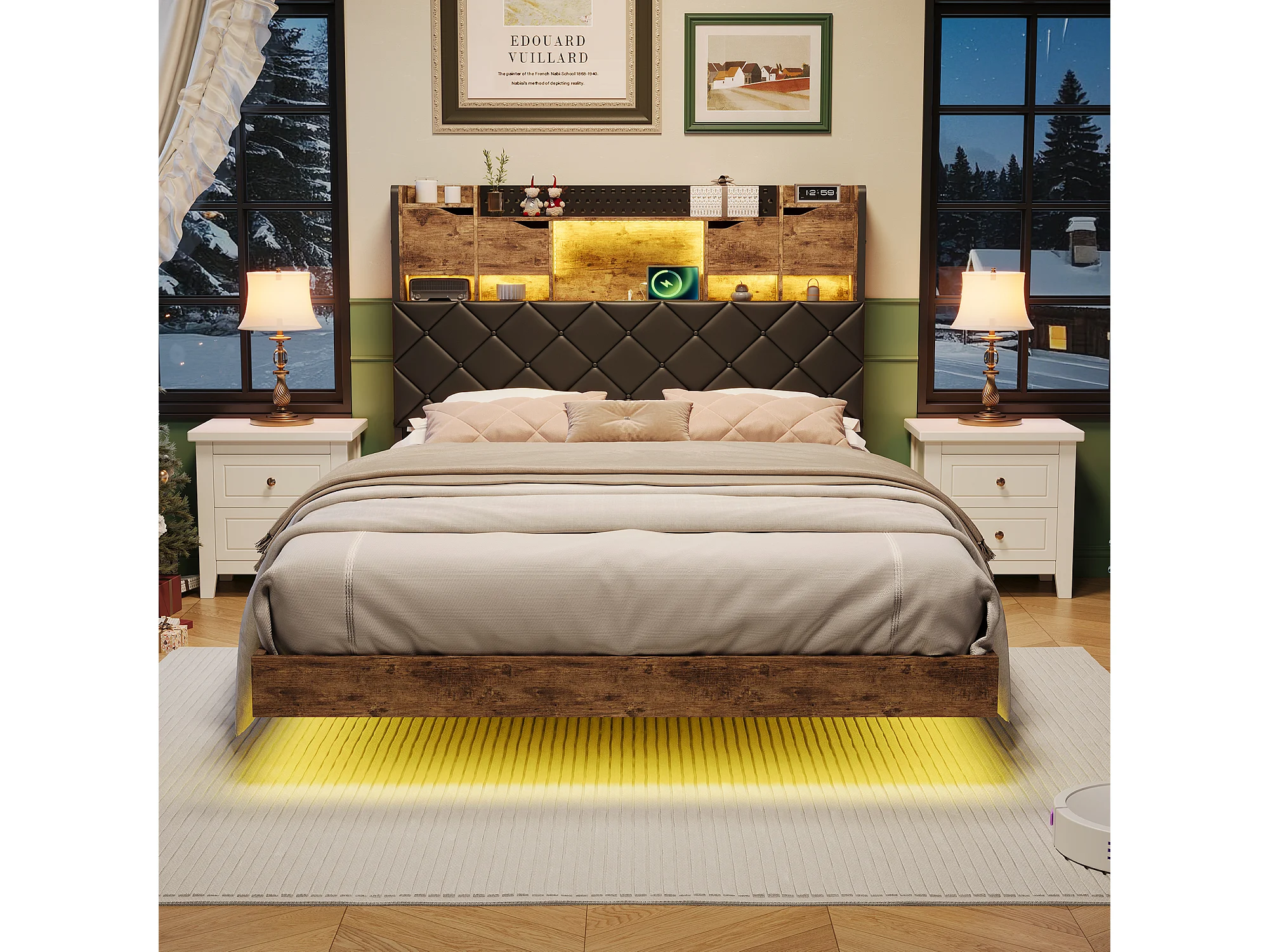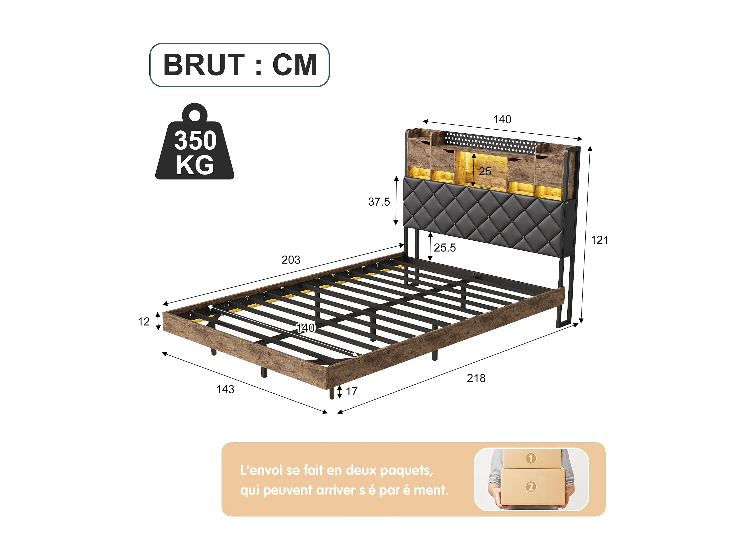 Cadre de lit en fer métallique - lit flottant avec éclairage LED et station de charge USB - lit double rembourré avec tête de stockage - PU - 140x200cm