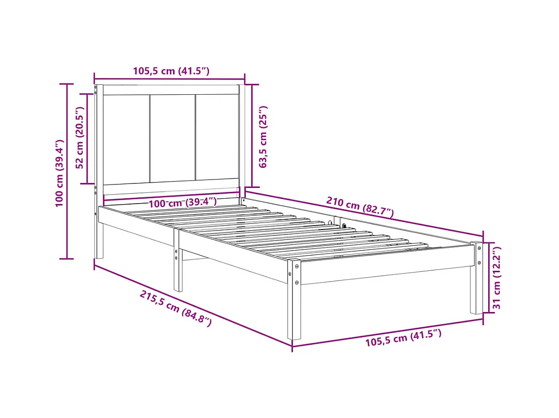 Cadre de lit extra long sans matelas 100x210 cm bois massif