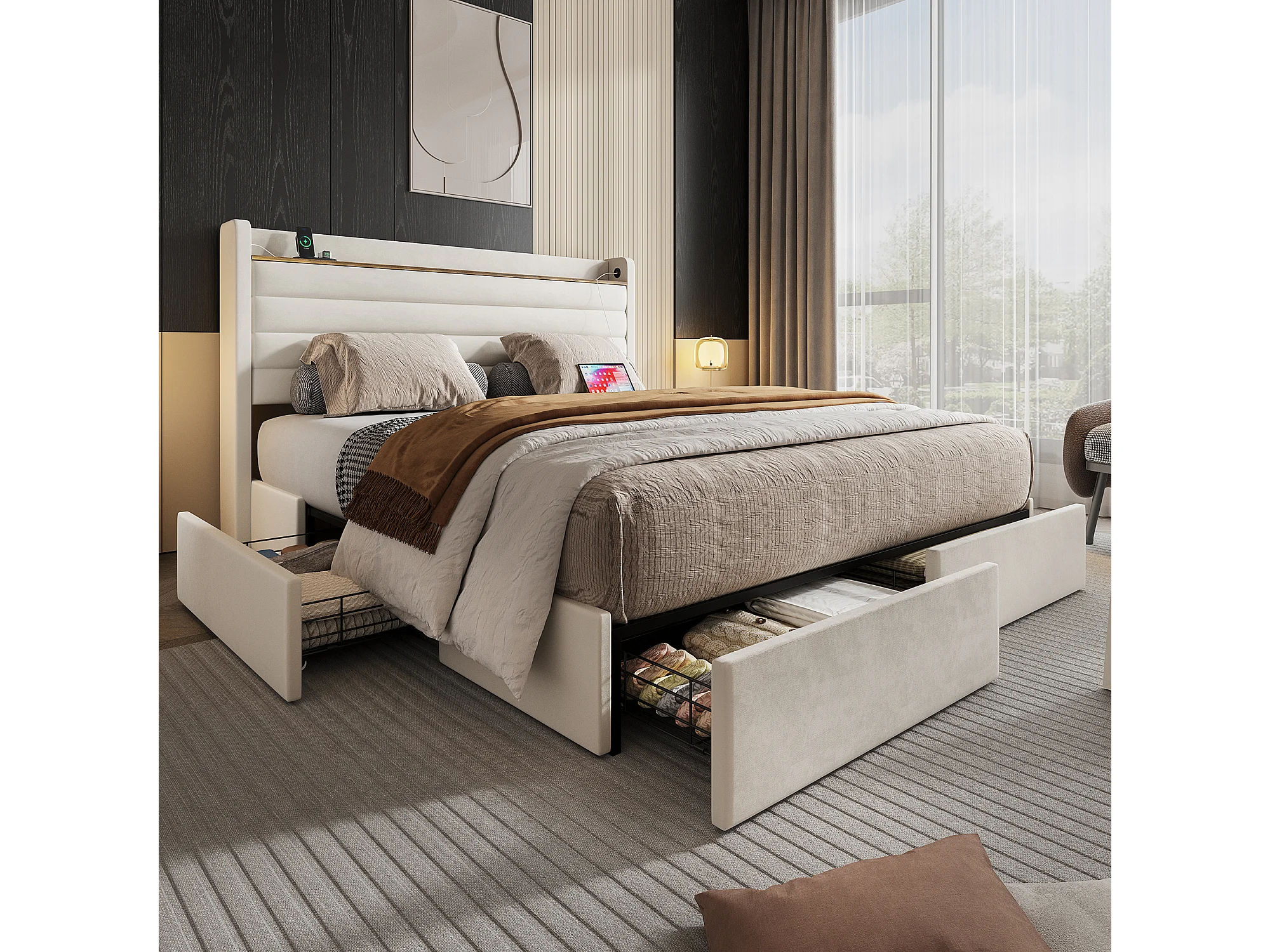 Cadre de lit moderne grand 160 x 200 cm (Beige) : rembourré en velours, tête de lit avec port USB et fonction de rangement, 4 tiroirs sous le gestell.