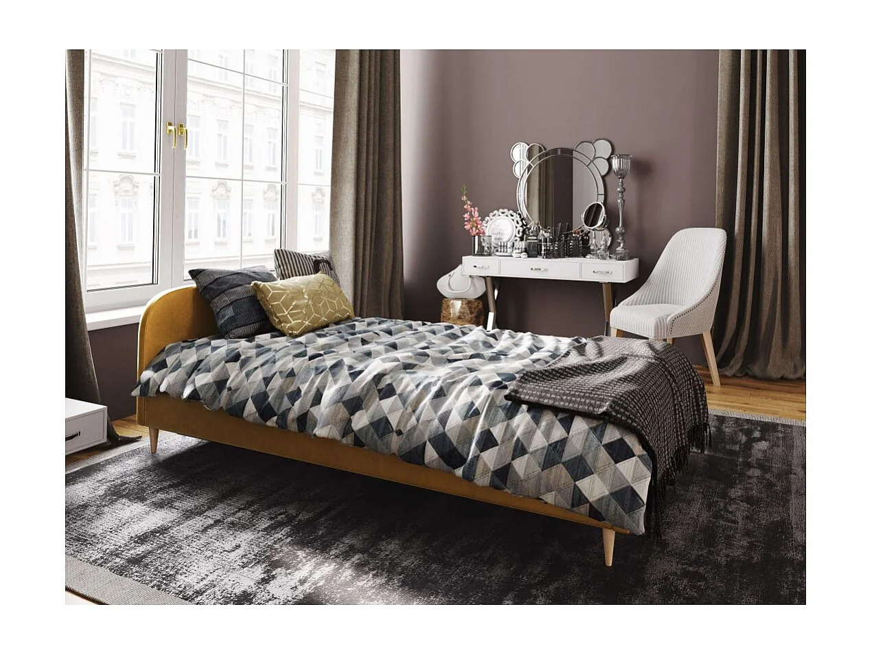 Cadre de lit TALI avec tête de lit et sommier à lattes en velours - Jaune - Dimensions du couchage : 160 x 200 cm