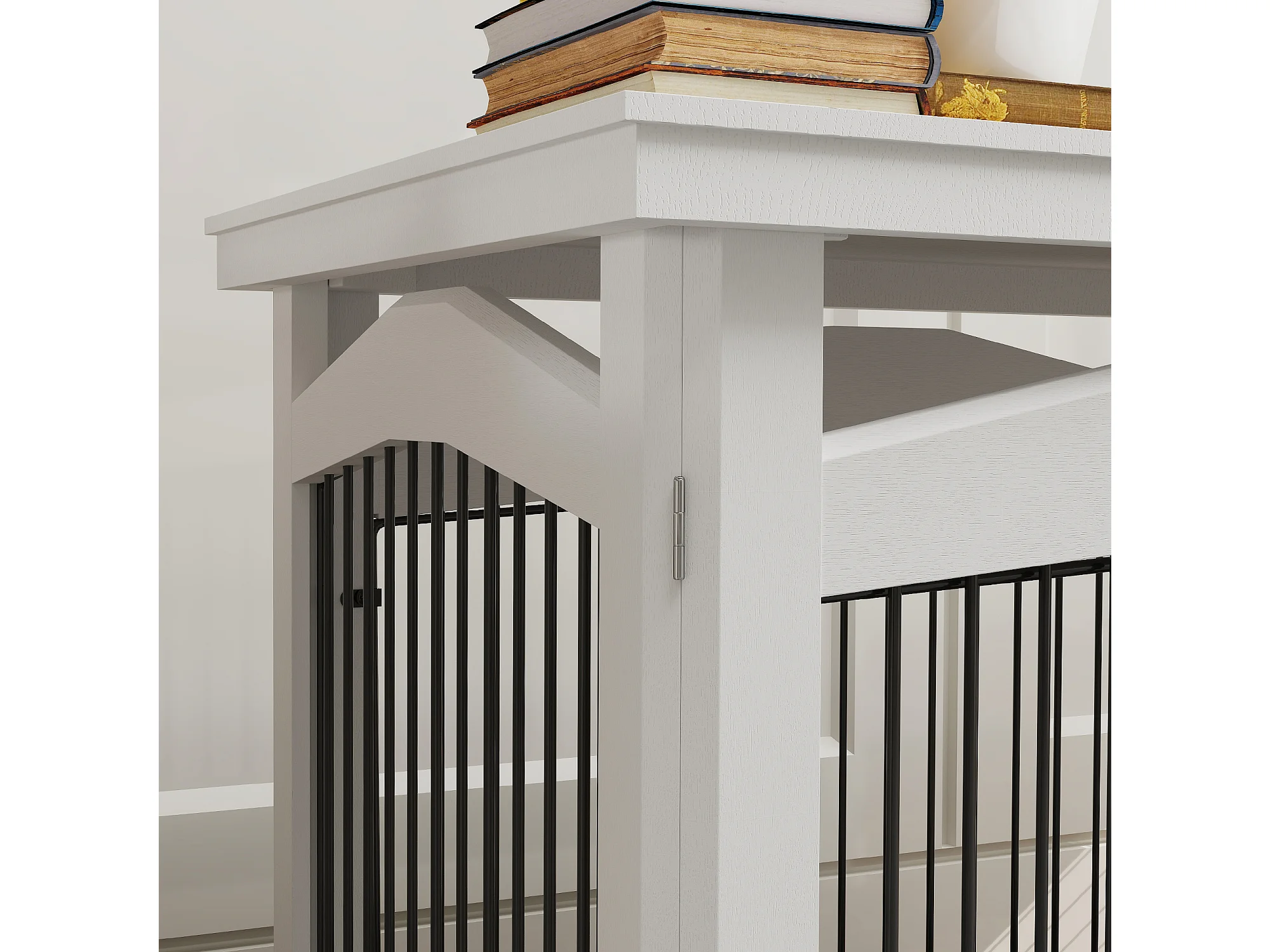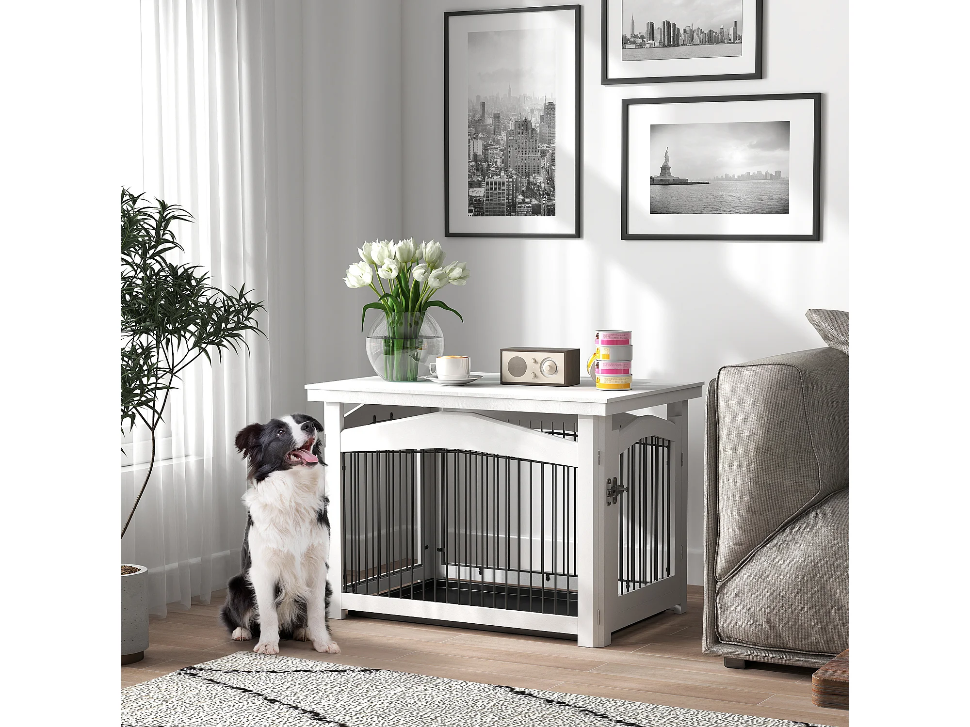 Cage barrière chien table basse d'appoint 3 en 1 plateau déjection amovible porte verrouillable acier MDF noir blanc