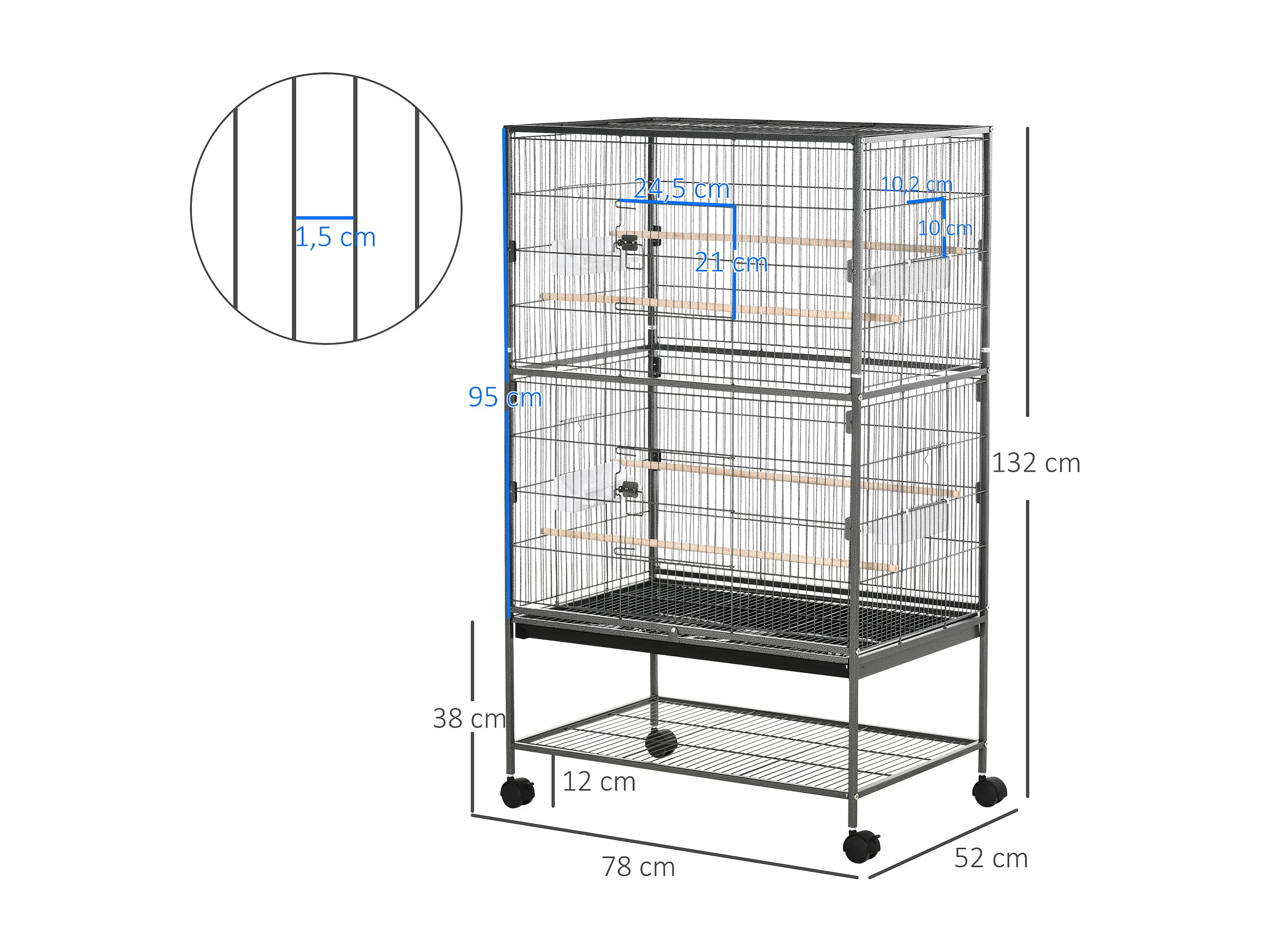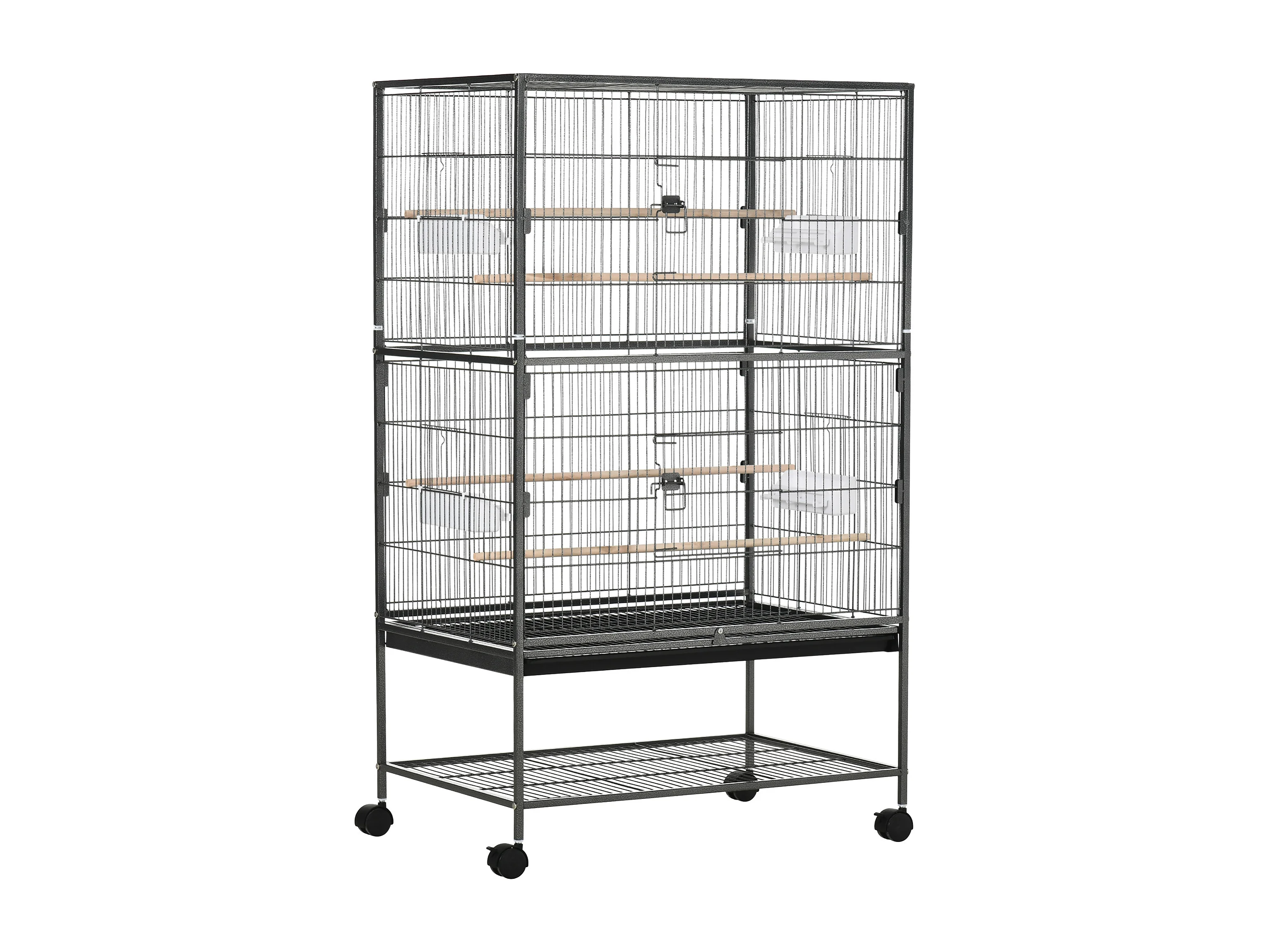 Cage oiseau mobile dim. 78x52x132cm - 4 perchoirs, mangeoires, plateau déjection, étagère - acier époxy gris moucheté