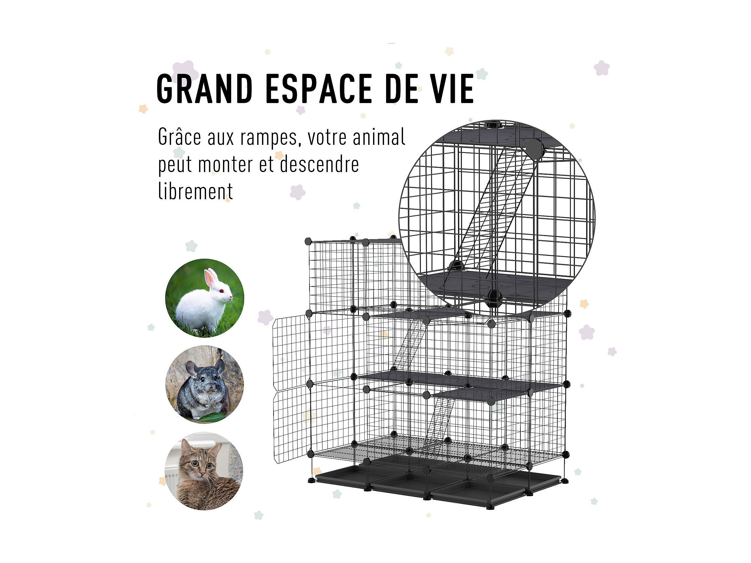 Cage parc enclos rongeurs modulable dim. L 105 x l 105 x H 70 cm 2 niveaux 2 portes rampe résine PP fil métallique noir