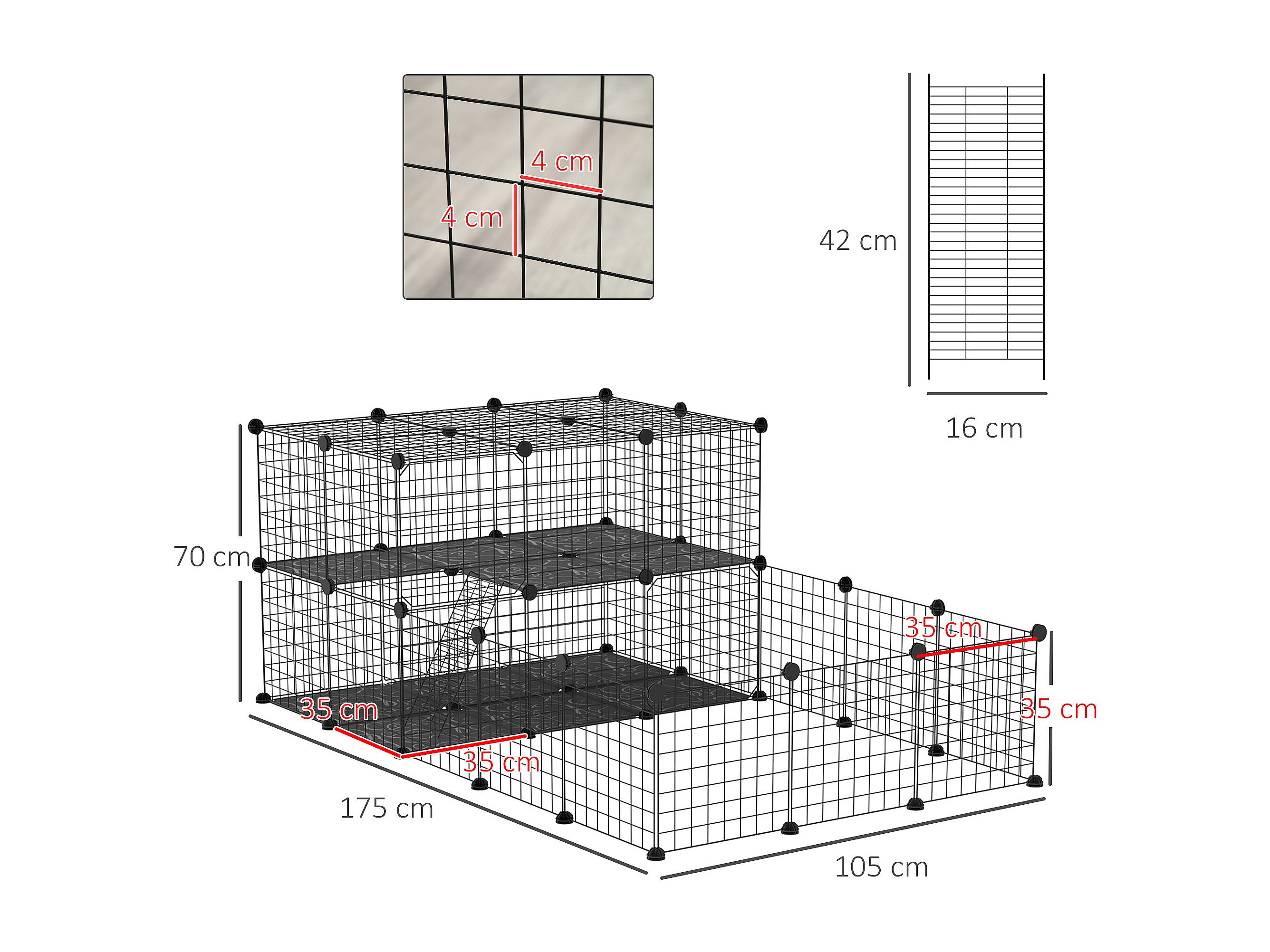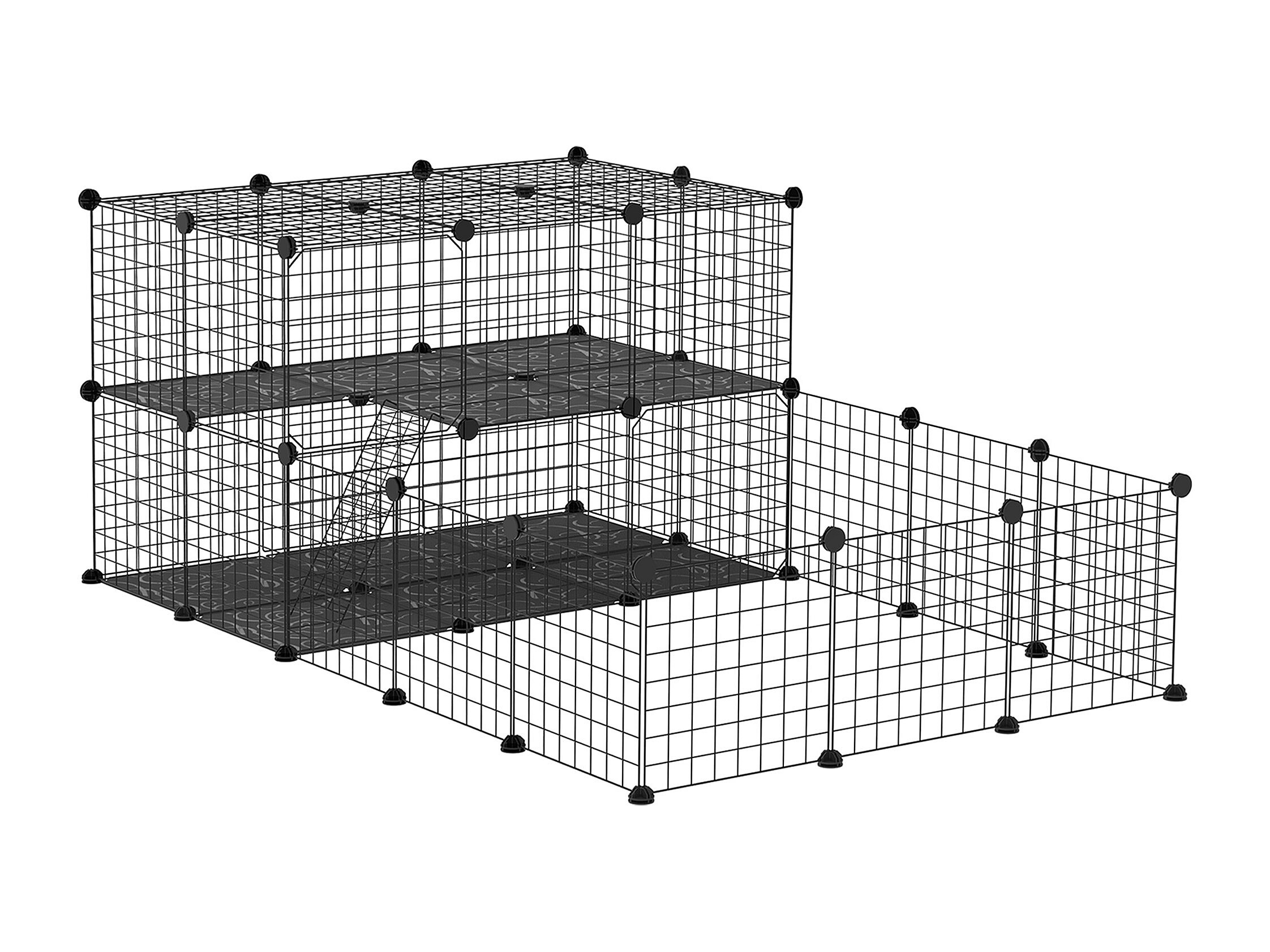 Cage parc enclos rongeurs modulable dim. L 175 x l 105 x H 70 cm 2 niveaux 2 portes rampe résine PP fil métallique noir