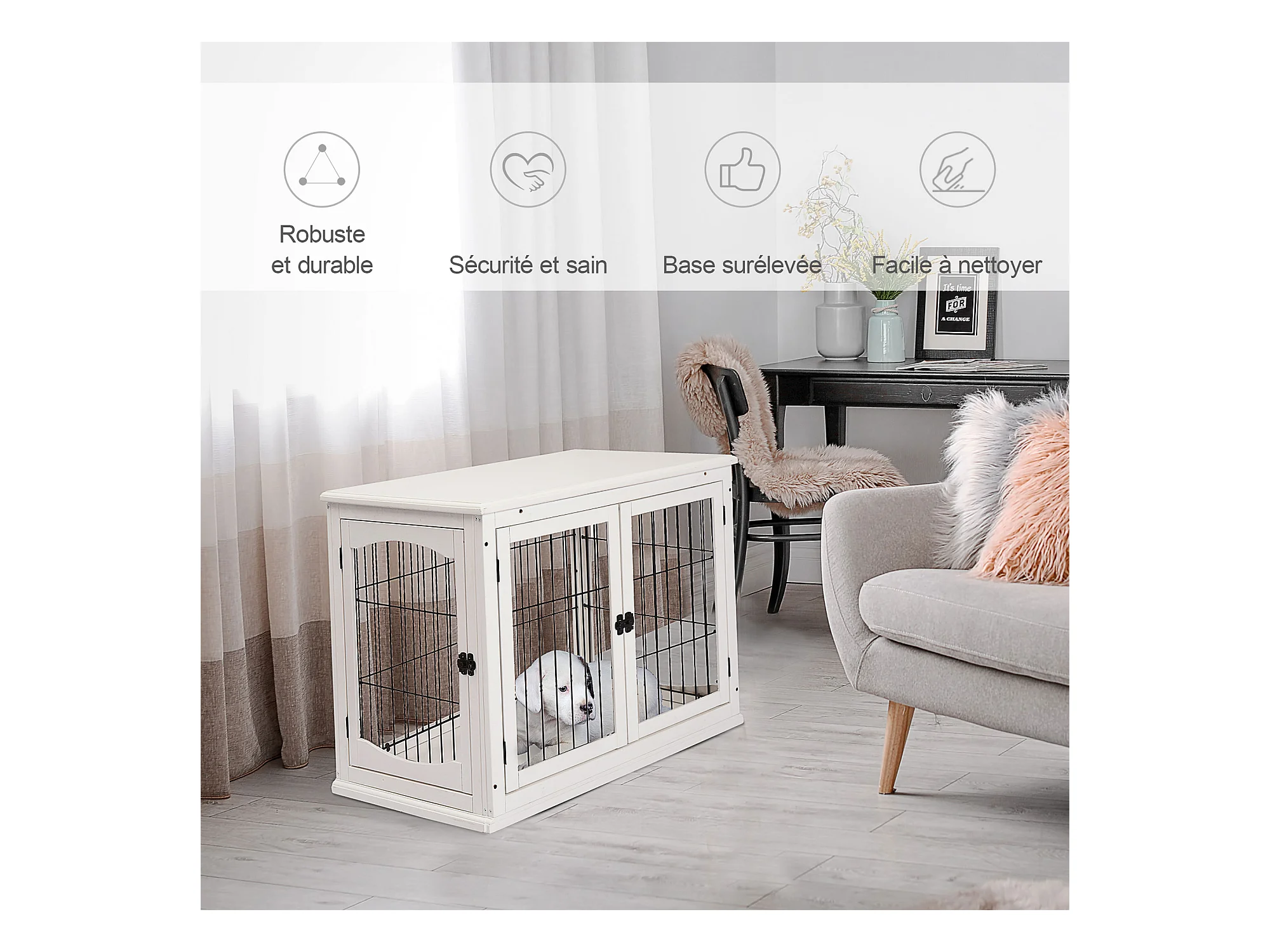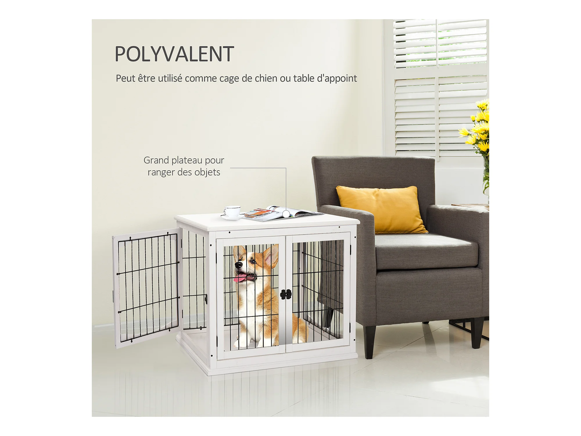 Cage pour chien animaux table d'appoint 2 en 1 - 2 portes verrouillables - dim. 76L x 54,5l x 56H cm - MDF acier blanc
