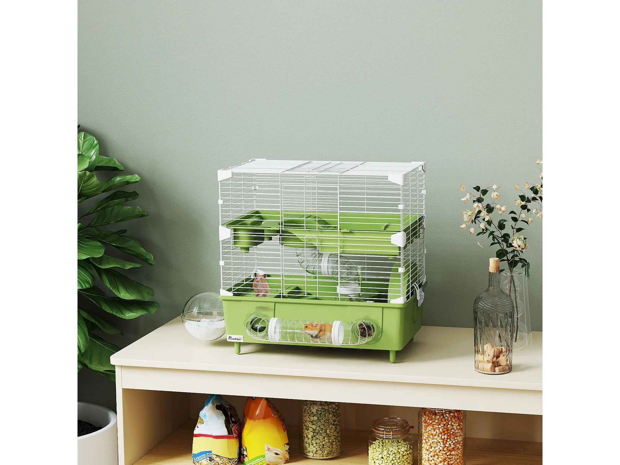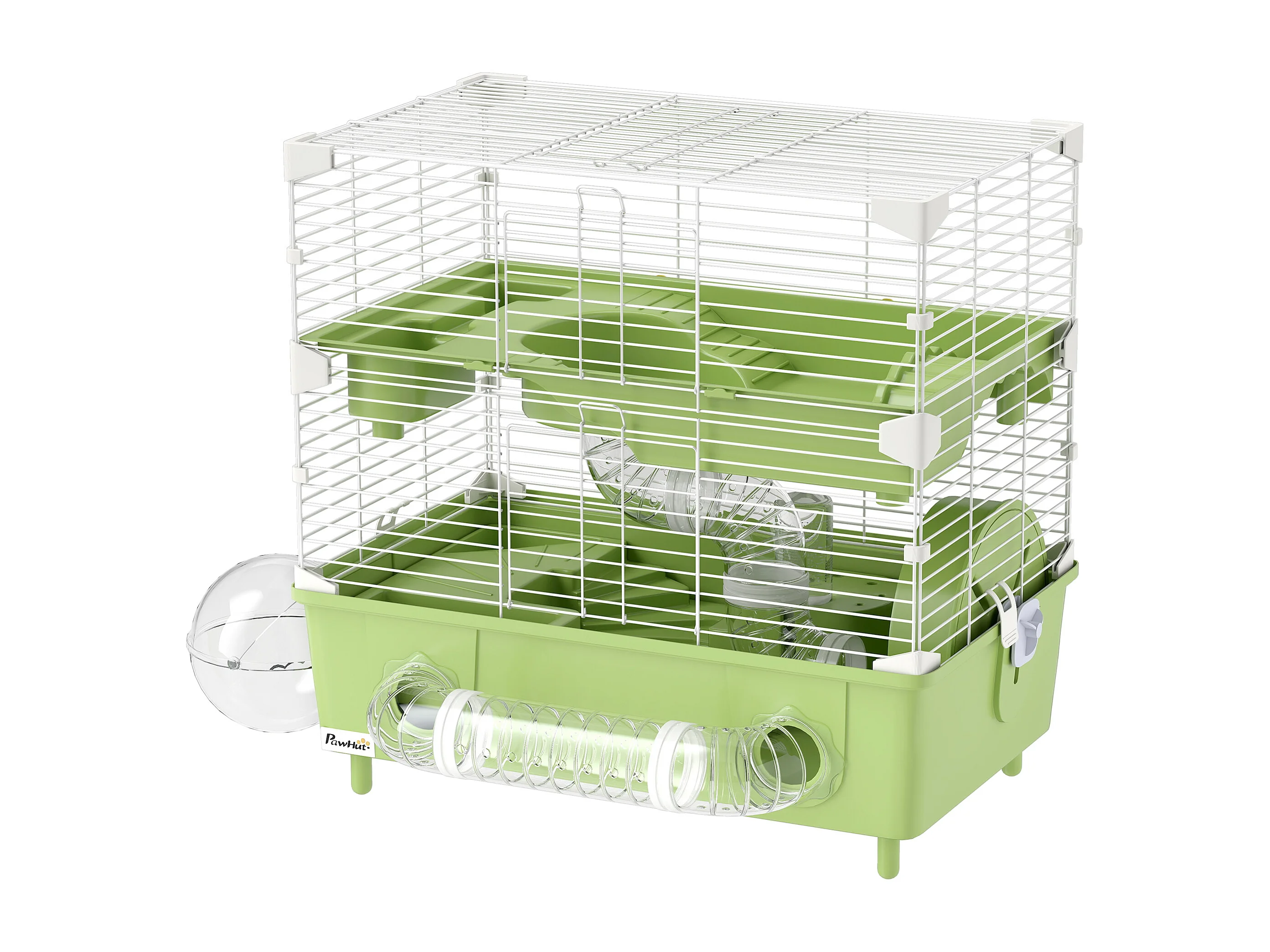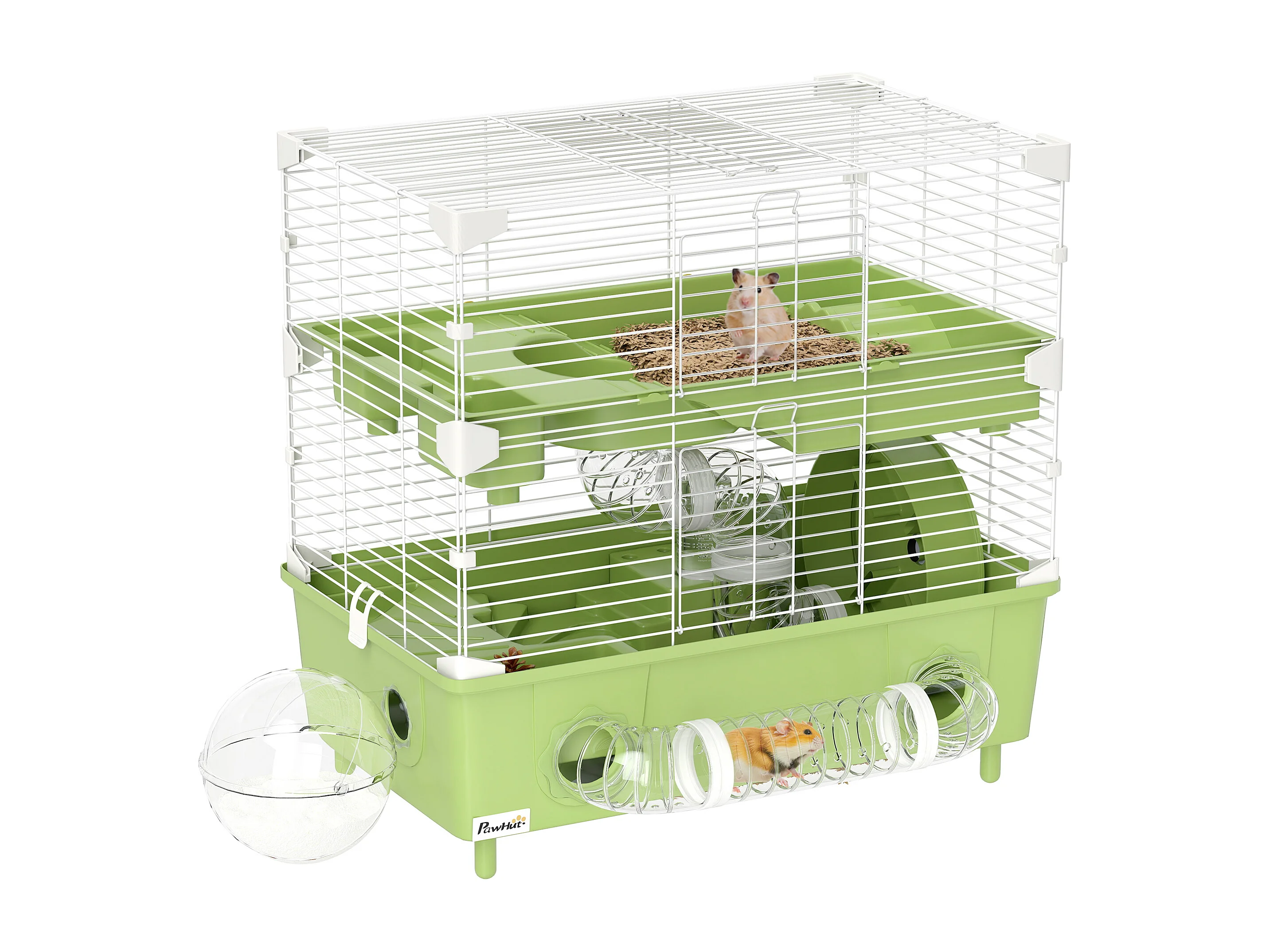 Cage pour hamster 2 niveaux roue sphère bac à sable tuyaux biberon eau dim. 44,5 x 28 x 44 cm blanc vert