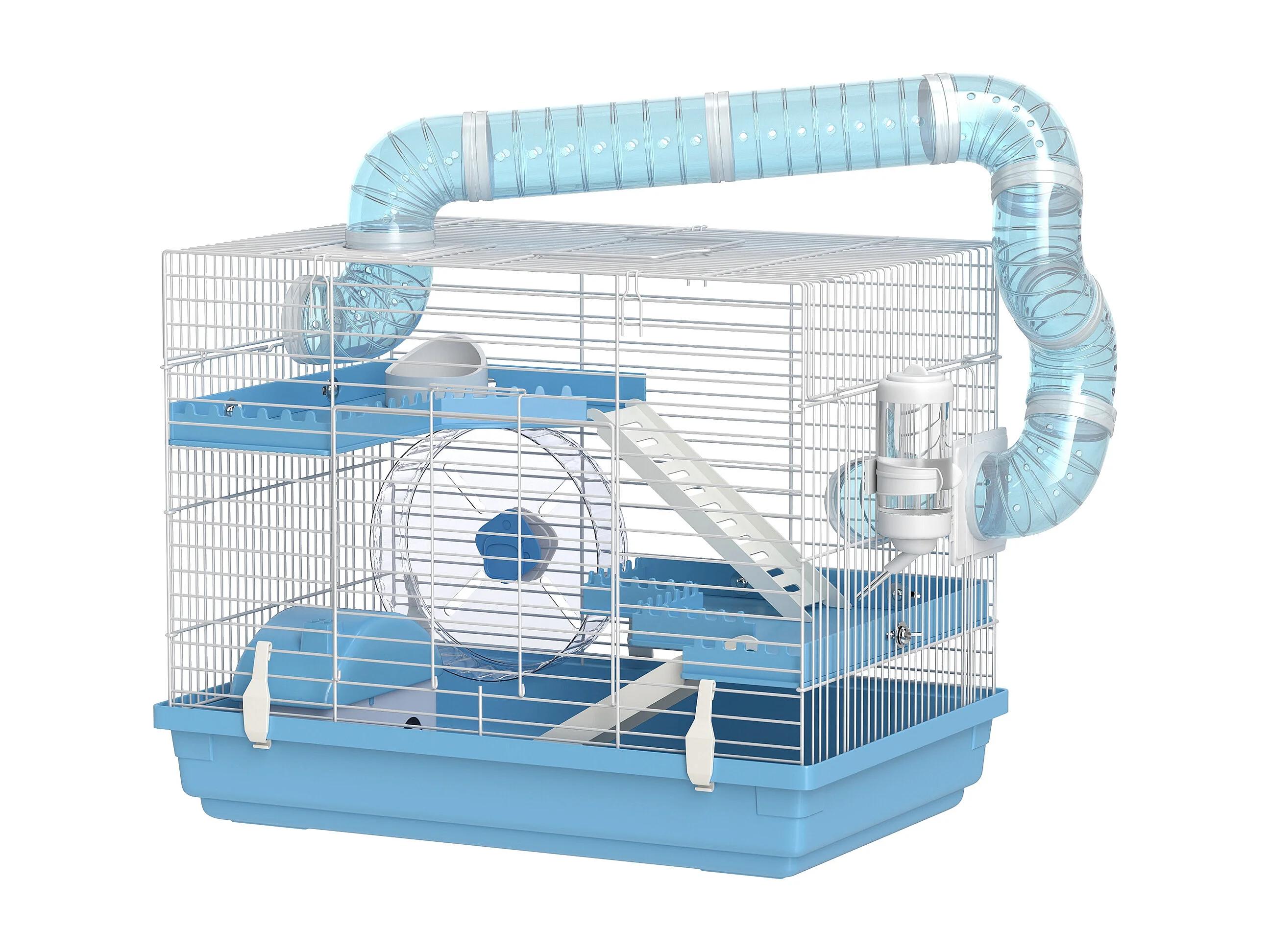 Cage pour hamster portable 2 portes 2 étages nombreux accessoires et tubes blanc bleu