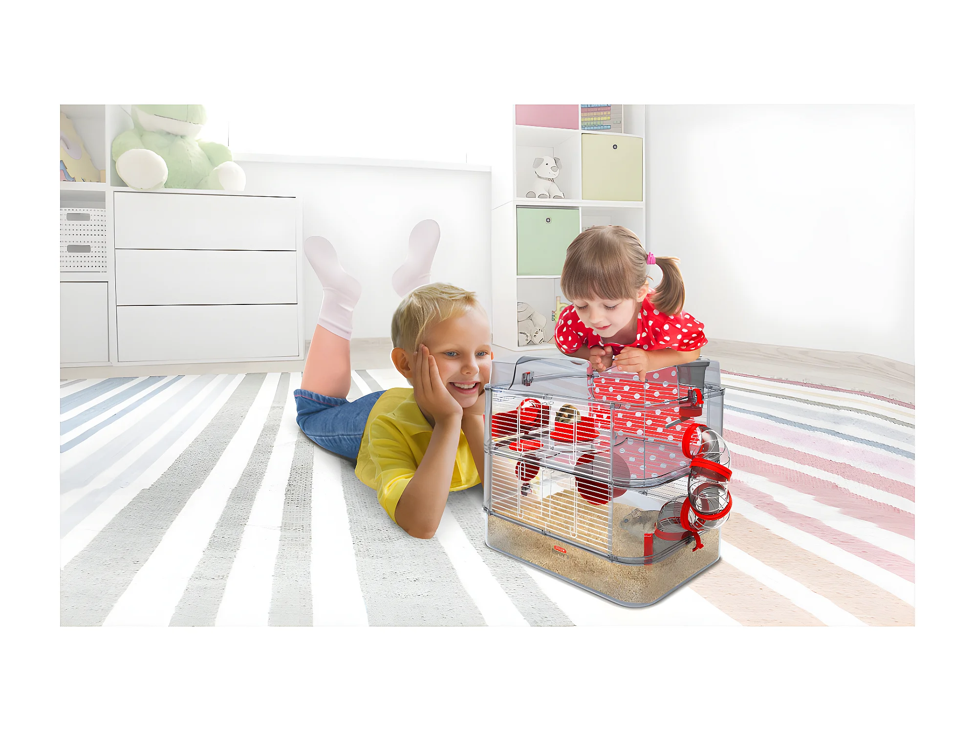 Maison de toilette pour chat style industriel porte entrée latérale boule suspendue châssis acier aspect bois clair