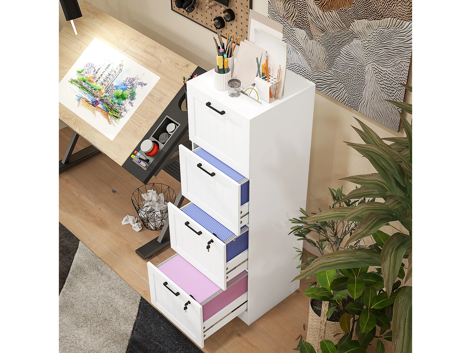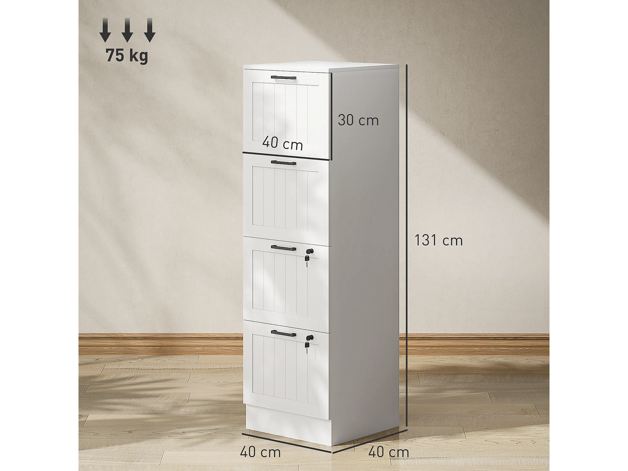 Caisson bureau 2+2 tiroirs verrouillables dossiers suspendus dim. 40x40x131cm MDF blanc