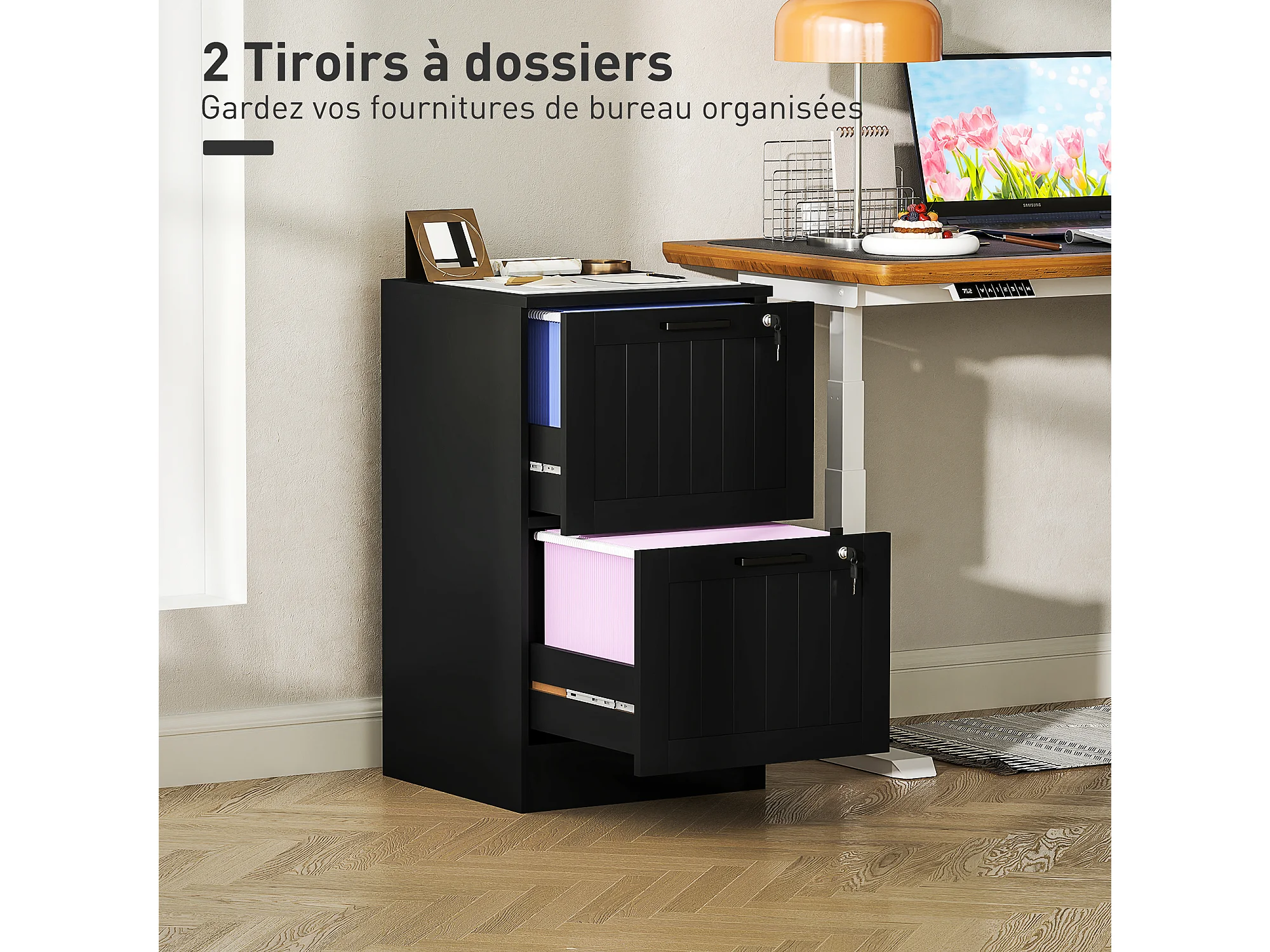 Caisson bureau 2 tiroirs verrouillables dossiers suspendus dim. 40x40x71cm MDF noir