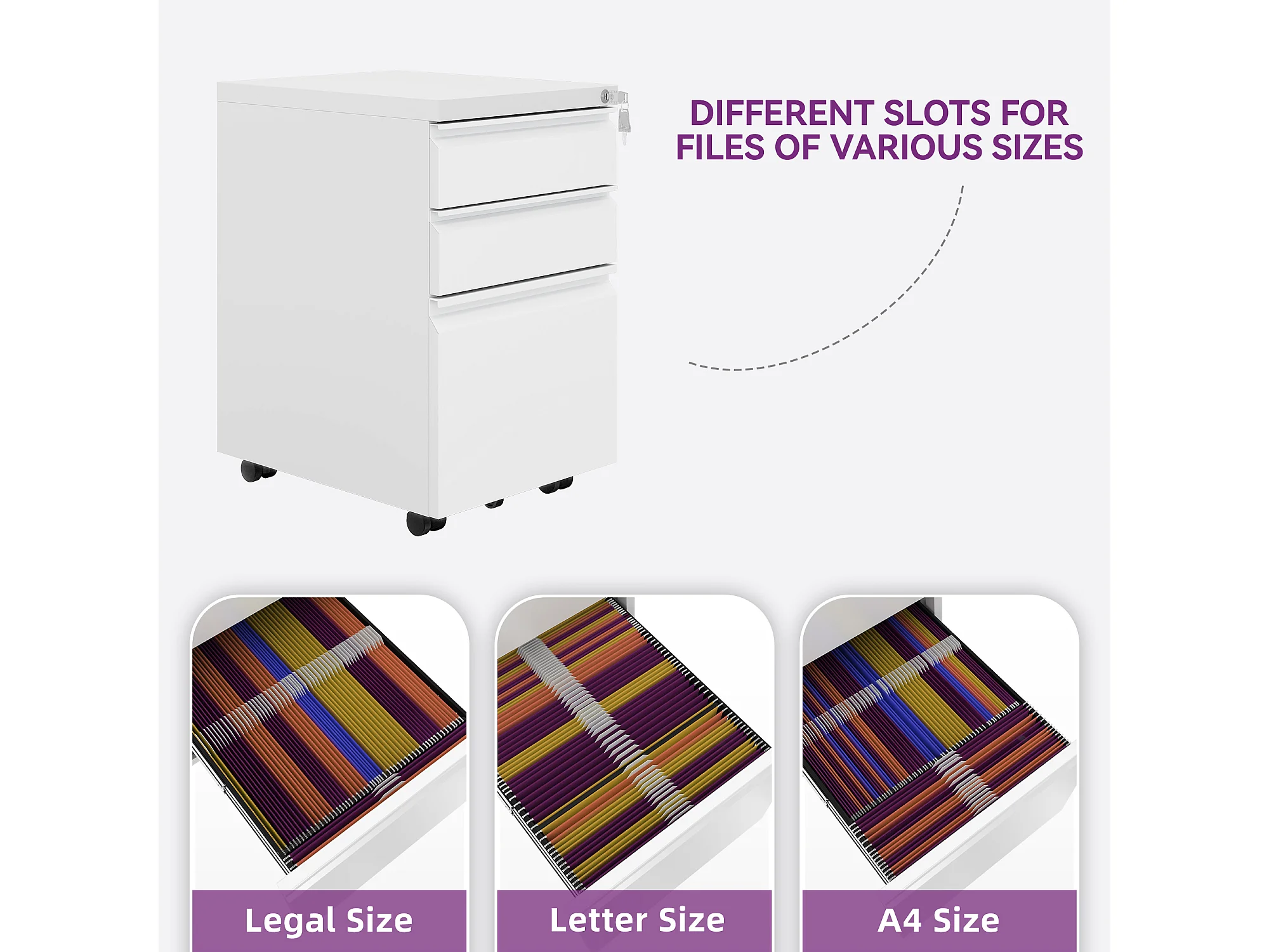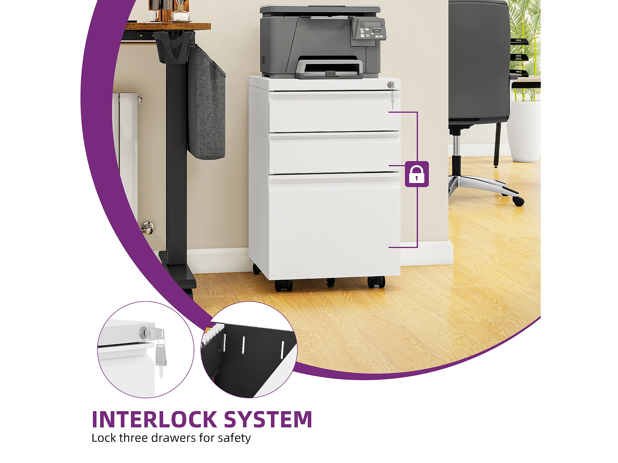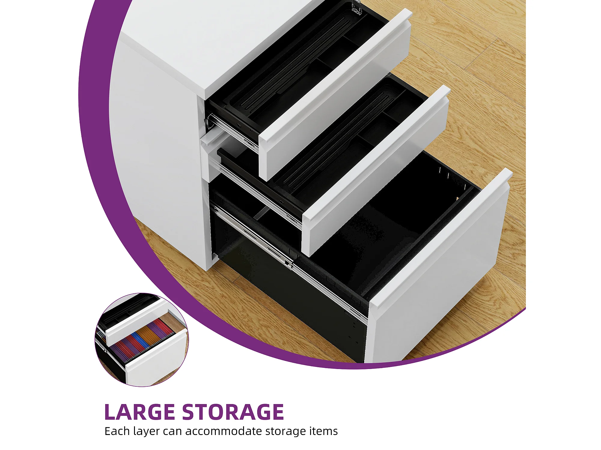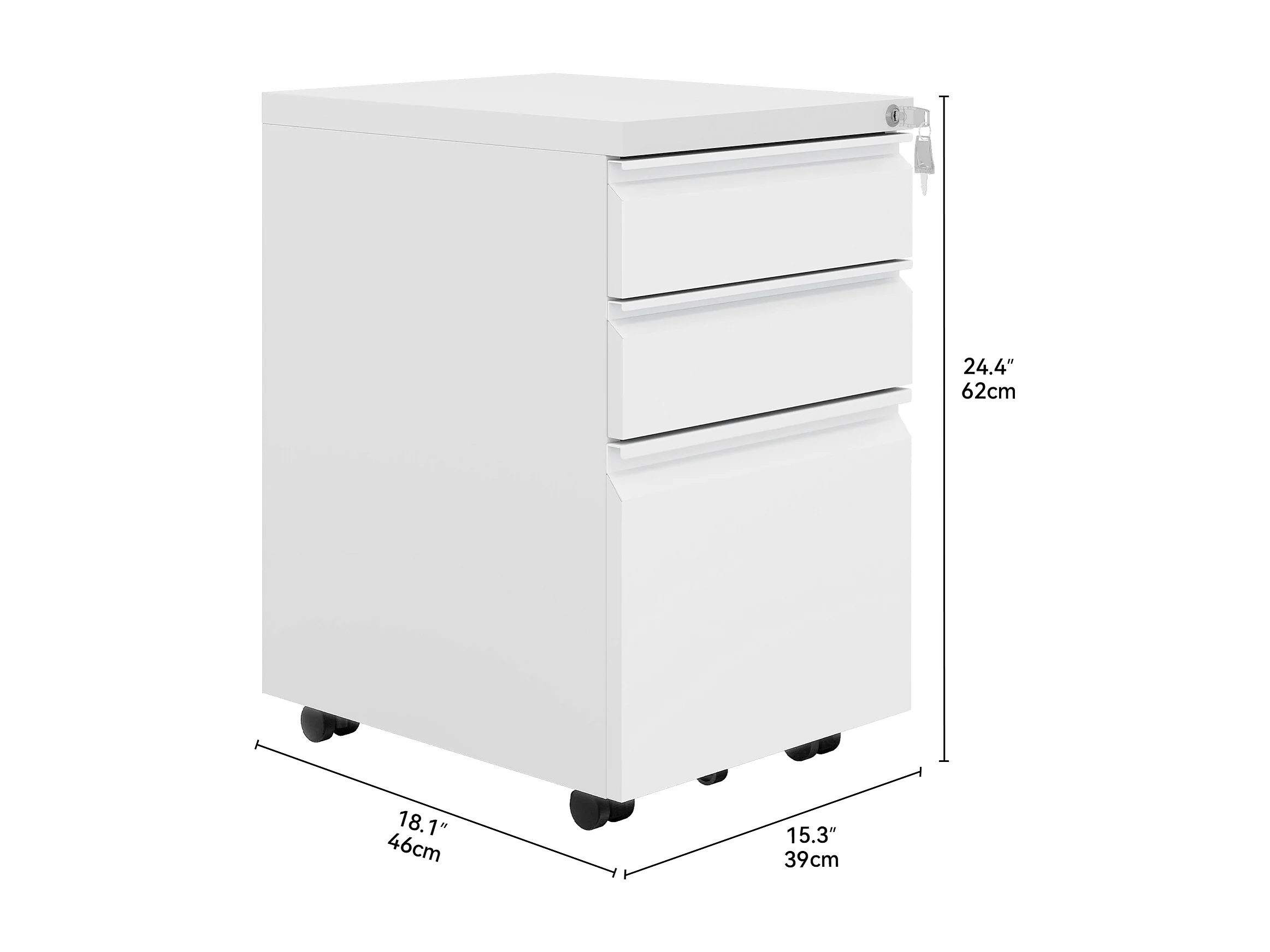 Caisson de Bureau - 3 Tiroirs Métal Caisson de Rangement - Meuble de Bureau avec roulettes pour Dossiers Suspendus - Blanc - 46 x 39 x 62cm