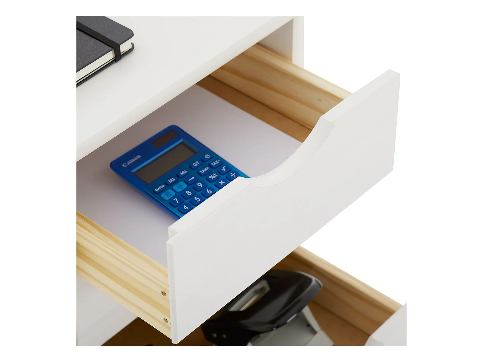 Caisson de bureau KANO, meuble de rangement sur roulettes avec 2 tiroirs et 1 niche, en pin massif lasuré blanc
