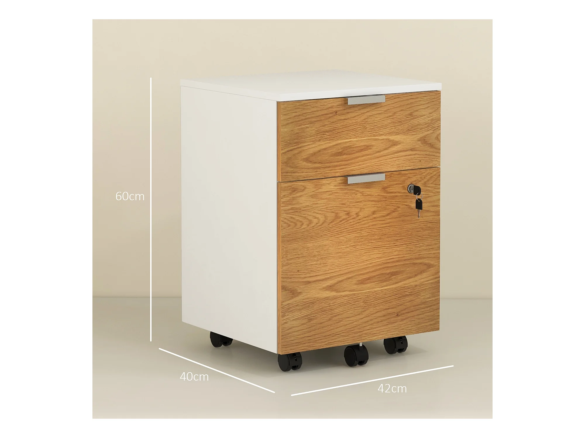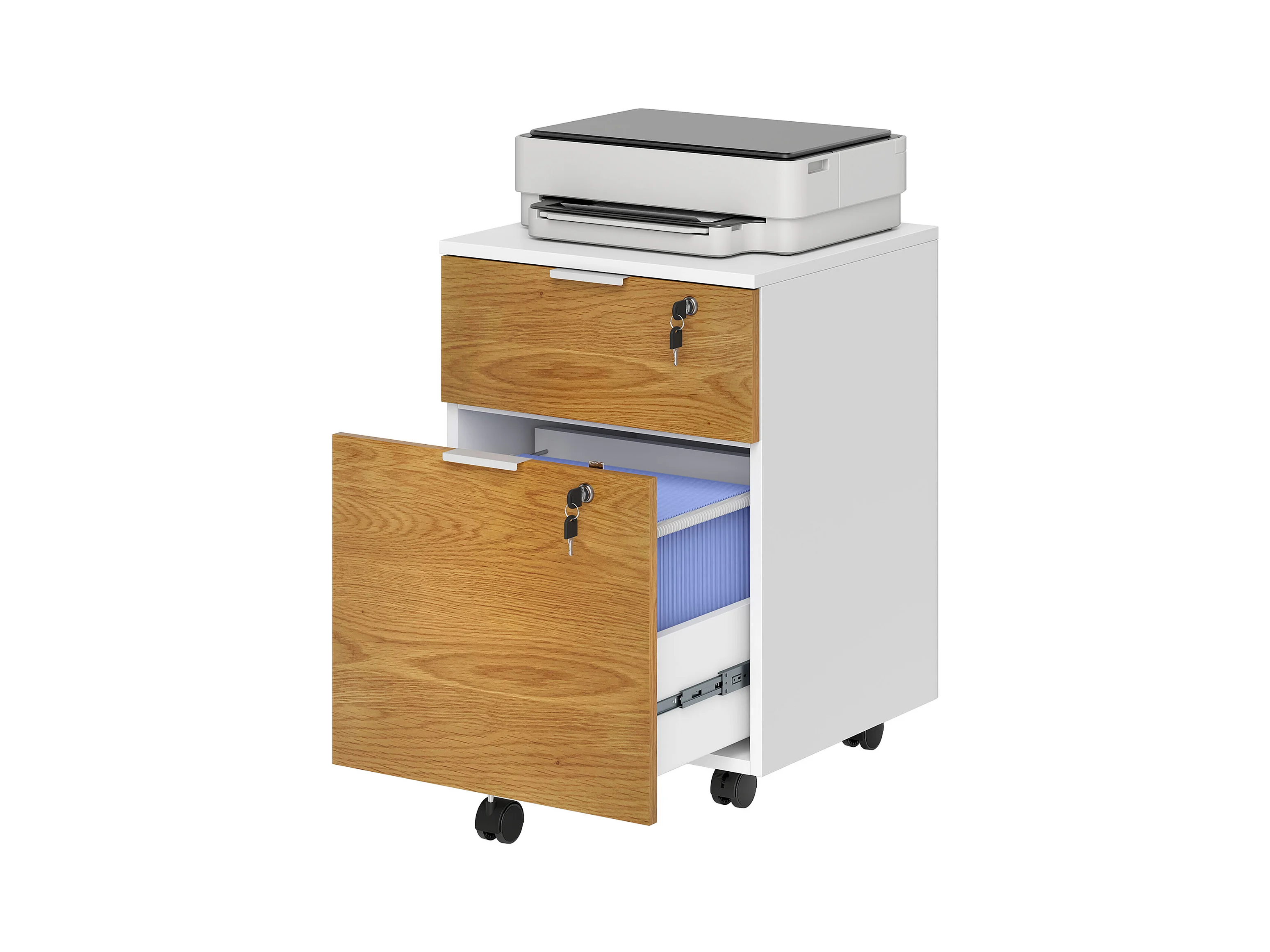 Caisson de bureau rangement bureau sur roulettes tiroir coulissant et tiroir dossiers suspendus blanc aspect chêne clair