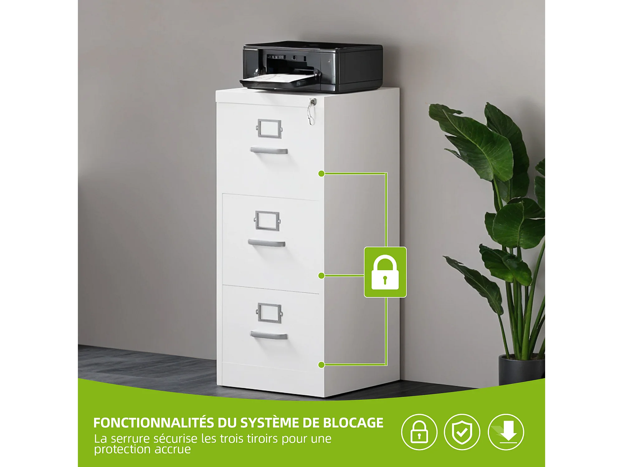 Caisson de classement à 3 tiroirs - verrouillable pour Format Lettre/légal/A4 - pour Bureau à Domicile - 3 tiroirs - Blanc