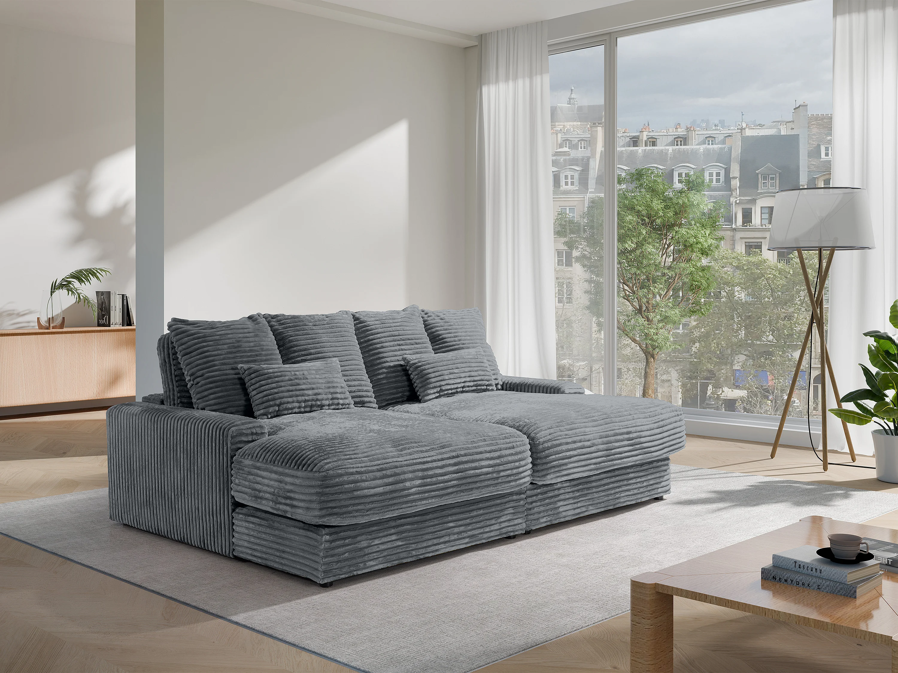 Canapé 3 places confort assise profonde en velours côtelé grosses côtes gris anthracite CALAZO de Pascal Morabito