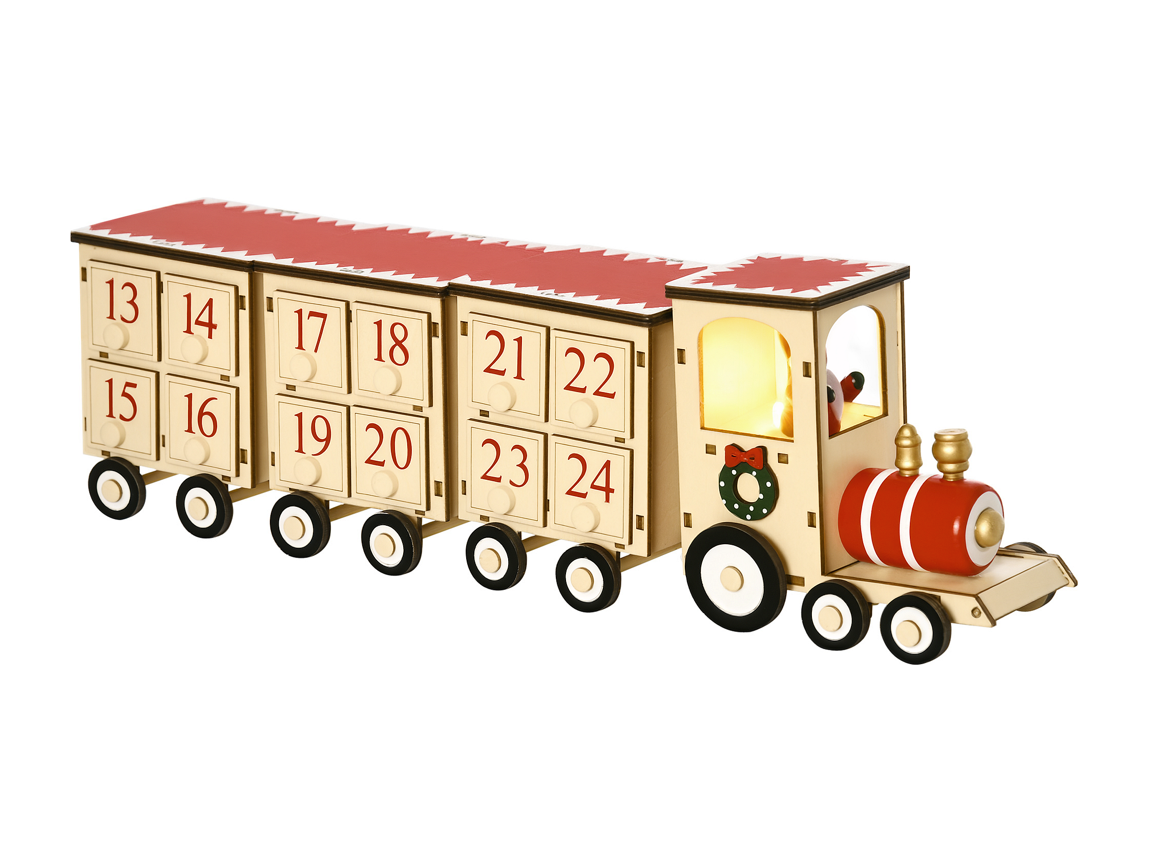 Calendrier de l'Avent LED train - lumière LED blanc chaud - 24 tiroirs - décoration lumineuse de Noël - contreplaqué beige rouge