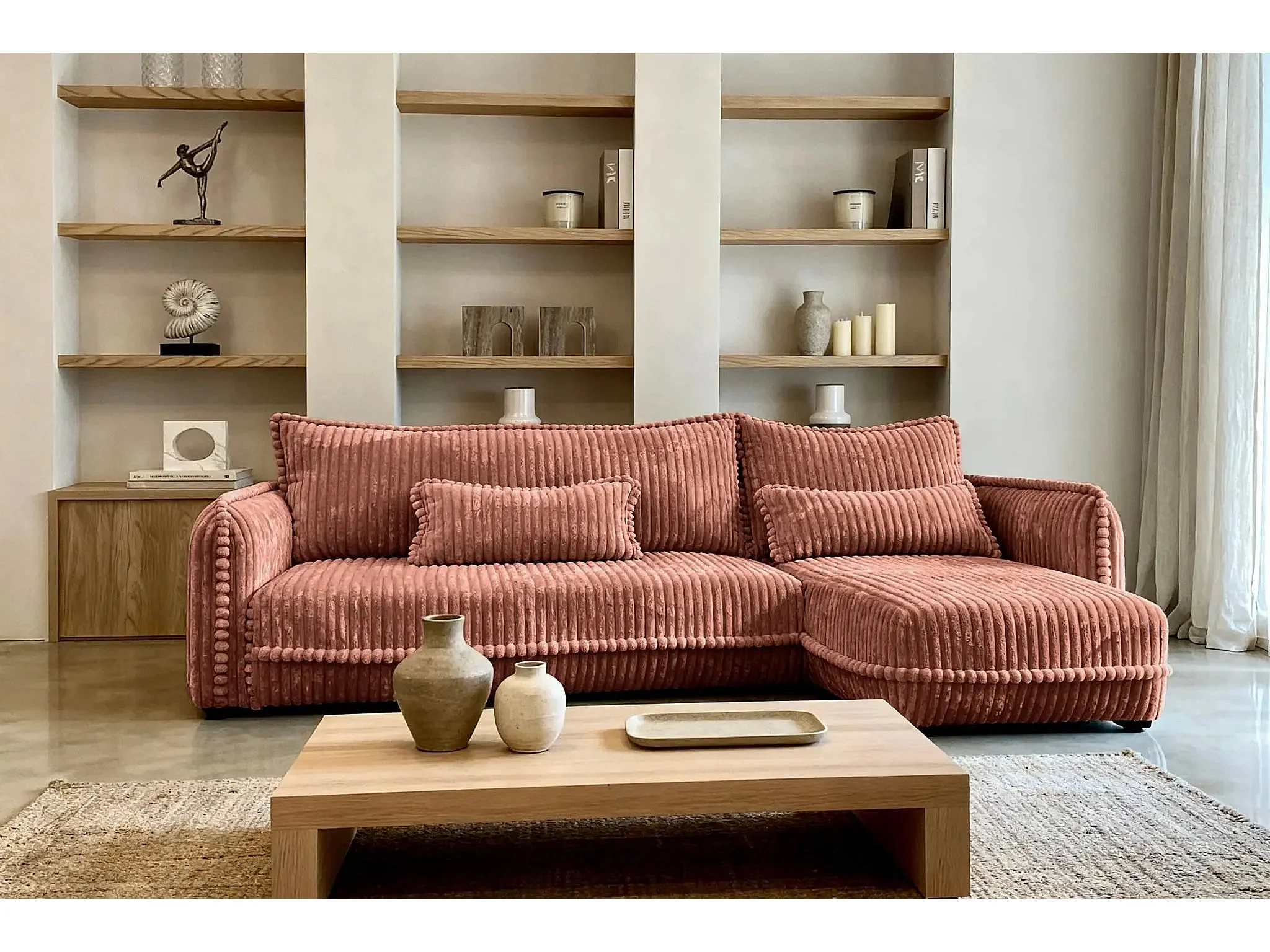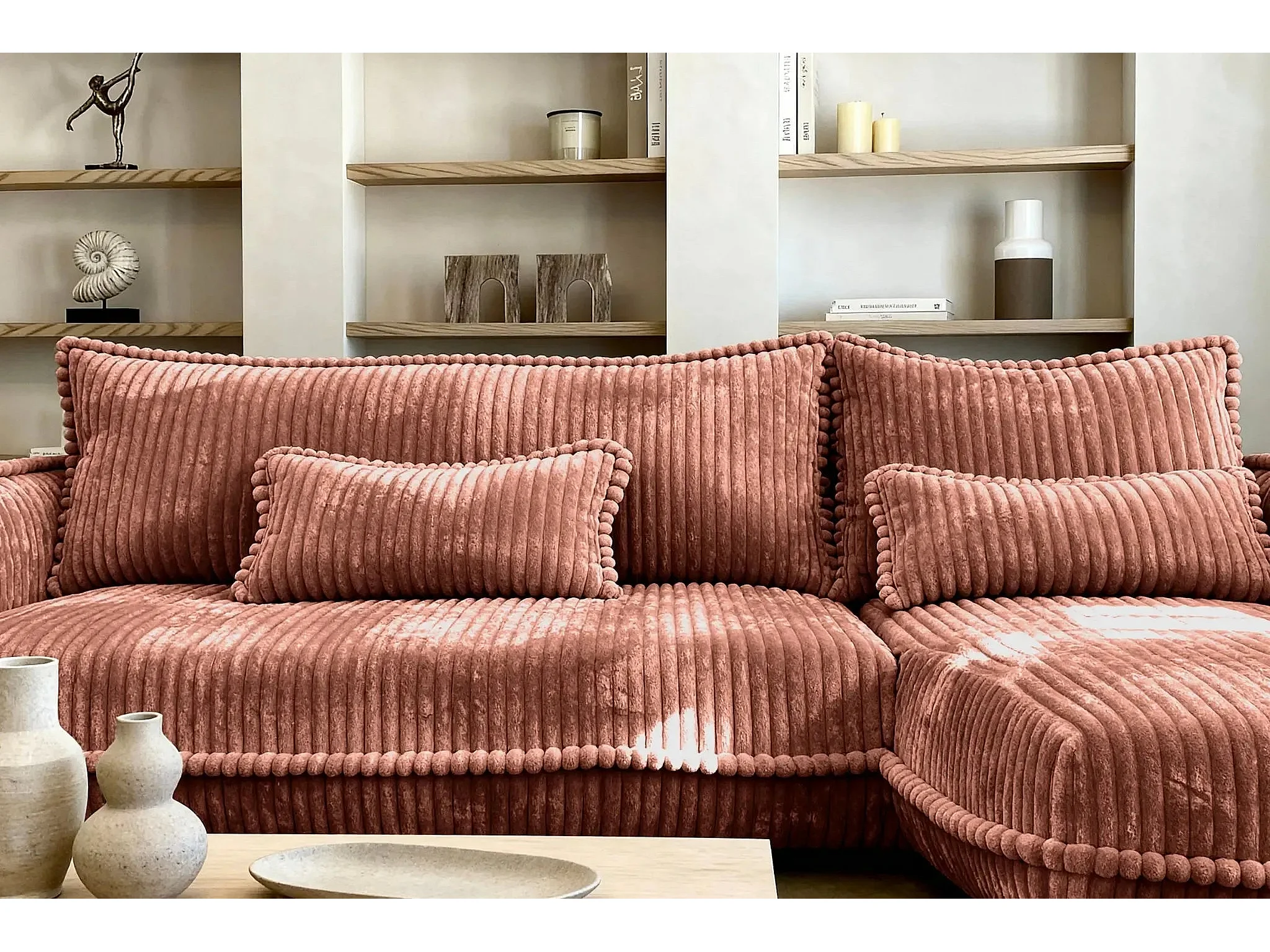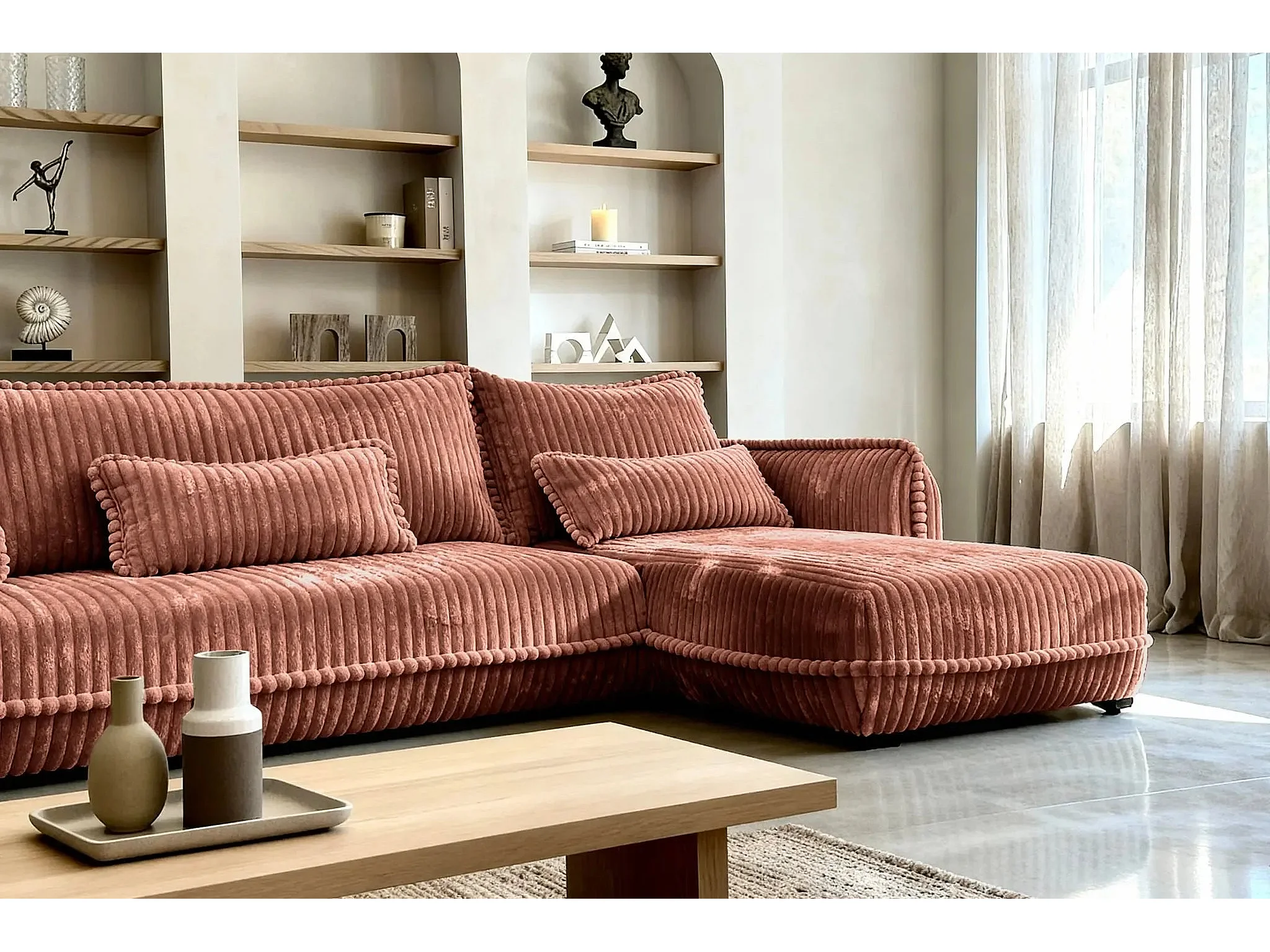 CALIE - Canapé d'angle velours côtelé 3 places - Terracotta - Gauche