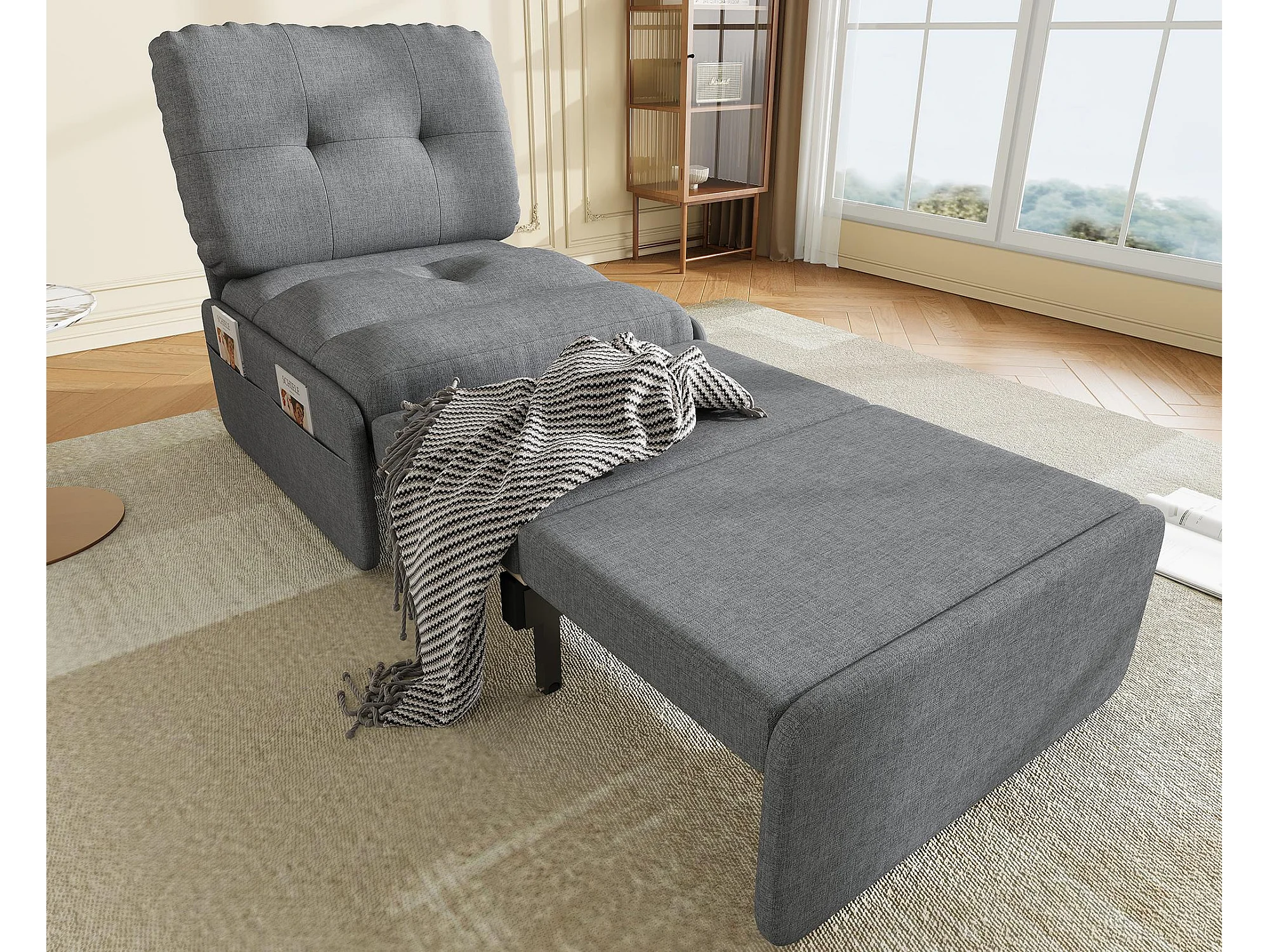 Canapé 1 place 2 en 1 - Canapé-lit, Fauteuil - Avec matelas dépliable - Sac de rangement - Structure en bois +Tissu lin - Gris