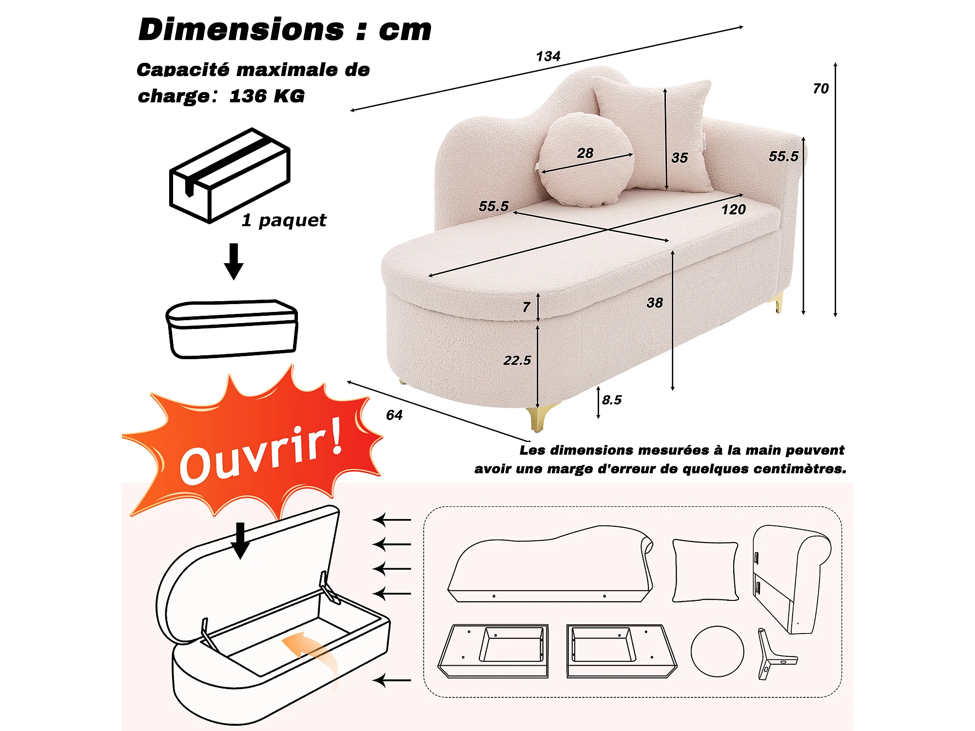 Canapé 1 place - Méridienne de rangement 134 cm - Dossier ondulé - Tissu polaire effet peluche - Coussin d'assise - Rose