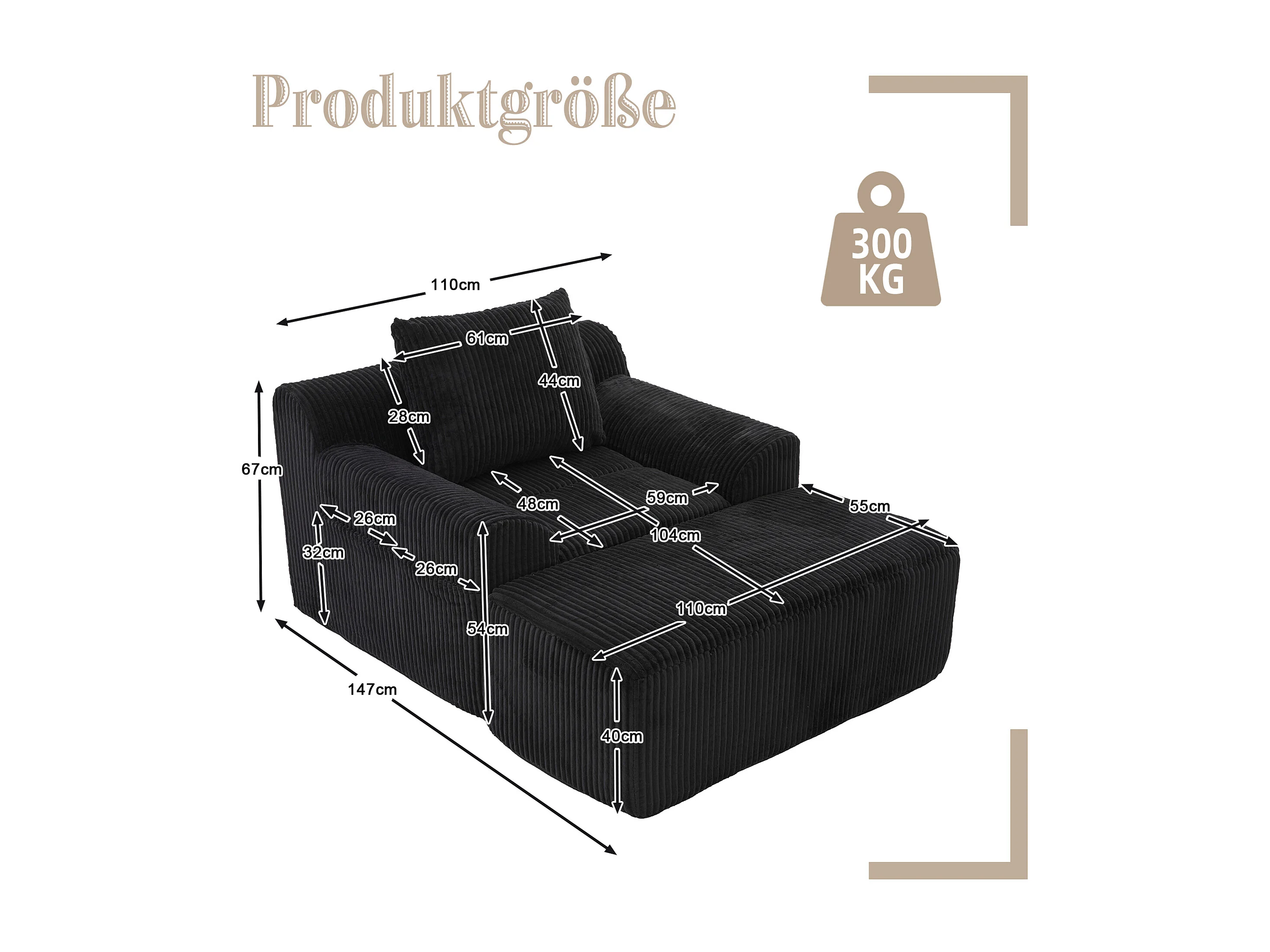 Canapé 147x110x67cm fauteuil design minimaliste support ergonomique velours côtelé pour salon noir